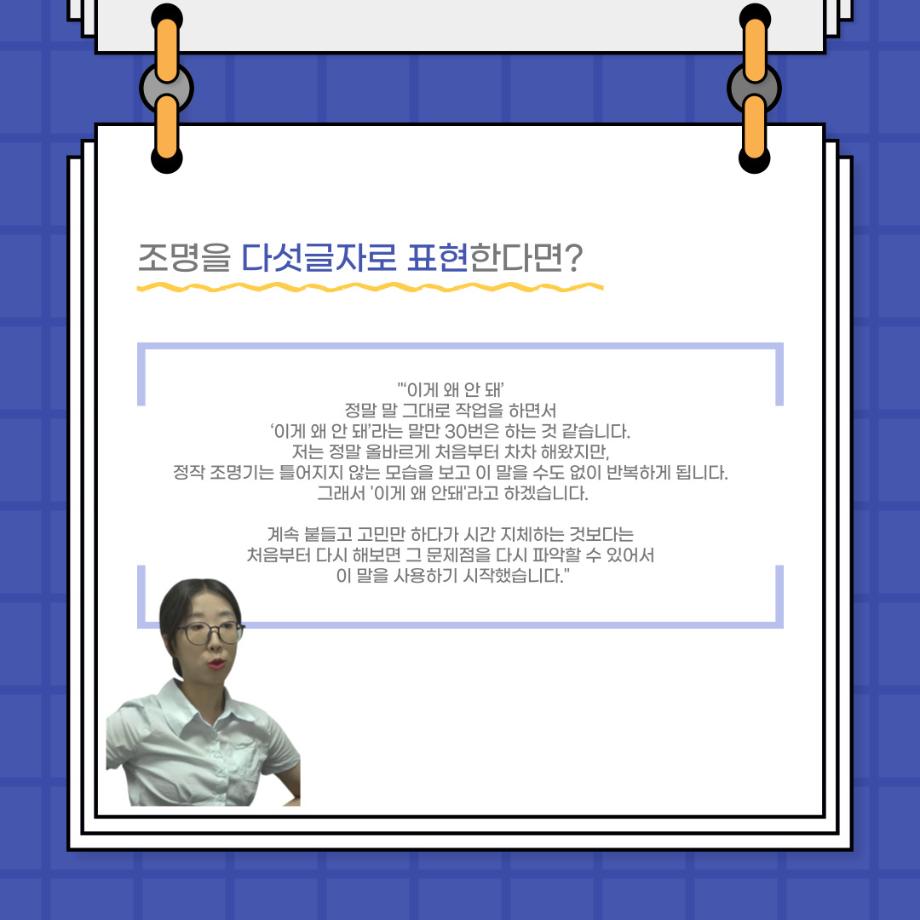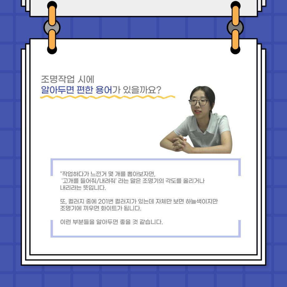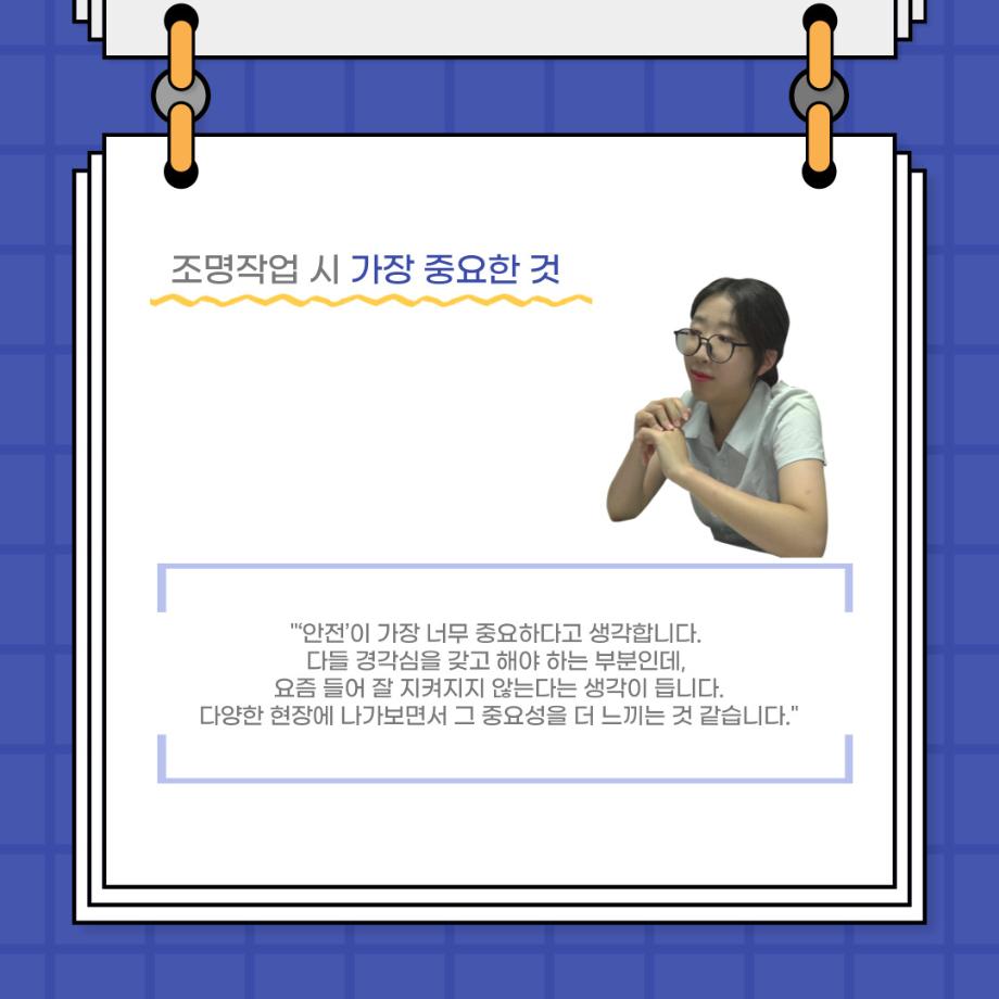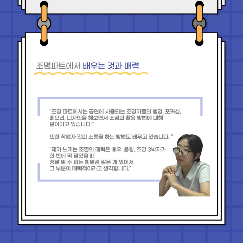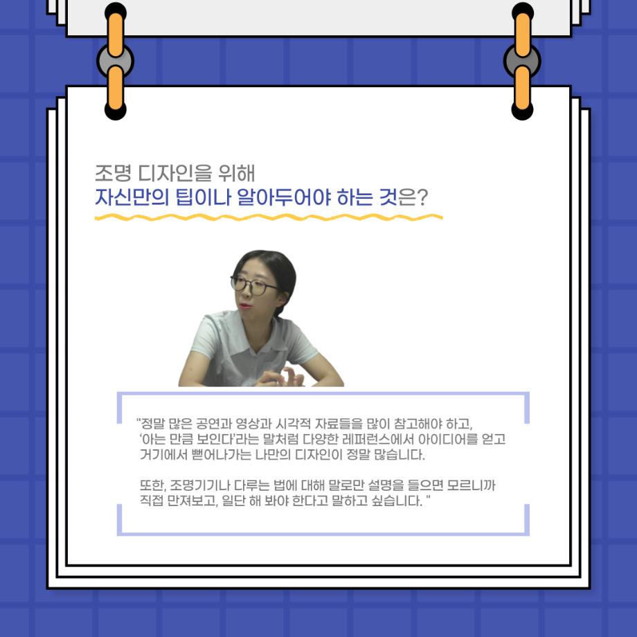 본문 시작 홈으로 커뮤니티 학과소개 입학정보 교수소개 학과과정 커뮤니티 공연예매 안내 홈페이지가이드 포토갤러리 공지사항 포토갤러리 작품DB 동아리 학사일정 학생회 포토갤러리 페이스북 트위터 프린트 사이와의 인터뷰 - 23년도 조명장 ‘김은경‘ 연기예술학과 3400 2023-07-10 안녕하십니까. 23년도 학회 ‘사이’입니다. 학회 ‘사이’의 두번째 인터뷰로 연기예술학과 23년도 조명장인 김은경 학생과 인터뷰하는 시간을 가졌습니다. 이번 인터뷰에서는 조명에 대한 매력과 조명 작업에서 가장 중요한 것, 조명 작업에서 알아두어야 하는 것 등에 대해 인터뷰하였습니다. 다음 인터뷰 컨텐츠 ‘사인’도 많은 사랑 부탁드립니다. 목록 이전2023학년도「전과자문단」운영 안내 다음 이지은 교수님 연출작품 <1923년생 조선인 최영우> 담당부서 : 연기예술학과 담당자 : - 연락처 : 043-649-1733 최종수정일 : 2024-10-26 만족도조사 만족도 조사 이 페이지에서 제공하는 정보에 대하여 만족하시나요? 매우만족 만족 보통 불만족 매우불만족