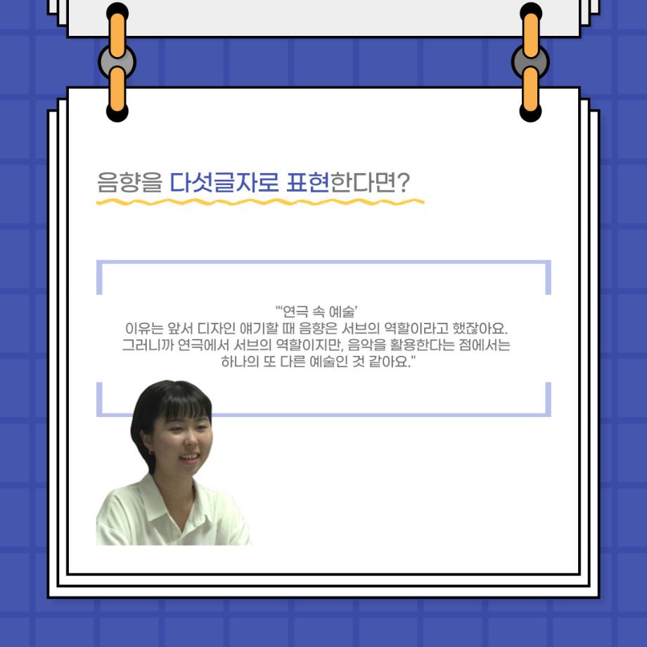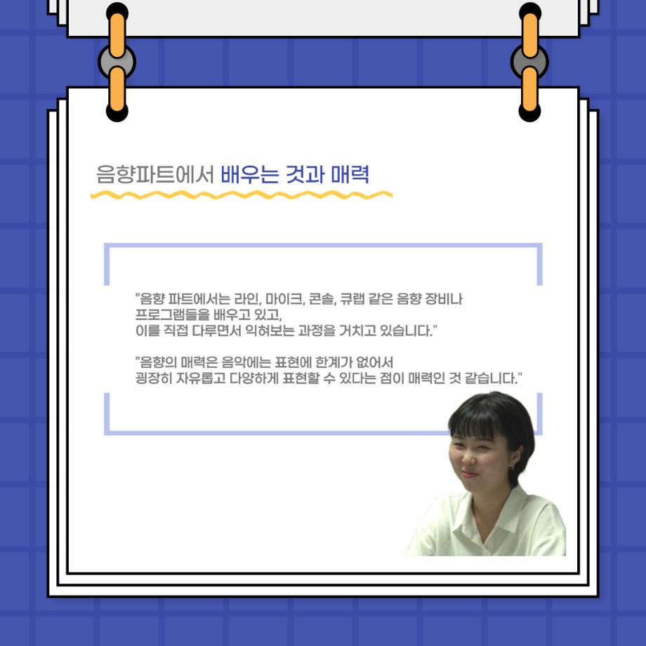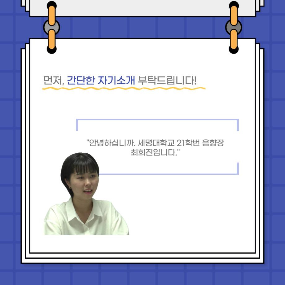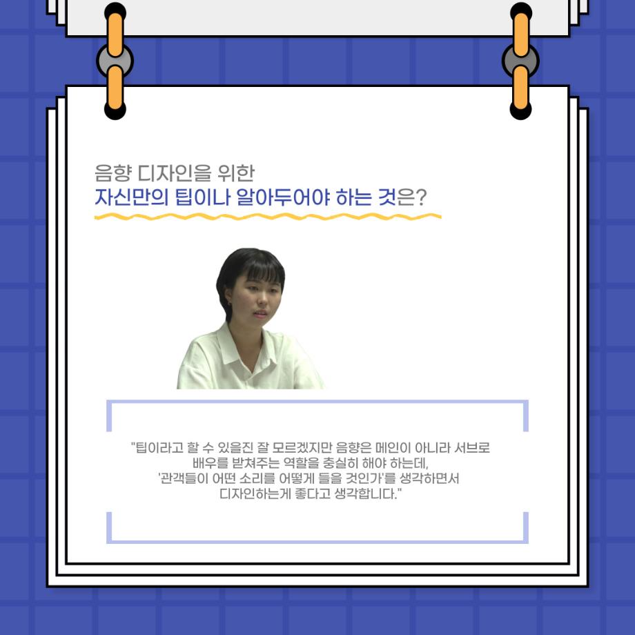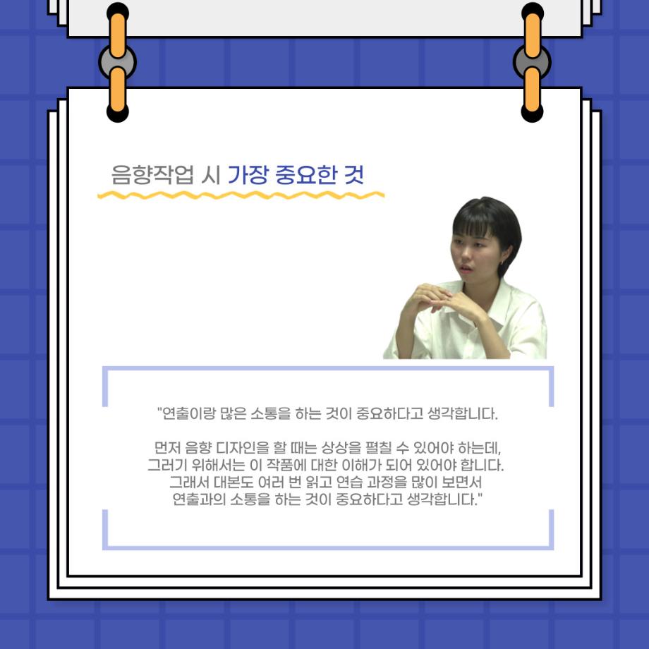 본문 시작 홈으로 커뮤니티 학과소개 입학정보 교수소개 학과과정 커뮤니티 공연예매 안내 홈페이지가이드 포토갤러리 공지사항 포토갤러리 작품DB 동아리 학사일정 학생회 포토갤러리 페이스북 트위터 프린트 사이와의 인터뷰 - 23년도 음향장 ‘최희진‘ 연기예술학과 3286 2023-07-24 안녕하십니까! 23년도 학회 ‘사이’입니다! 학회 ‘사이’의 다섯번째 인터뷰로 연기예술학과 23년도 음향장인 최희진 학생과 인터뷰하는 시간을 가졌습니다! 이번 인터뷰에서는 음향에 대한 매력과 음향 작업에서 가장 중요한 것, 음향 작업에서 알아두어야 하는 것 등에 대해 인터뷰하였습니 앞으로 있을 인터뷰 컨텐츠 ‘사인’도 많은 사랑 부탁드립니다. 목록 이전제 97회 세명대학교 연기예술학과 정기공연 하계 프로젝트 < 첼로와 케찹 > 다음 제 98회 세명대학교 연기예술학과 정기공연 하계 프로젝트 - < 하녀들 > 담당부서 : 연기예술학과 담당자 : - 연락처 : 043-649-1733 최종수정일 : 2024-10-26 만족도조사 만족도 조사 이 페이지에서 제공하는 정보에 대하여 만족하시나요? 매우만족 만족 보통 불만족 매우불만족