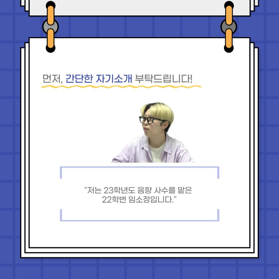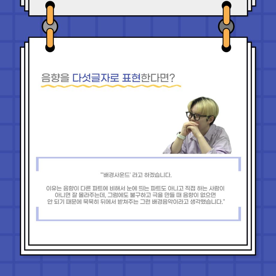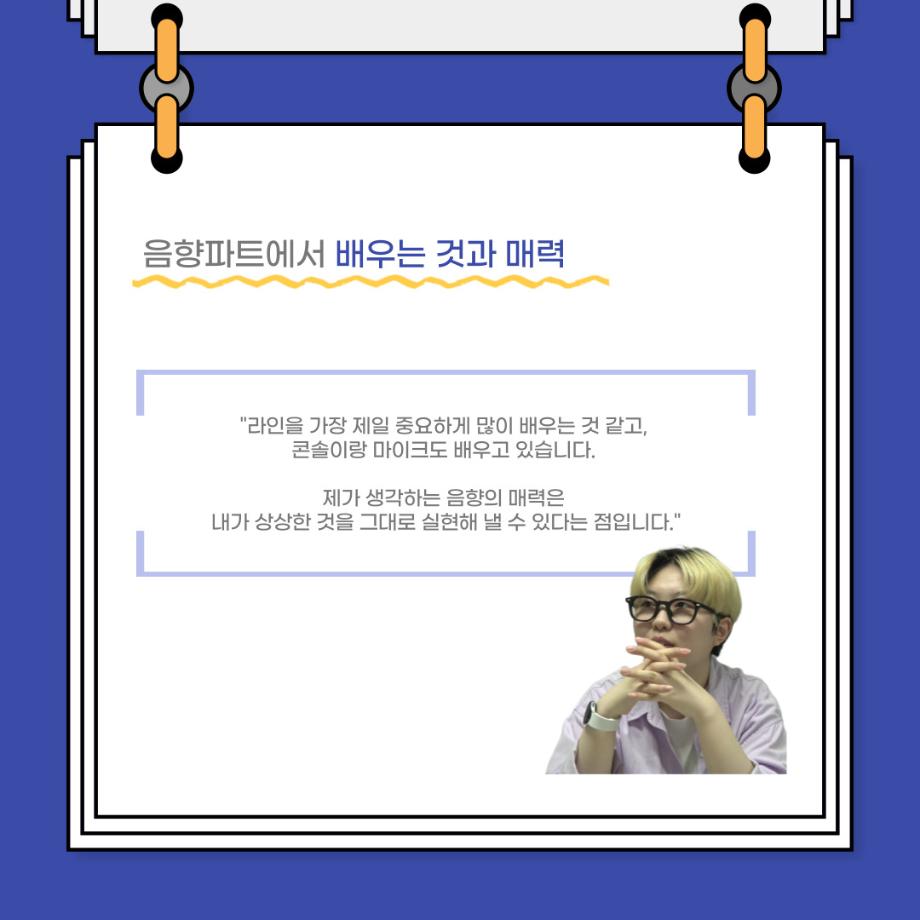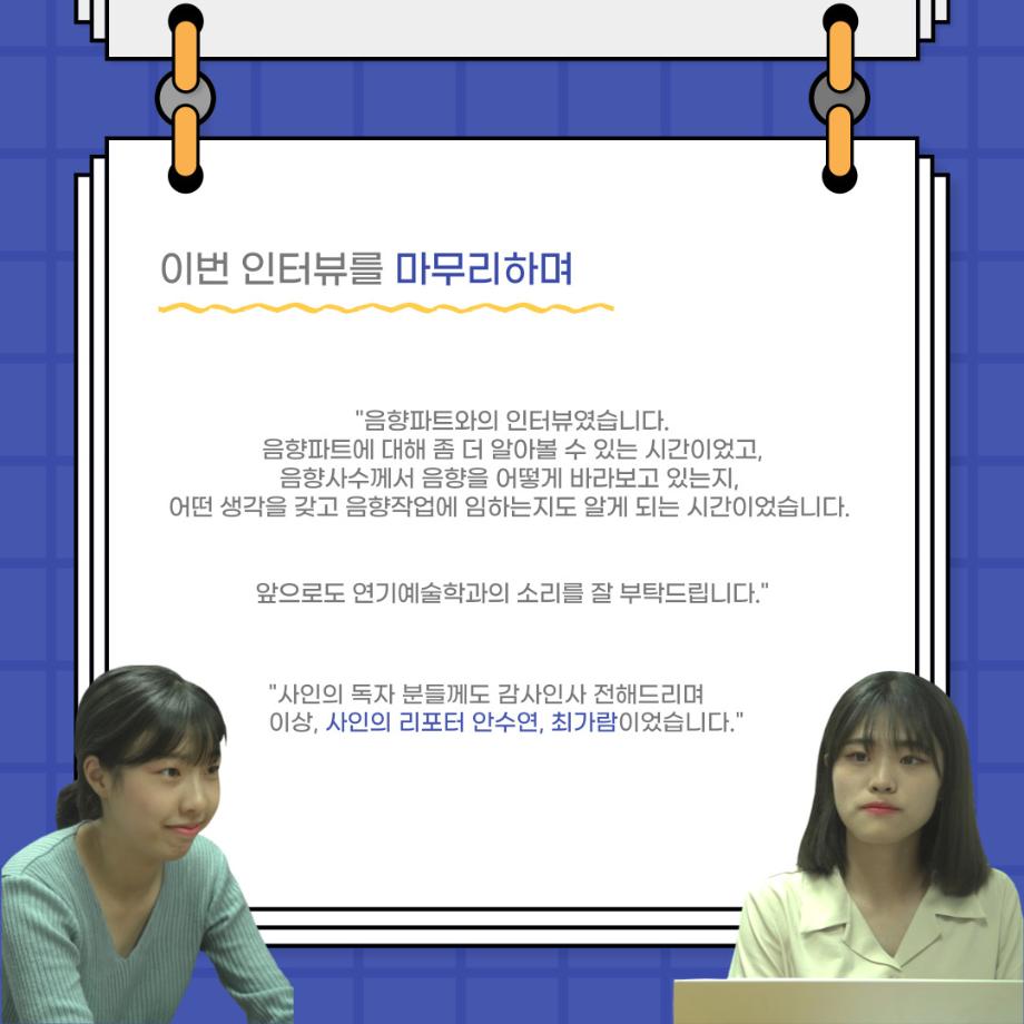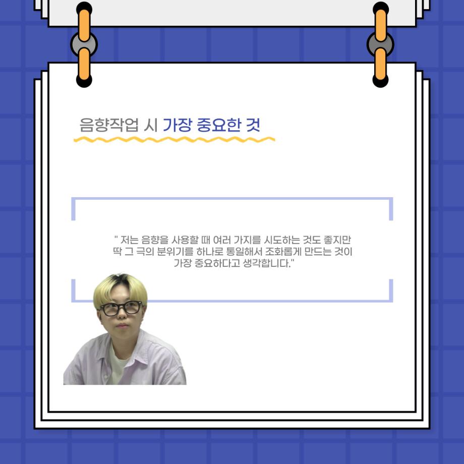 본문 시작 홈으로 커뮤니티 학과소개 입학정보 교수소개 학과과정 커뮤니티 공연예매 안내 홈페이지가이드 포토갤러리 공지사항 포토갤러리 작품DB 동아리 학사일정 학생회 포토갤러리 페이스북 트위터 프린트 사이와의 인터뷰 - 23년도 음향 사수 '임소정' 연기예술학과 3580 2023-08-09 안녕하십니까. 23년도 학회 ‘사이’입니다. 학회 ‘사이’의 여섯번째 인터뷰로 연기예술학과 23년도 음향 사수인 임소정 학생과 인터뷰하는 시간을 가졌습니다. 이번 인터뷰에서는 음향에 대한 매력과 음향 작업에서 가장 중요한 것, 음향 작업에서 알아두어야 하는 것 등에 대해 인터뷰하였습니다. 앞으로 있을 인터뷰 컨텐츠 ‘사인’ 많은 사랑 부탁드립니다. 목록 다음 2023학년도 1학기 하계 현장실습 ‘어드벤쳐프로젝트’ 다음 제14회 서울 청소년 연극축제 담당부서 : 연기예술학과 담당자 : - 연락처 : 043-649-1733 최종수정일 : 2024-10-26 만족도조사 만족도 조사 이 페이지에서 제공하는 정보에 대하여 만족하시나요? 매우만족 만족 보통 불만족 매우불만족