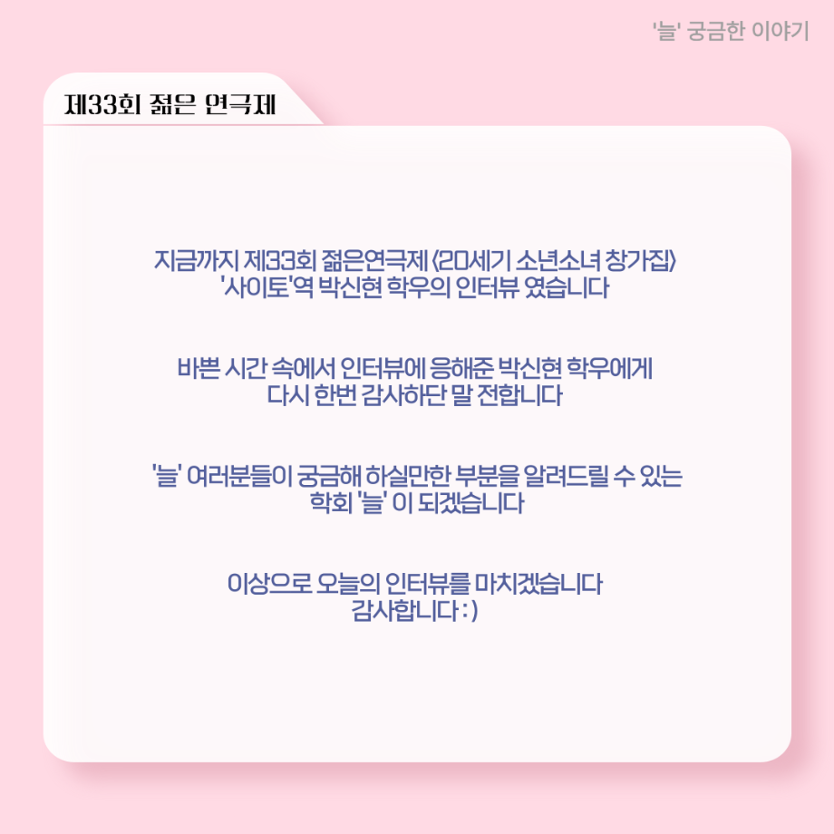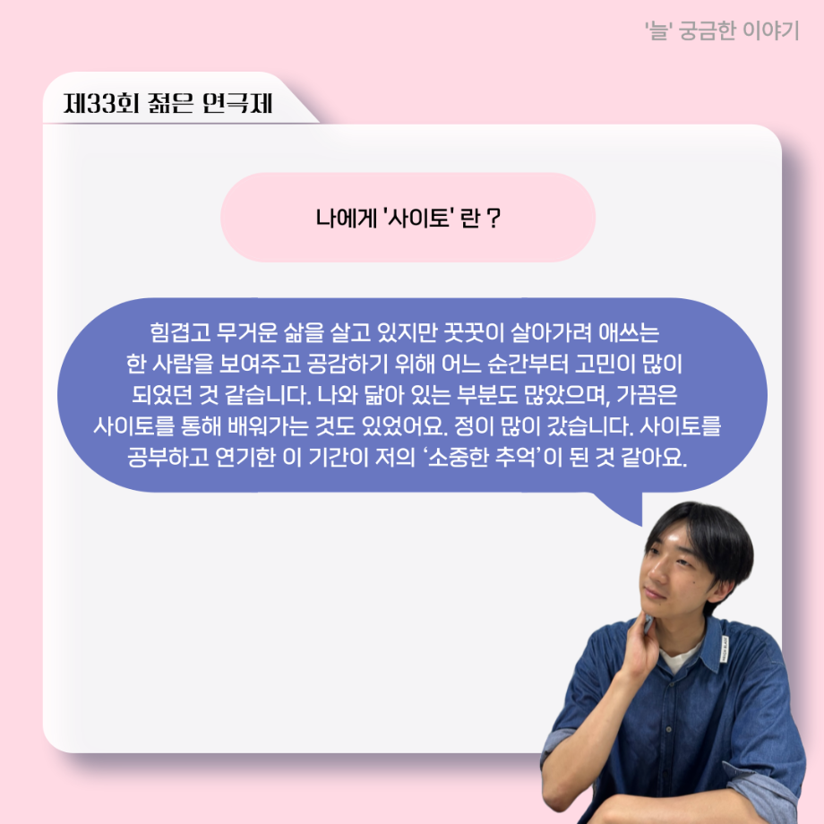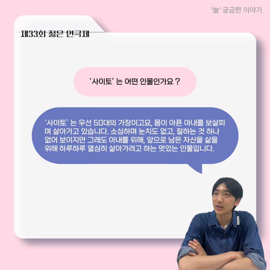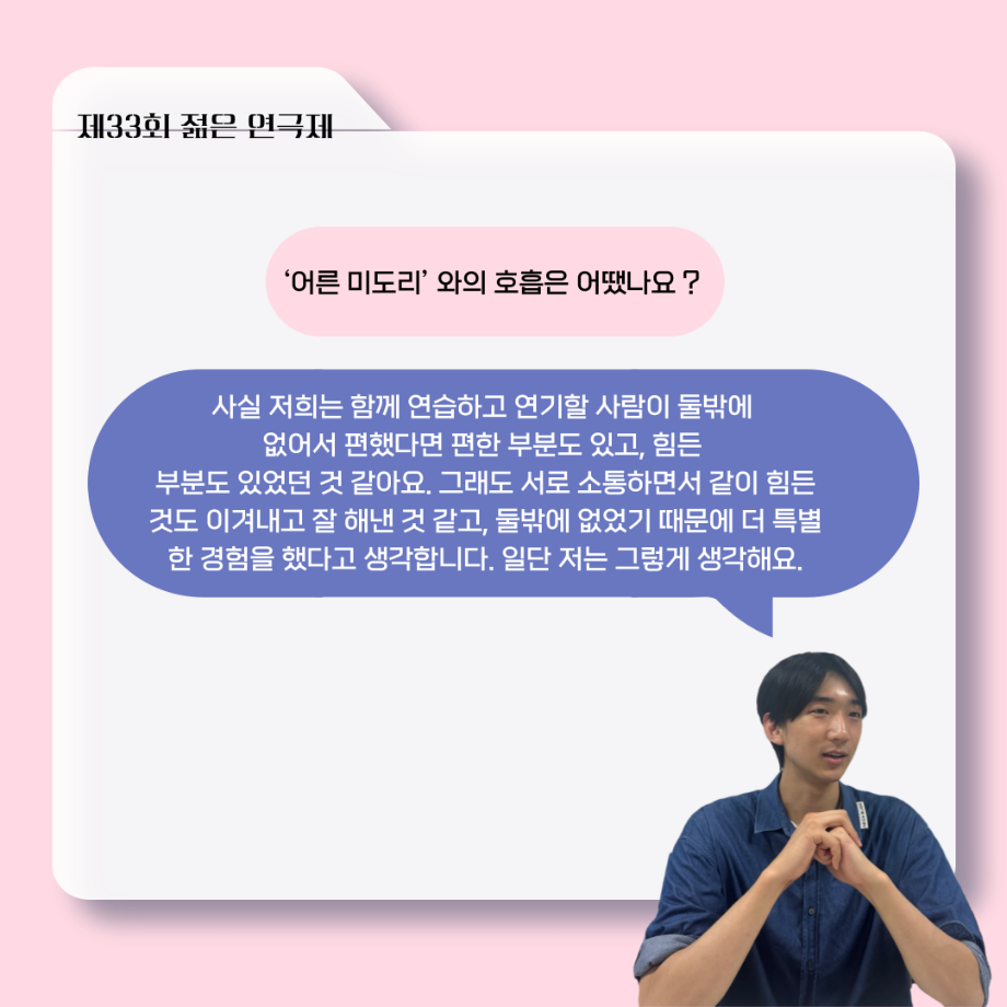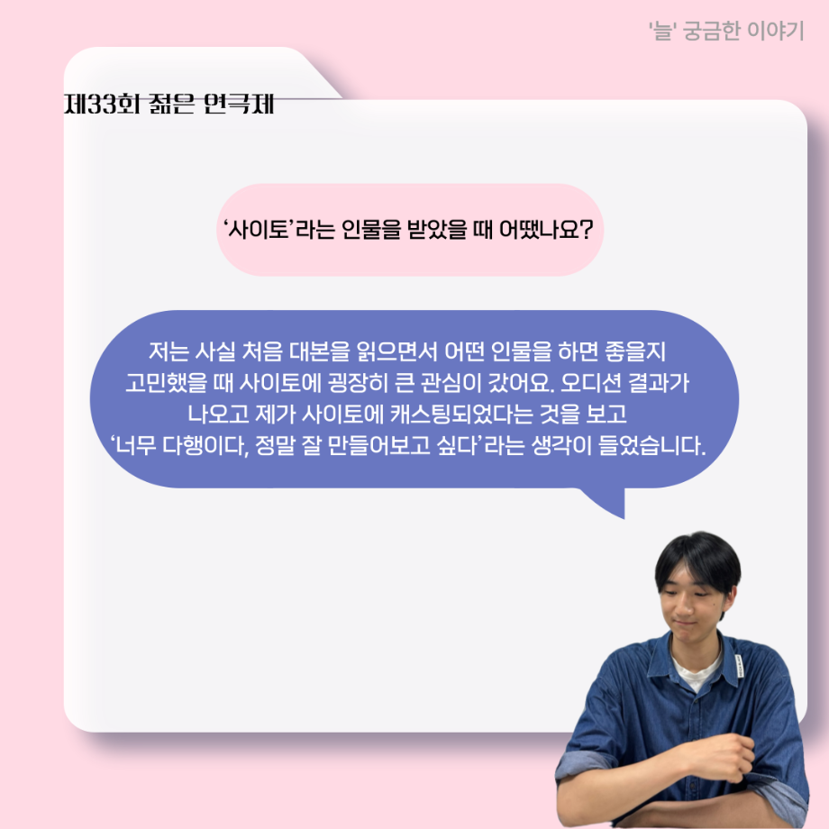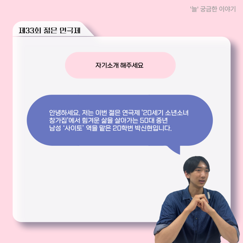 본문 시작 홈으로 커뮤니티 학과소개 입학정보 교수소개 학과과정 커뮤니티 공연예매 안내 홈페이지가이드 포토갤러리 공지사항 포토갤러리 작품DB 동아리 학사일정 학생회 포토갤러리 페이스북 트위터 프린트 ‘늘‘ 궁금한 이야기 - 젊은연극제 ‘20세기 소년소녀 창가집’ 사이토 役 < 박신현 > 연기예술학과 980 2025-08-15 . 목록 다음 2025년 세명대학교 연기예술학과 2학기 개강총회 다음 ‘늘‘ 궁금한 이야기 - 젊은연극제 ‘20세기 소년소녀 창가집’ 종이연극 아저씨 役 < 윤준호 > 담당부서 : 연기예술학과 담당자 : - 연락처 : 043-649-1733 최종수정일 : 2024-10-26 만족도조사 만족도 조사 이 페이지에서 제공하는 정보에 대하여 만족하시나요? 매우만족 만족 보통 불만족 매우불만족