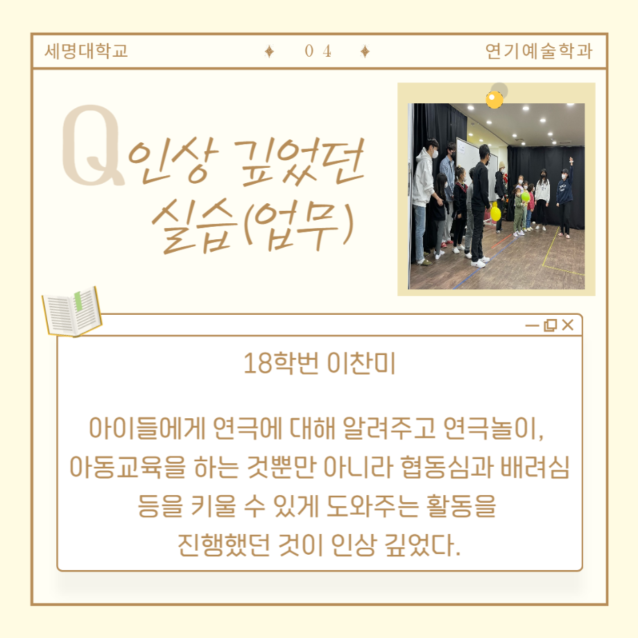 현장실습은 배우, 조명 및 음향, 기획 및 홍보, 프로덕션 제작, 연극 놀이 수업, 아동 교육 등 다양한 경험을 통해 학생들이 더욱 역량을 키워나갈 수 있는 기회를 제공합니다.🎷