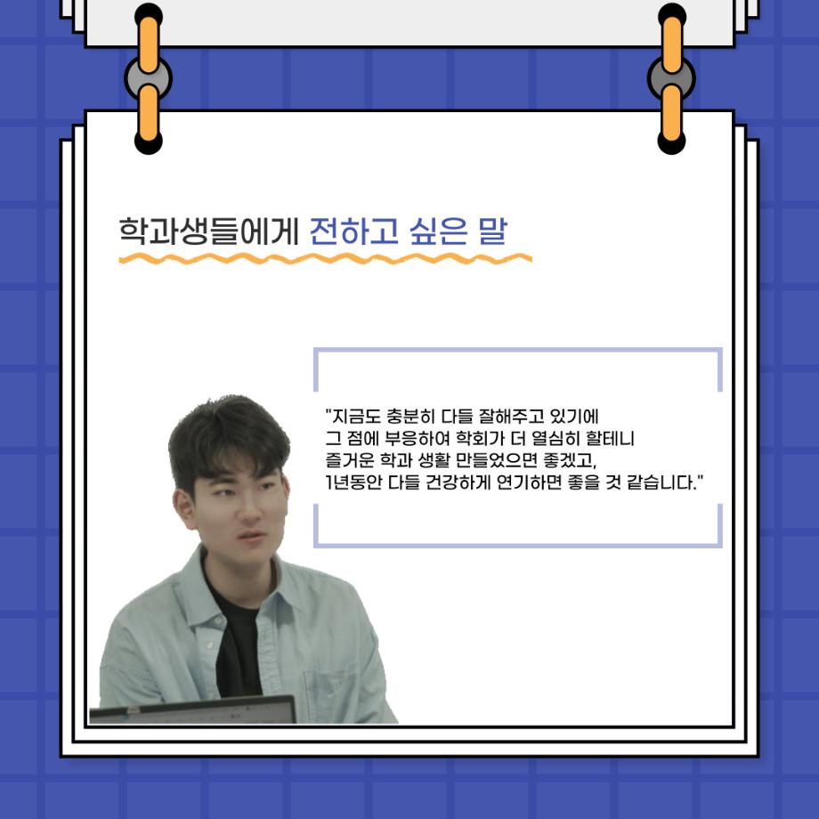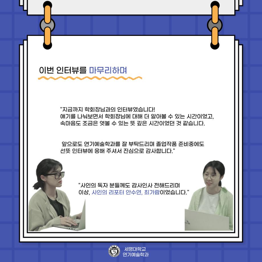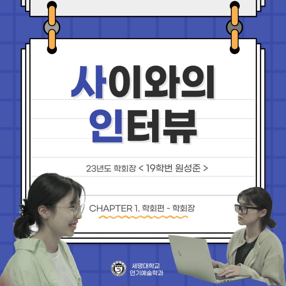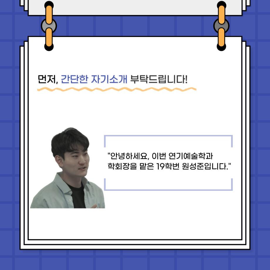 본문 시작 홈으로 커뮤니티 학과소개 입학정보 교수소개 학과과정 커뮤니티 공연예매 안내 홈페이지가이드 포토갤러리 공지사항 포토갤러리 작품DB 동아리 학사일정 학생회 포토갤러리 페이스북 트위터 프린트 🎙사이와의 인터뷰 - 23년도 학회장 ‘원성준’🎙 연기예술학과 2865 2023-05-23 안녕하십니까! 23년도 학회 '사이'입니다. 학회 '사이'의 첫번째 인터뷰로 연기예술학과 23년도 학회장인 원성준 학회장과 인터뷰를 진행했습니다. 학회를 맡은 소감과 학회장이 되기로 결심한 계기, 학과생들에게 전하고 싶은 말 등 다양한 인터뷰를 진행하였습니다. 앞으로 있을 인터뷰 컨텐츠 '사인' 많은 사랑 부탁드립니다. 목록 이전[2023-1학기] 원격수업사이버강좌 기말고사 시험 진행 안내 모바일응시불가 다음 [밀어주는 위원회] 2023년 꿈 실현 장학금 신청 안내 담당부서 : 연기예술학과 담당자 : - 연락처 : 043-649-1733 최종수정일 : 2024-10-26 만족도조사 만족도 조사 이 페이지에서 제공하는 정보에 대하여 만족하시나요? 매우만족 만족 보통 불만족 매우불만족