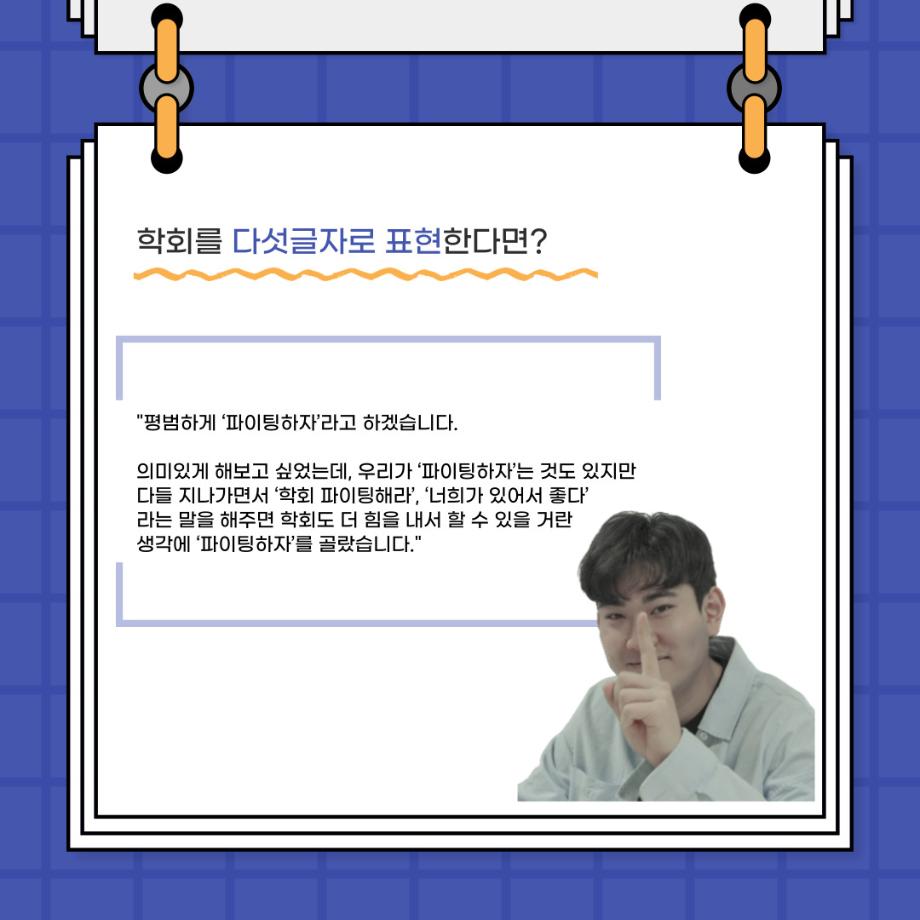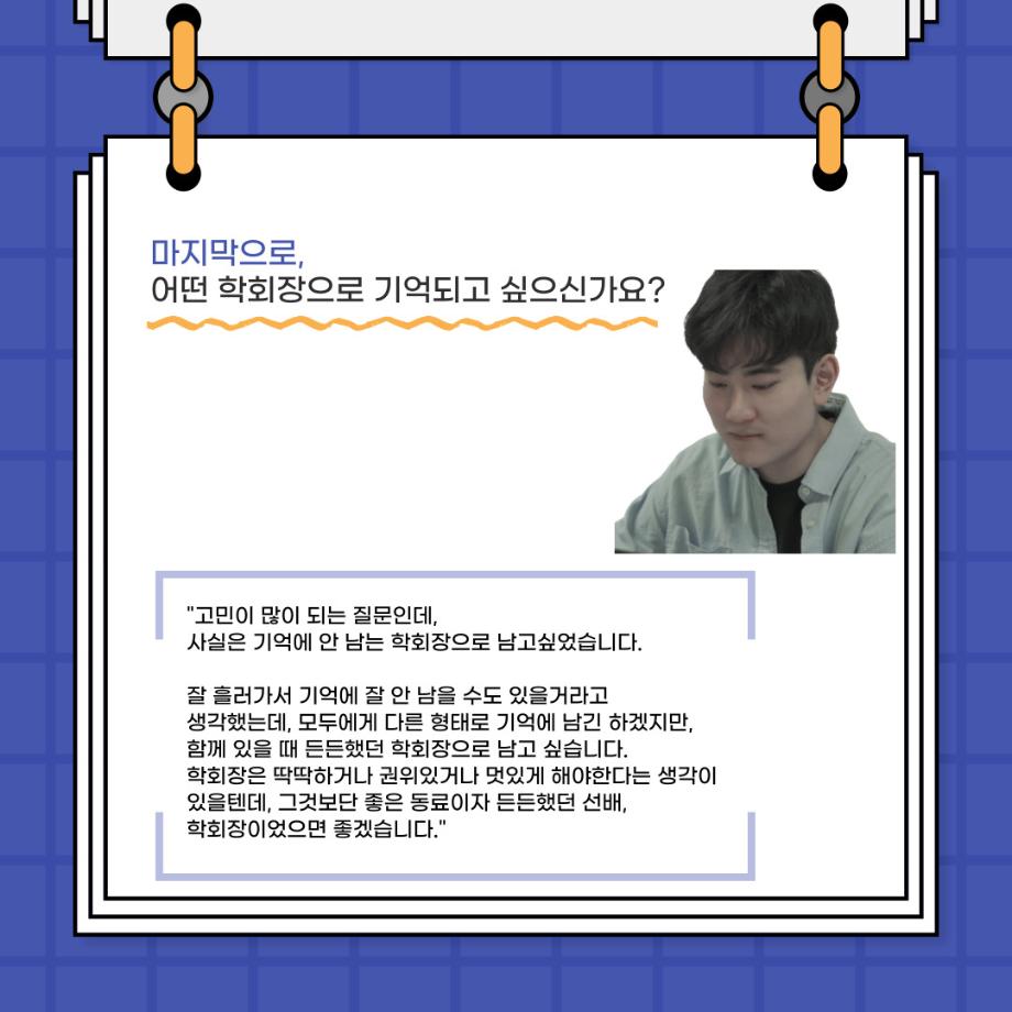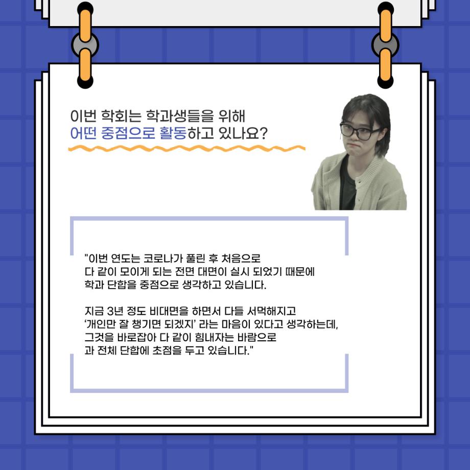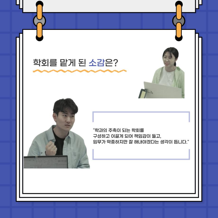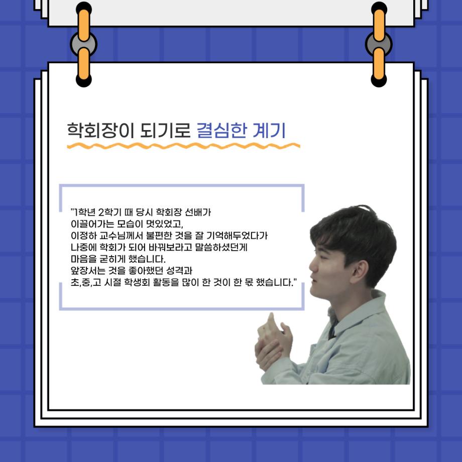 본문 시작 홈으로 커뮤니티 학과소개 입학정보 교수소개 학과과정 커뮤니티 공연예매 안내 홈페이지가이드 포토갤러리 공지사항 포토갤러리 작품DB 동아리 학사일정 학생회 포토갤러리 페이스북 트위터 프린트 🎙사이와의 인터뷰 - 23년도 학회장 ‘원성준’🎙 연기예술학과 2865 2023-05-23 안녕하십니까! 23년도 학회 '사이'입니다. 학회 '사이'의 첫번째 인터뷰로 연기예술학과 23년도 학회장인 원성준 학회장과 인터뷰를 진행했습니다. 학회를 맡은 소감과 학회장이 되기로 결심한 계기, 학과생들에게 전하고 싶은 말 등 다양한 인터뷰를 진행하였습니다. 앞으로 있을 인터뷰 컨텐츠 '사인' 많은 사랑 부탁드립니다. 목록 이전[2023-1학기] 원격수업사이버강좌 기말고사 시험 진행 안내 모바일응시불가 다음 [밀어주는 위원회] 2023년 꿈 실현 장학금 신청 안내 담당부서 : 연기예술학과 담당자 : - 연락처 : 043-649-1733 최종수정일 : 2024-10-26 만족도조사 만족도 조사 이 페이지에서 제공하는 정보에 대하여 만족하시나요? 매우만족 만족 보통 불만족 매우불만족
