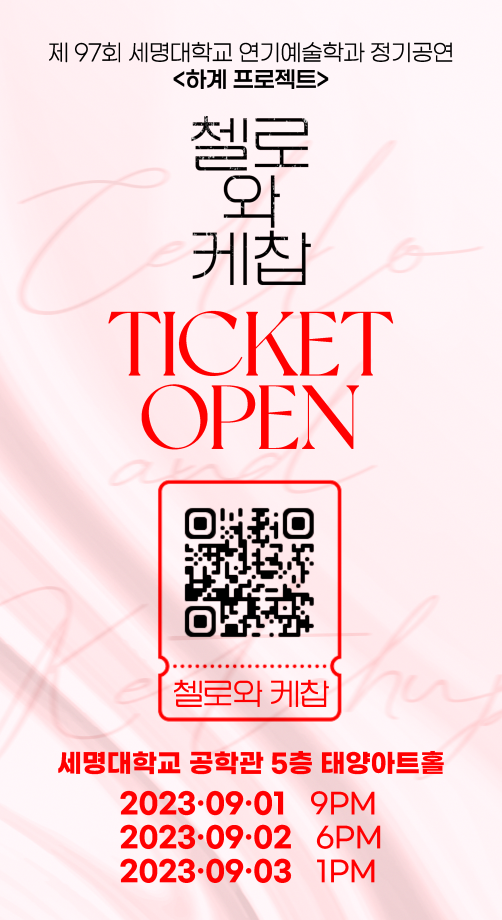 본문 시작 홈으로 커뮤니티 학과소개 입학정보 교수소개 학과과정 커뮤니티 공연예매 안내 홈페이지가이드 포토갤러리 공지사항 포토갤러리 작품DB 동아리 학사일정 학생회 포토갤러리 페이스북 트위터 프린트 제 97회 세명대학교 연기예술학과 정기공연 '하계 프로젝트' < 첼로와 케찹 > 연기예술학과 3989 2023-08-24 제 97회 세명대학교 연기예술학과 정기공연 '하계 프로젝트' < 첼로와 케찹 > 캐릭터 포스터 입니다. 𝑪𝒆𝒍𝒍𝒐 𝒂𝒏𝒅 𝑲𝒆𝒕𝒄𝒉𝒖𝒑 𝟐𝟎𝟐𝟑•𝟎𝟗•𝟎𝟏 𝟗𝐏𝐌 𝟐𝟎𝟐𝟑•𝟎𝟗•𝟎𝟐 𝟔𝐏𝐌 𝟐𝟎𝟐𝟑•𝟎𝟗•𝟎𝟑 𝟏𝐏𝐌 세명대학교 공학관 5층 태양아트홀 - 2023.08.19 - 2023.09.11 첫 번째 작품 | d0nut 두 번째 작품 | 첼로와 케찹 세 번째 작품 | 하녀들 여러분들의 많은 관심과 참여 부탁드립니다. 목록 이전사이와의 인터뷰 - 23년도 무대장 ‘장보배‘ 다음 제5회 세명진로 Festival 개최 안내 담당부서 : 연기예술학과 담당자 : - 연락처 : 043-649-1733 최종수정일 : 2024-10-26 만족도조사 만족도 조사 이 페이지에서 제공하는 정보에 대하여 만족하시나요? 매우만족 만족 보통 불만족 매우불만족