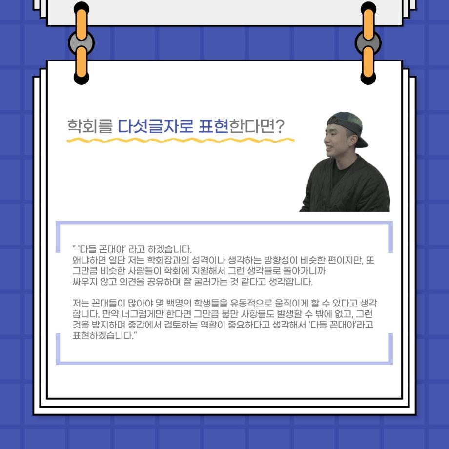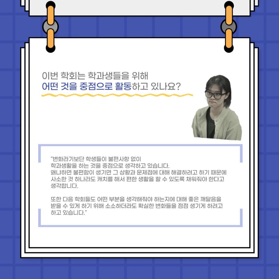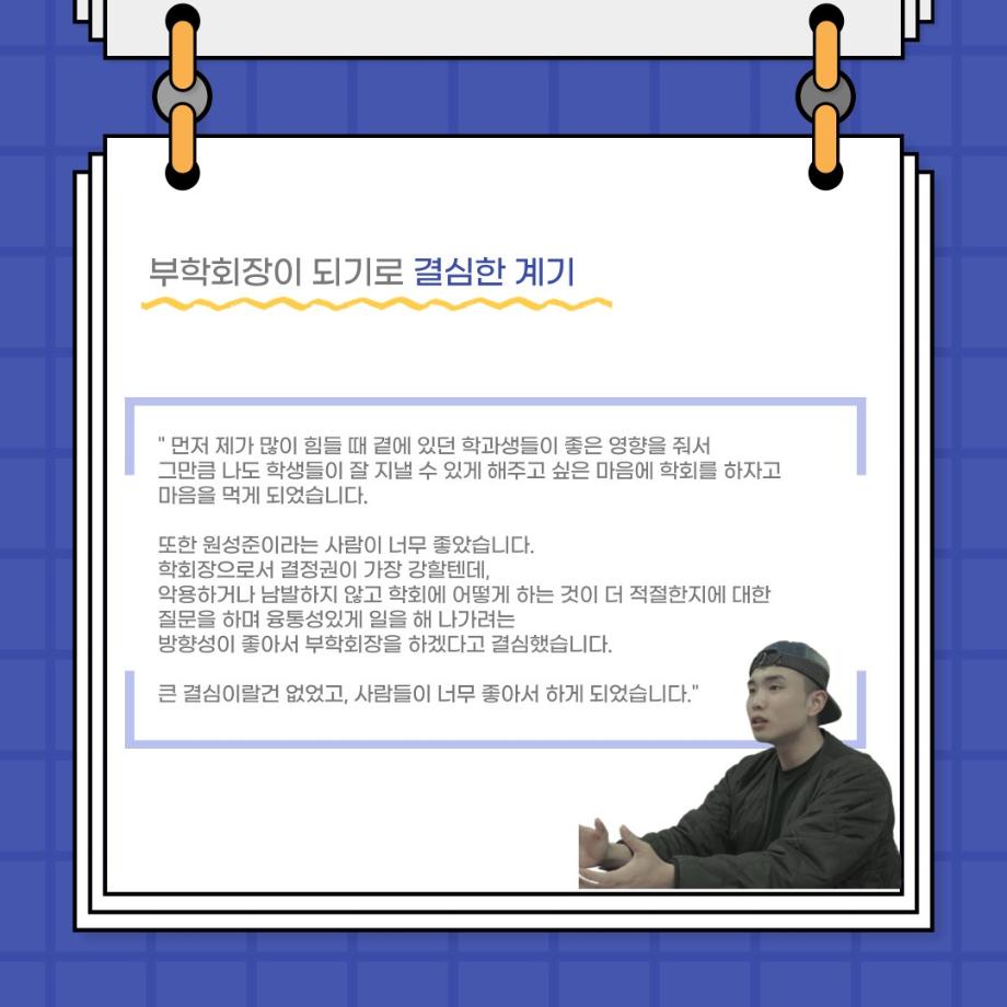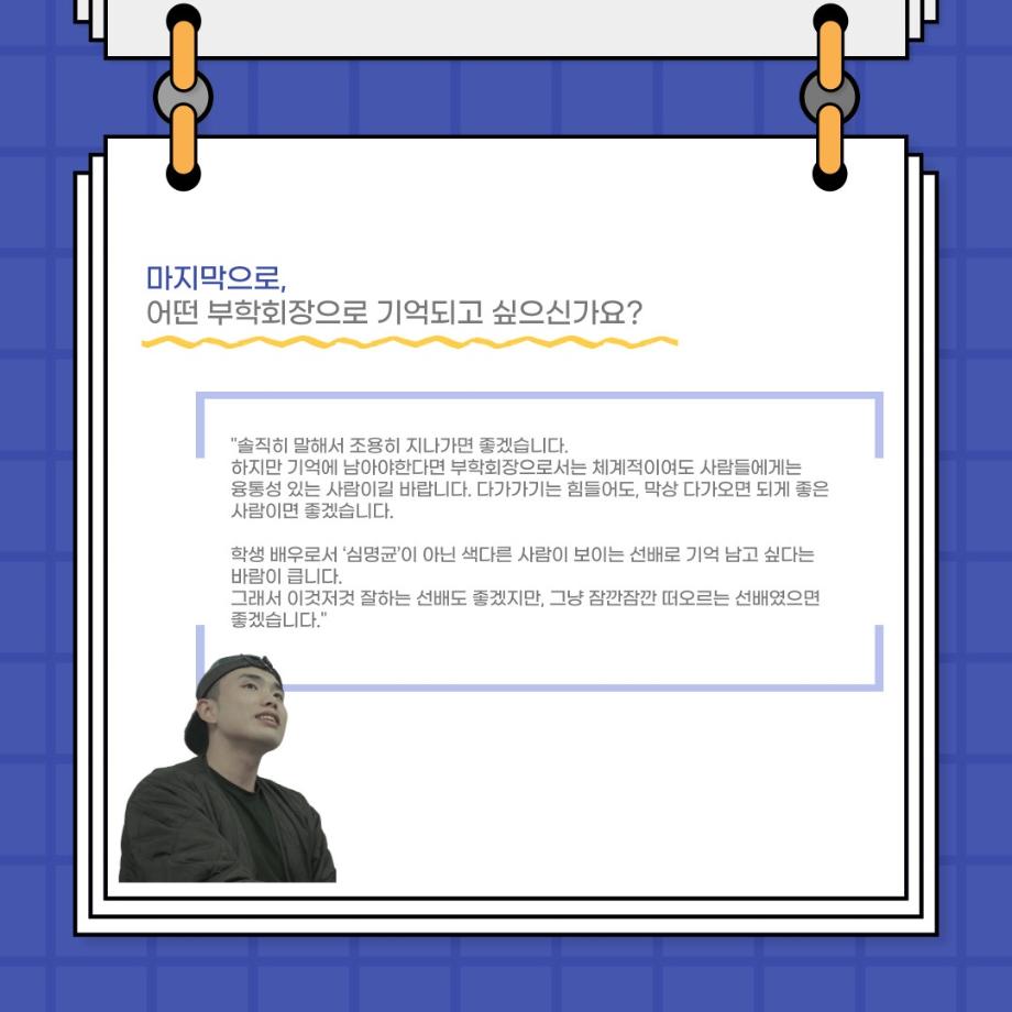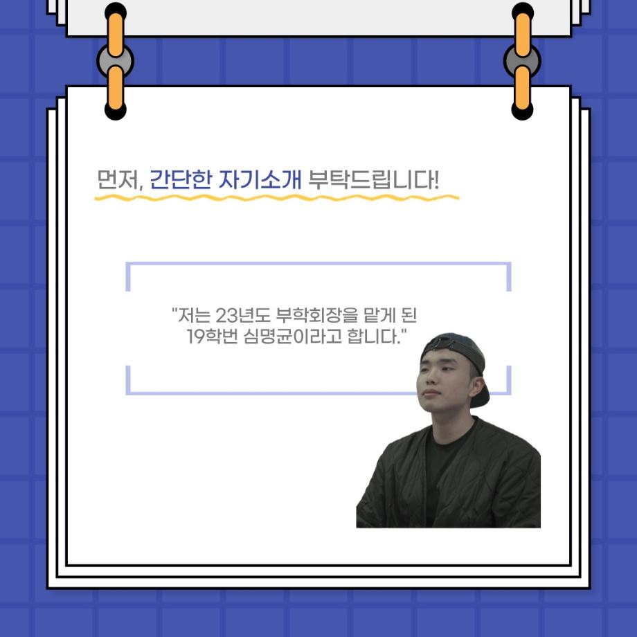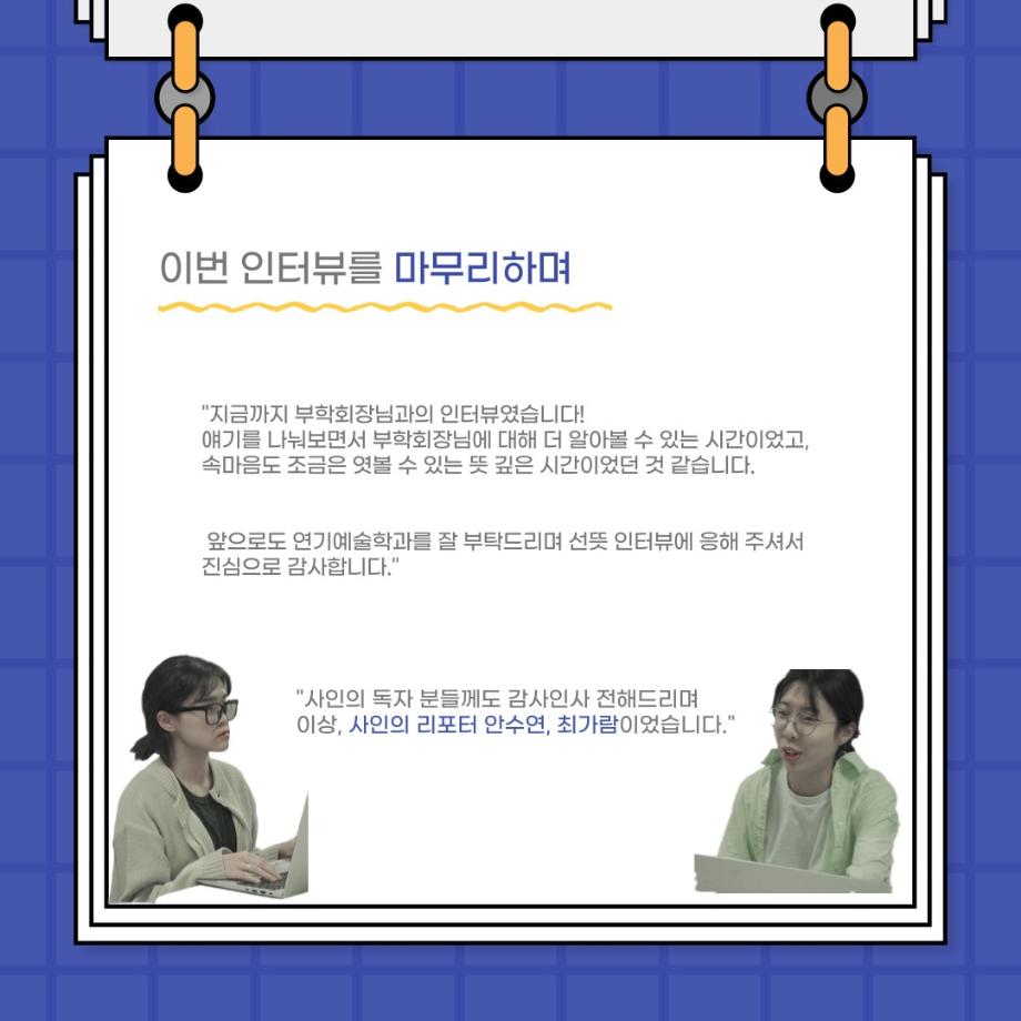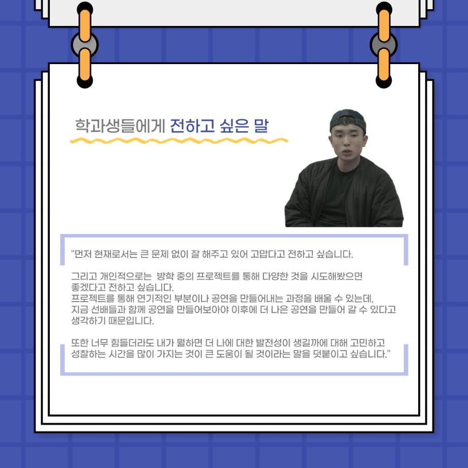 본문 시작 홈으로 커뮤니티 학과소개 입학정보 교수소개 학과과정 커뮤니티 공연예매 안내 홈페이지가이드 포토갤러리 공지사항 포토갤러리 작품DB 동아리 학사일정 학생회 포토갤러리 페이스북 트위터 프린트 사이와의 인터뷰 - 23년도 부학회장 ‘심명균’ 연기예술학과 3259 2023-06-07 안녕하십니까. 23년도 학회 ‘사이’입니다! 학회 ‘사이’의 두번째 인터뷰로 연기예술학과 23년도 부학회장인 심명균 부학회장과 인터뷰하는 시간을 가졌습니다. 학회를 맡은 소감과 부학회장이 되기로 결심한 계기, 학과생들에게 전하고 싶은 말 등 다양한 인터뷰를 진행하였습니다. 다음 인터뷰 컨텐츠 ‘사인’도 많은 사랑 부탁드립니다. 목록 다음 제 97회 세명대학교 연기예술학과 정기공연 '하계 프로젝트' < 첼로와 케찹 > 캐릭터 포스터 다음 사이와의 인터뷰 - 23년도 무대사수 ‘이종화’ 담당부서 : 연기예술학과 담당자 : - 연락처 : 043-649-1733 최종수정일 : 2024-10-26 만족도조사 만족도 조사 이 페이지에서 제공하는 정보에 대하여 만족하시나요? 매우만족 만족 보통 불만족 매우불만족