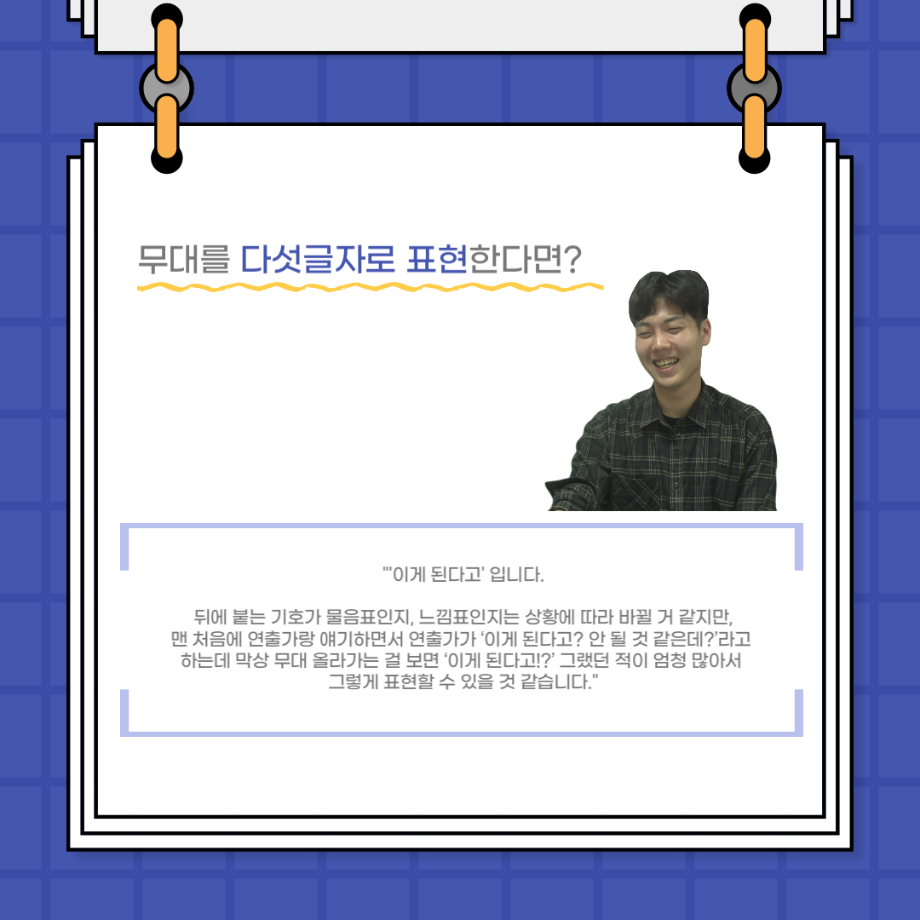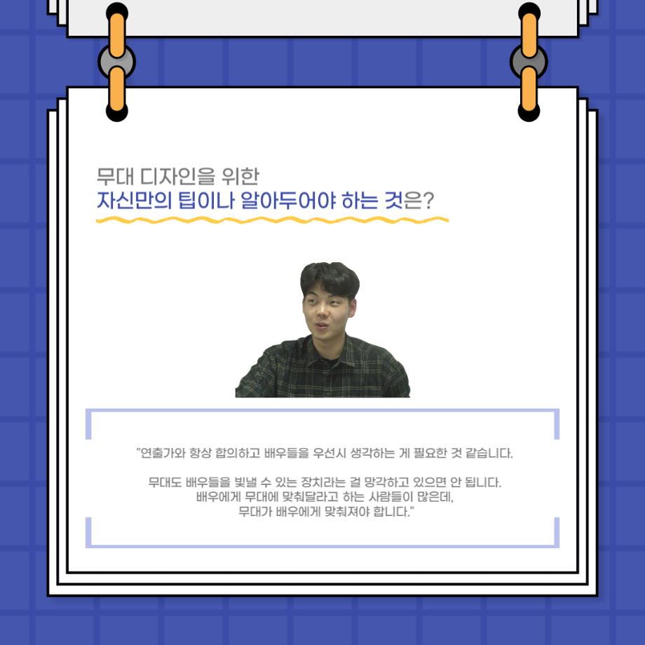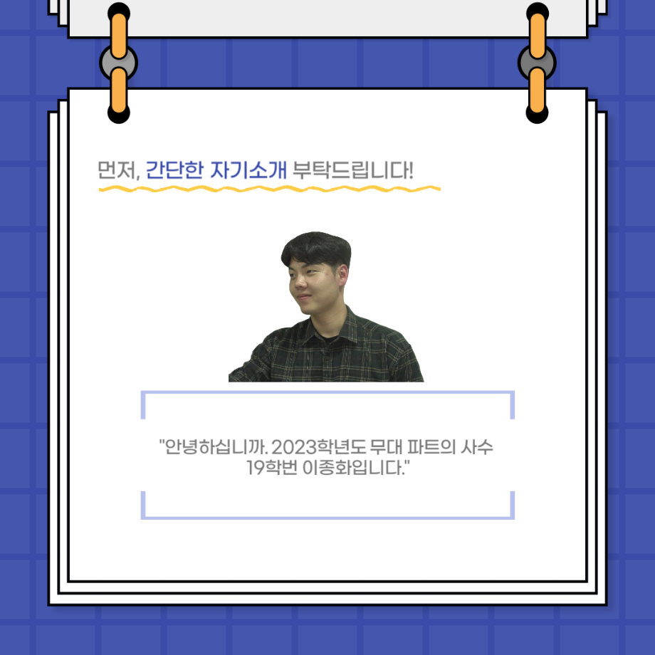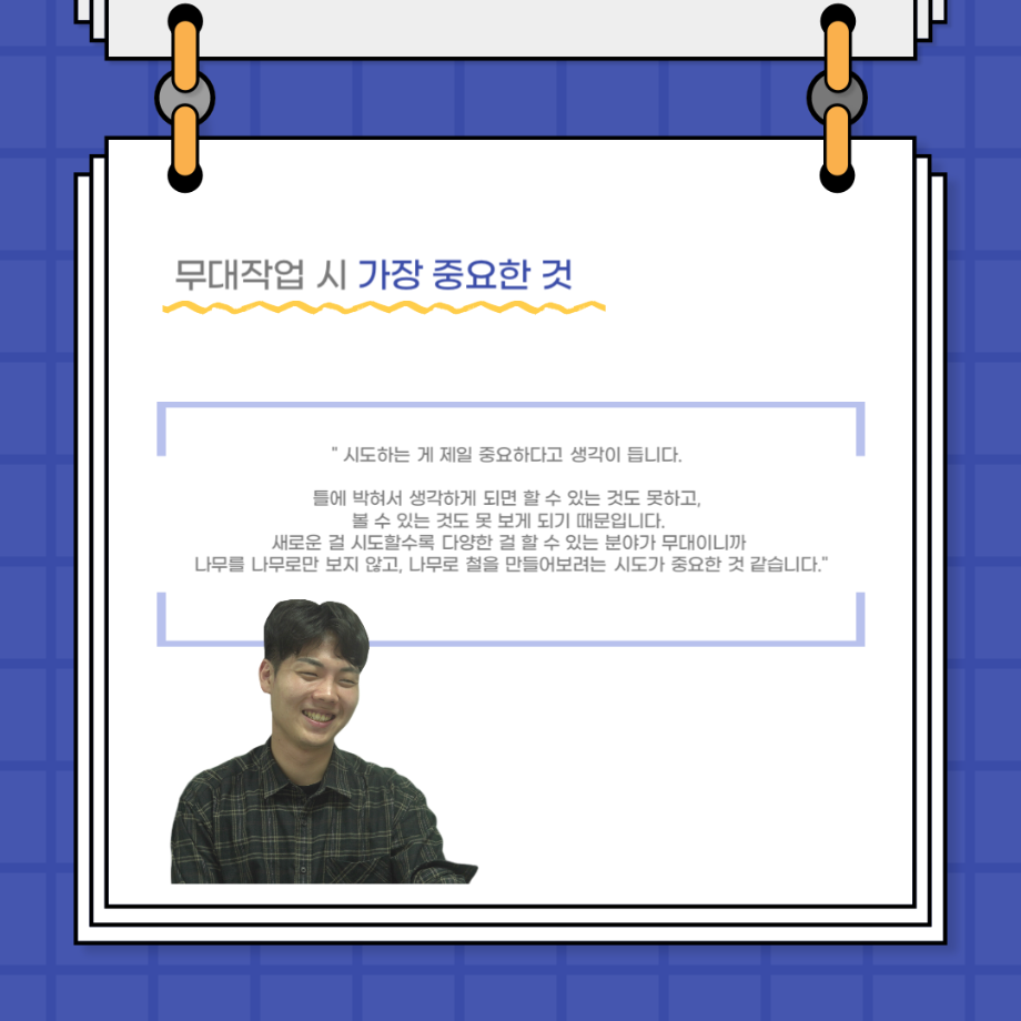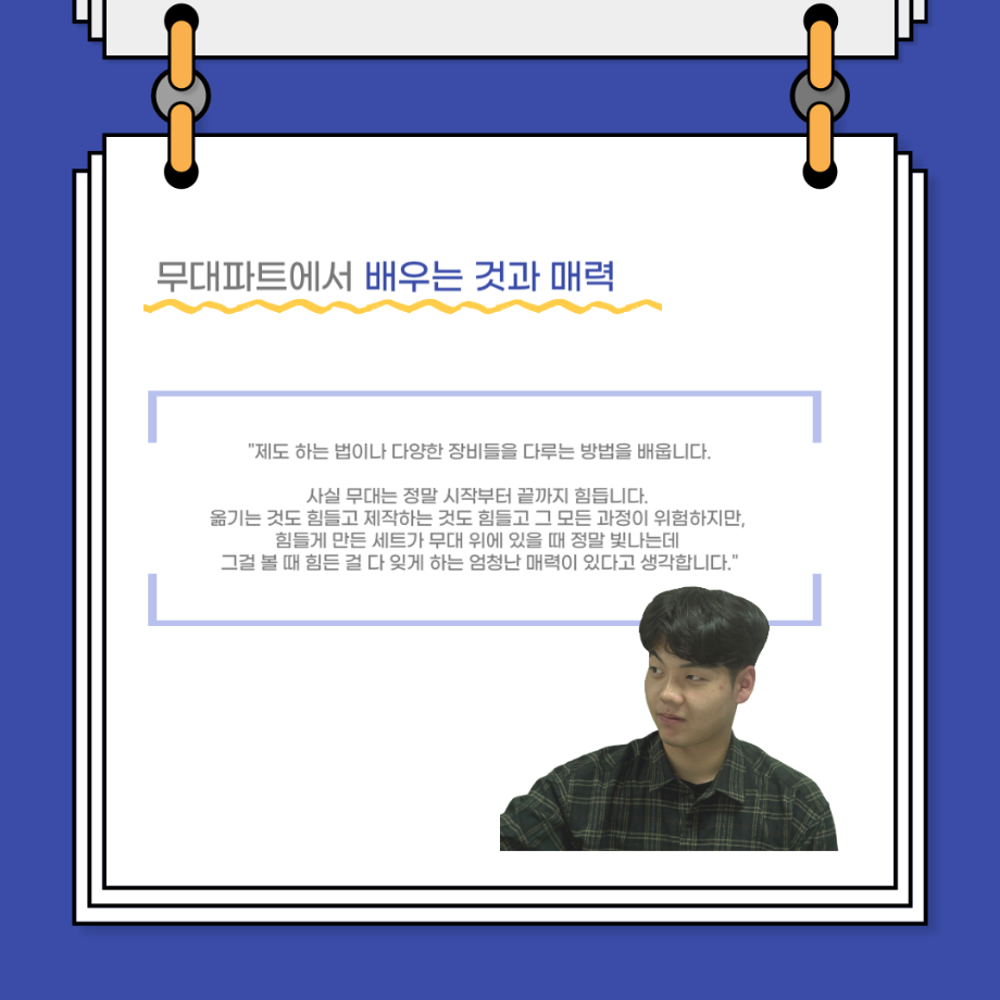 본문 시작 홈으로 커뮤니티 학과소개 입학정보 교수소개 학과과정 커뮤니티 공연예매 안내 홈페이지가이드 포토갤러리 공지사항 포토갤러리 작품DB 동아리 학사일정 학생회 포토갤러리 페이스북 트위터 프린트 사이와의 인터뷰 - 23년도 무대사수 ‘이종화’ 연기예술학과 3856 2023-08-31 안녕하십니까. 23년도 학회 ‘사이’입니다! 학회 ‘사이’의 여덟번째 인터뷰로 연기예술학과 23년도 무대사수인 이종화 학생과 인터뷰하는 시간을 가졌습니다. 이번 인터뷰에서는 무대 파트의 매력과 무대 작업시 가장 중요한 것, 무대 작업에서 알아두어야 하는 것 등에 대해 인터뷰하였습니다. 다음 인터뷰 컨텐츠 ‘사인’도 많은 사랑 부탁드립니다. 목록 이전사이와의 인터뷰 - 23년도 부학회장 ‘심명균’ 다음 ★제5회 세명진로Festival 자기소개서 특강 모집안내★ 담당부서 : 연기예술학과 담당자 : - 연락처 : 043-649-1733 최종수정일 : 2024-10-26 만족도조사 만족도 조사 이 페이지에서 제공하는 정보에 대하여 만족하시나요? 매우만족 만족 보통 불만족 매우불만족
