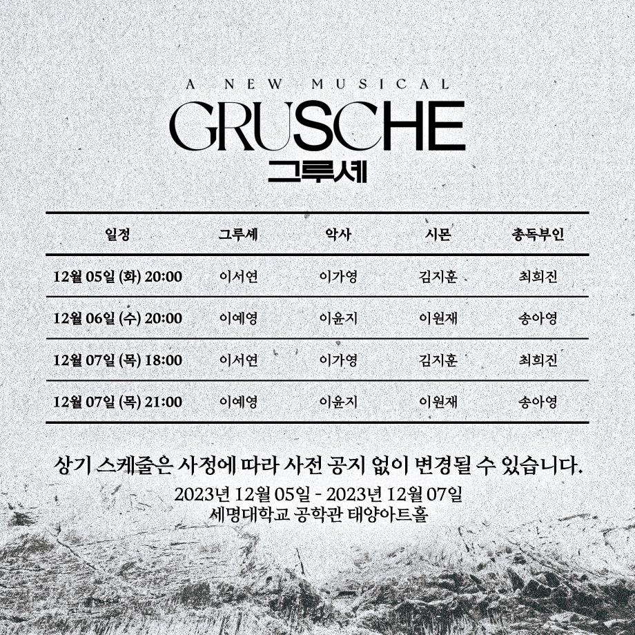 본문 시작 홈으로 커뮤니티 학과소개 입학정보 교수소개 학과과정 커뮤니티 공연예매 안내 홈페이지가이드 포토갤러리 공지사항 포토갤러리 작품DB 동아리 학사일정 학생회 포토갤러리 페이스북 트위터 프린트 제 101회 세명대학교 연기예술학과 뮤지컬제작실습 <Grusche> 포스터 & 예매링크 & 캐스트 연기예술학과 2893 2023-11-30 선으로 향한 유혹은 얼마나 끔찍한가 𝐀 𝐍𝐄𝐖 𝐌𝐔𝐒𝐈𝐂𝐀𝐋 <𝐆𝐫𝐮𝐬𝐜𝐡𝐞> - 인스타그램 @musical_grusche www.instagram.com/musical_grusche - 세명대학교 연기예술학과 뮤지컬제작실습 뮤지컬 <그루셰> 2023. 12. 05 20:00 2023. 12. 06 20:00 2023. 12. 07 18:00 / 21:00 세명대학교 공학관 태양아트홀 목록 이전[재학생필독]2024학년도 1학기 국가장학금 및 국가근로장학금 1차 신청 안내 다음 제100회 세명대학교 연기예술학과 정기공연 2학년 <중급연기 관찰발표회> 포스터 담당부서 : 연기예술학과 담당자 : - 연락처 : 043-649-1733 최종수정일 : 2024-10-26 만족도조사 만족도 조사 이 페이지에서 제공하는 정보에 대하여 만족하시나요? 매우만족 만족 보통 불만족 매우불만족