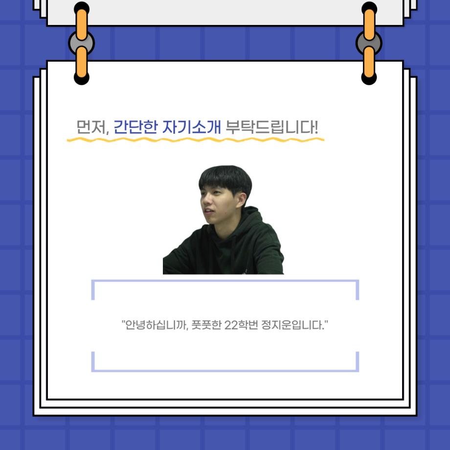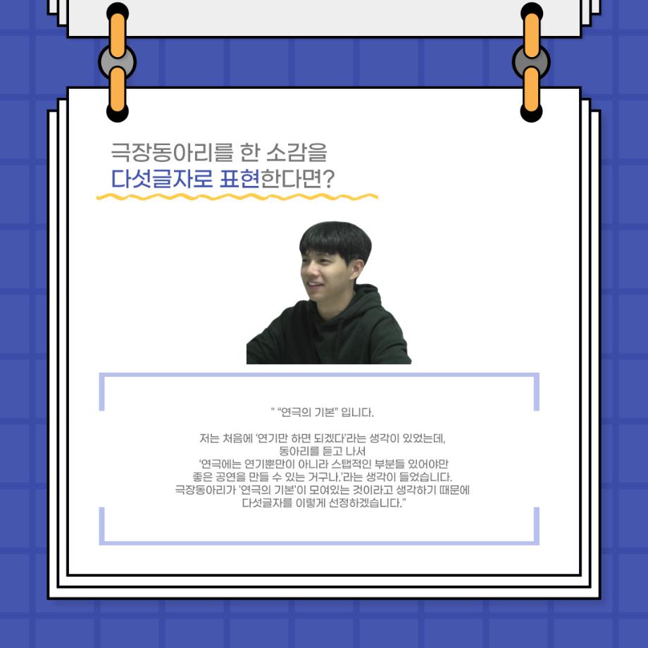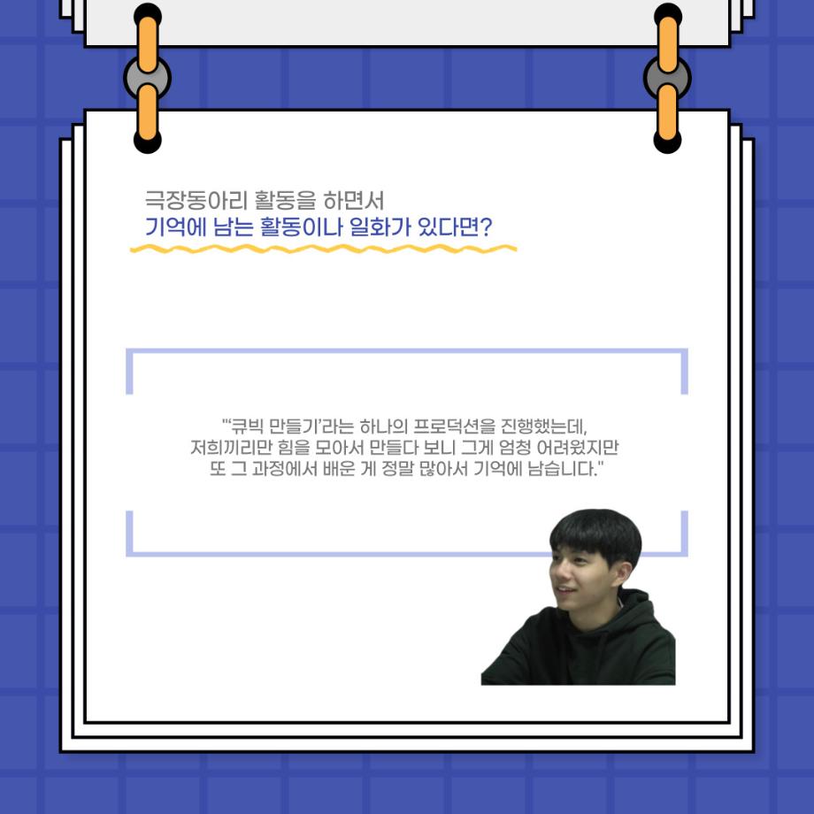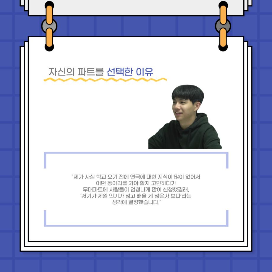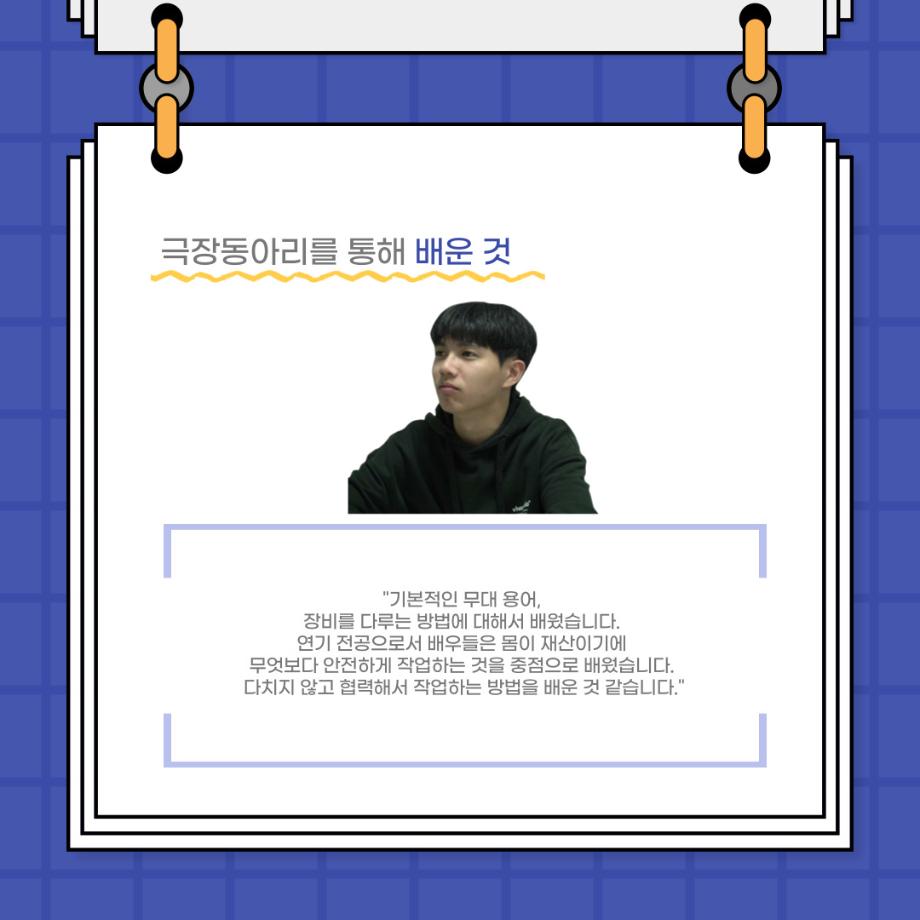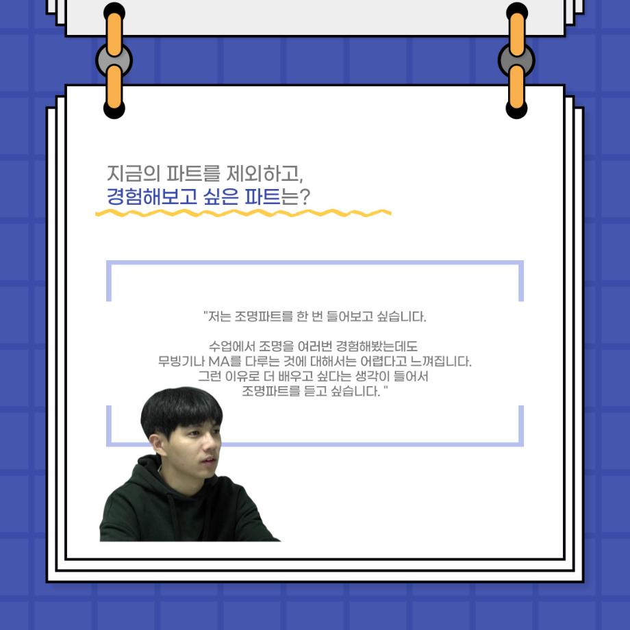 본문 시작 홈으로 커뮤니티 학과소개 입학정보 교수소개 학과과정 커뮤니티 공연예매 안내 홈페이지가이드 포토갤러리 공지사항 포토갤러리 작품DB 동아리 학사일정 학생회 포토갤러리 페이스북 트위터 프린트 사이와의 인터뷰 - 23년도 극장동아리 무대 파트 부원 ‘정지운‘ 연기예술학과 2979 2024-01-24 안녕하십니까. 23년도 학회 ‘사이’입니다. 학회 ‘사이’의 열여섯번째 인터뷰로 연기예술학과 23년도 극장동아리 무대 파트 부원인 정지운 학생과 인터뷰하는 시간을 가졌습니다. 이번 인터뷰에서는 무대파트를 선택한 이유, 극장동아리를 통해 배운 것, 동아리를 하면서 기억에 남는 활동이나 일화 등에 대해 인터뷰하였습니다. 다음 인터뷰 컨텐츠 ‘사인’도 많은 사랑 부탁드립니다. 목록 이전세명대학교 연기예술학과 종강총회 <커튼콜> 다음 사이와의 인터뷰 - 23년도 극장동아리 무대 파트 부원 ‘박상훈‘ 담당부서 : 연기예술학과 담당자 : - 연락처 : 043-649-1733 최종수정일 : 2024-10-26 만족도조사 만족도 조사 이 페이지에서 제공하는 정보에 대하여 만족하시나요? 매우만족 만족 보통 불만족 매우불만족