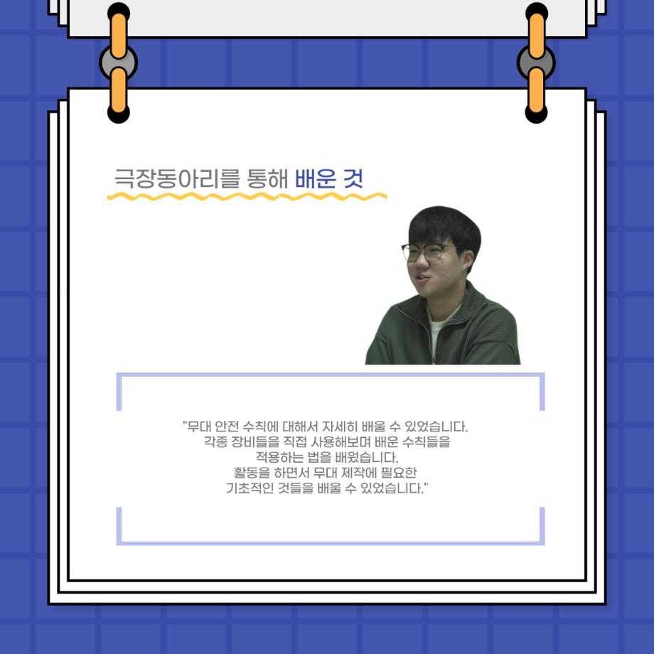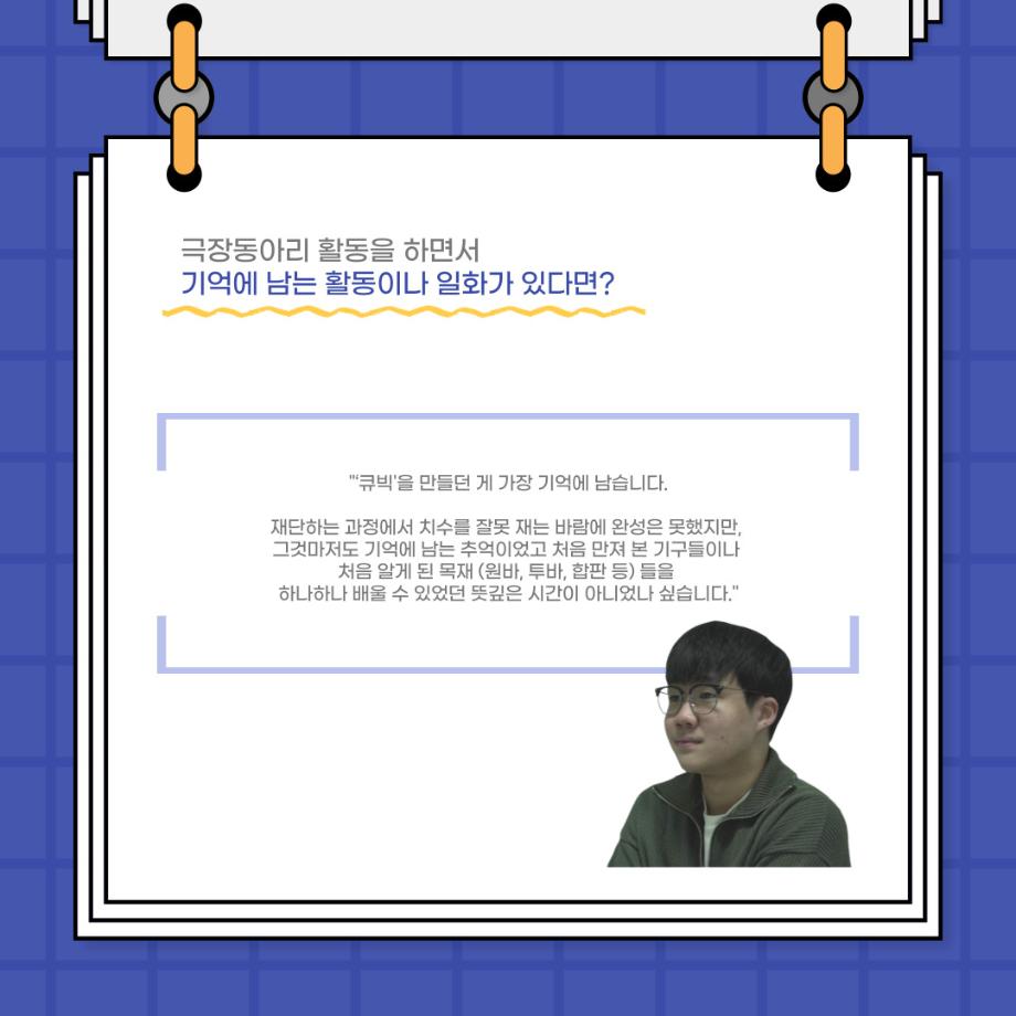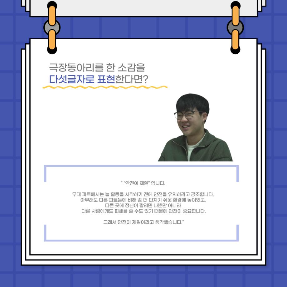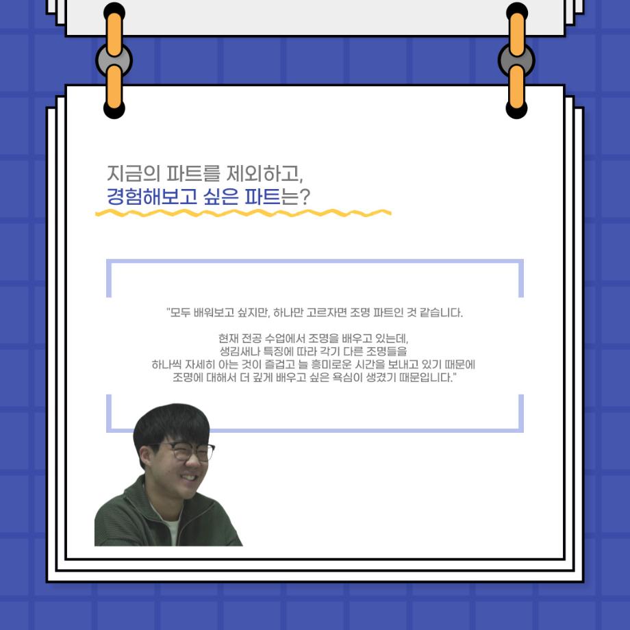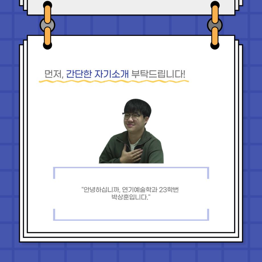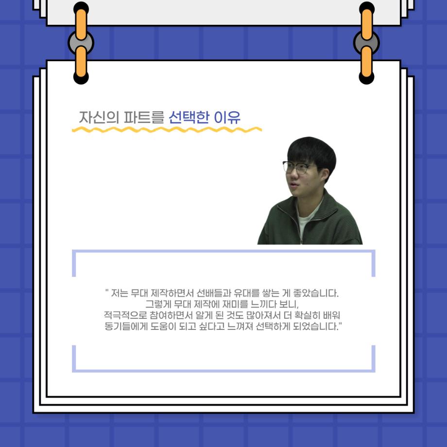 본문 시작 홈으로 커뮤니티 학과소개 입학정보 교수소개 학과과정 커뮤니티 공연예매 안내 홈페이지가이드 포토갤러리 공지사항 포토갤러리 작품DB 동아리 학사일정 학생회 포토갤러리 페이스북 트위터 프린트 사이와의 인터뷰 - 23년도 극장동아리 무대 파트 부원 ‘박상훈‘ 연기예술학과 2962 2024-01-25 안녕하십니까. 23년도 학회 ‘사이’입니다. 학회 ‘사이’의 열일곱번째 인터뷰로 연기예술학과 23년도 극장동아리 무대 파트 부원인 박상훈 학생과 인터뷰하는 시간을 가졌습니다. 이번 인터뷰에서는 무대파트를 선택한 이유, 극장동아리를 통해 배운 것, 동아리를 하면서 기억에 남는 활동이나 일화 등에 대해 인터뷰하였습니다. 다음 인터뷰 컨텐츠 ‘사인’도 많은 사랑 부탁드립니다. 목록 이전사이와의 인터뷰 - 23년도 극장동아리 무대 파트 부원 ‘정지운‘ 다음 사이와의 인터뷰 - 23년도 극장동아리 영상 파트 부원 ‘김준희‘ 담당부서 : 연기예술학과 담당자 : - 연락처 : 043-649-1733 최종수정일 : 2024-10-26 만족도조사 만족도 조사 이 페이지에서 제공하는 정보에 대하여 만족하시나요? 매우만족 만족 보통 불만족 매우불만족