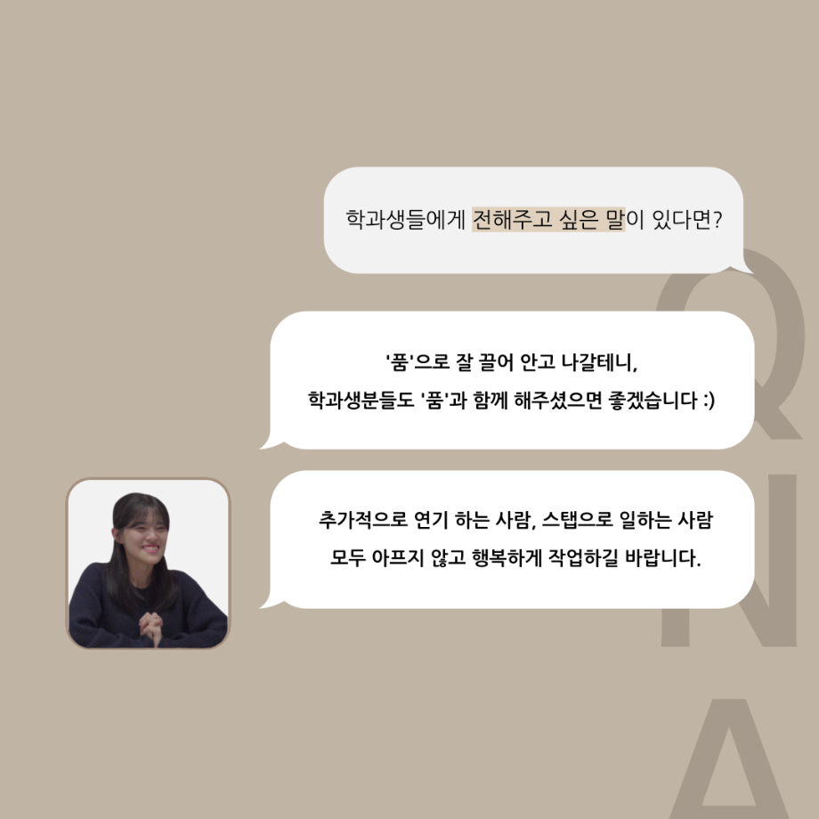 본문 시작 홈으로 커뮤니티 학과소개 입학정보 교수소개 학과과정 커뮤니티 공연예매 안내 홈페이지가이드 포토갤러리 공지사항 포토갤러리 작품DB 동아리 학사일정 학생회 포토갤러리 페이스북 트위터 프린트 '품'위있는 인'터뷰' - 24년도 부학회장 <최가람> 연기예술학과 3306 2024-07-10 안녕하십니까. 24년도 학회 ‘품‘ 입니다. 학회 ‘품’의 두 번째 인터뷰로 세명대학교 연기예술학과 24학년도 부학회장인 최가람 학우와 인터뷰 하는 시간을 가졌습니다. 부학회장으로서의 각오, 방향성 그리고 학과생에게 전하고 싶은 말과 학회에게 남기는 메세지 등을 질문하는 시간을 가졌습니다. 앞으로 있을 인터뷰 컨텐츠인 ‘품터뷰’ 많은 사랑 부탁드립니다. 목록 이전2024학년도 하계방학 진로, 취업 LMS 특강 다음 '품'위있는 인'터뷰' - 24년도 극장장 <이종화> 담당부서 : 연기예술학과 담당자 : - 연락처 : 043-649-1733 최종수정일 : 2024-10-26 만족도조사 만족도 조사 이 페이지에서 제공하는 정보에 대하여 만족하시나요? 매우만족 만족 보통 불만족 매우불만족