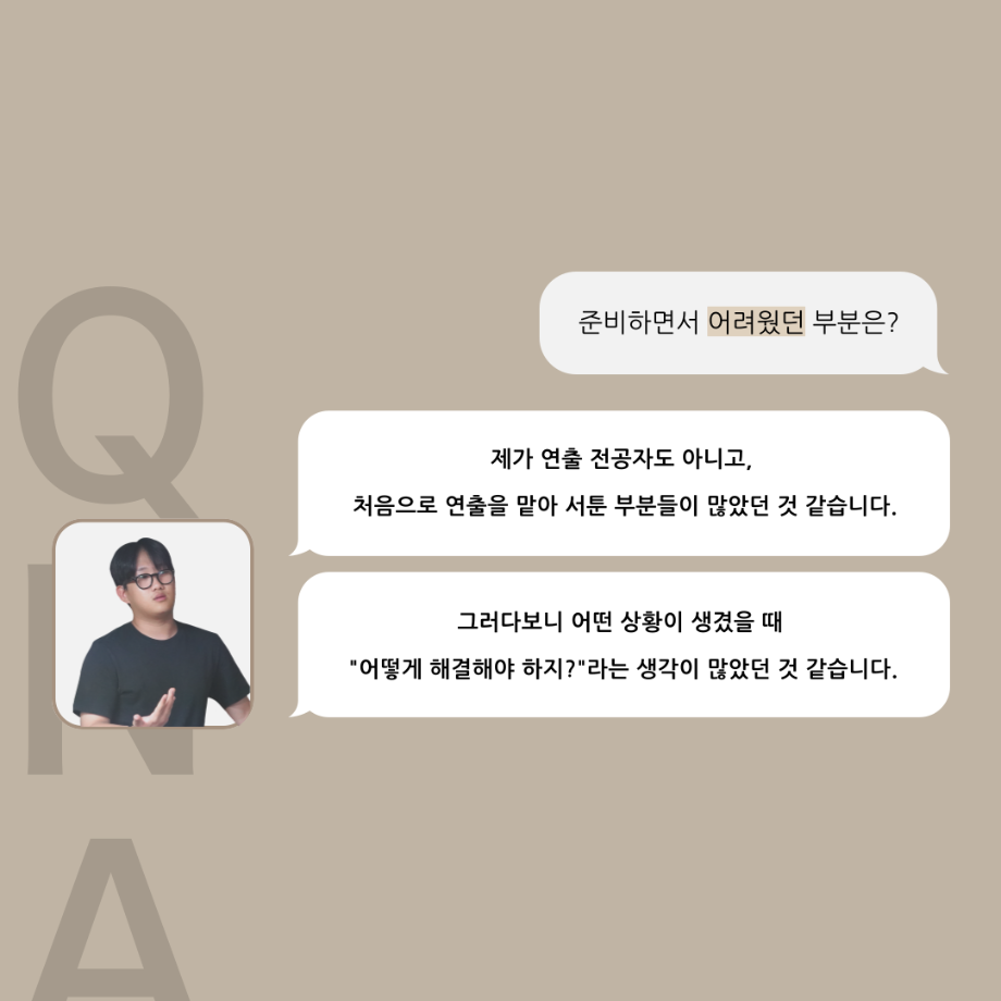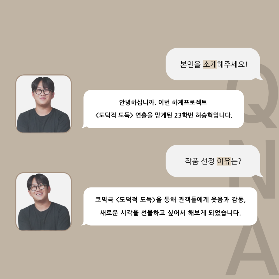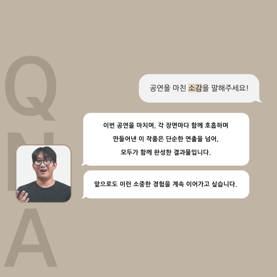 본문 시작 홈으로 커뮤니티 학과소개 입학정보 교수소개 학과과정 커뮤니티 공연예매 안내 홈페이지가이드 포토갤러리 공지사항 포토갤러리 작품DB 동아리 학사일정 학생회 포토갤러리 페이스북 트위터 프린트 '품'위있는 인‘터뷰’ - 24년도 하계프로젝트 학생 연출 <허승혁> 연기예술학과 3314 2024-09-11 안녕하십니까. 24년도 학회 ‘품’ 입니다. 학회 ‘품’의 열 세 번째 인터뷰로 세명대학교 연기예술학과 하계프로젝트 <도덕적도둑>의 학생 연출 허승혁 학우와 인터뷰 하는 시간을 가졌습니다. 작품 선정 이유부터 아끼는 장면, 연출하면서 가장 중요하게 생각했던 장면과 작품을 준비하면서 어려웠던 부분에 대해 알 수 있는 시간을 가졌습니다. 앞으로 있을 인터뷰 컨텐츠인 ‘품터뷰’ 많은 사랑 부탁드립니다. 목록 이전2024학년도 2학기 디지털홍보서포터즈 추가 모집 안내 다음 논문통계분석 LIVE 특강 안내 담당부서 : 연기예술학과 담당자 : - 연락처 : 043-649-1733 최종수정일 : 2024-10-26 만족도조사 만족도 조사 이 페이지에서 제공하는 정보에 대하여 만족하시나요? 매우만족 만족 보통 불만족 매우불만족