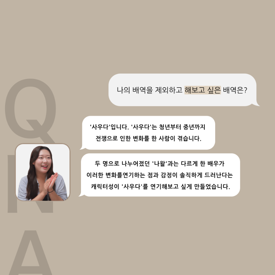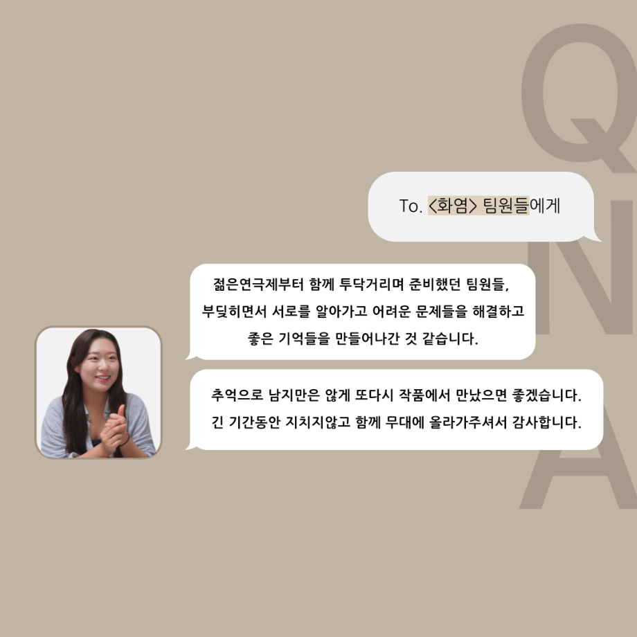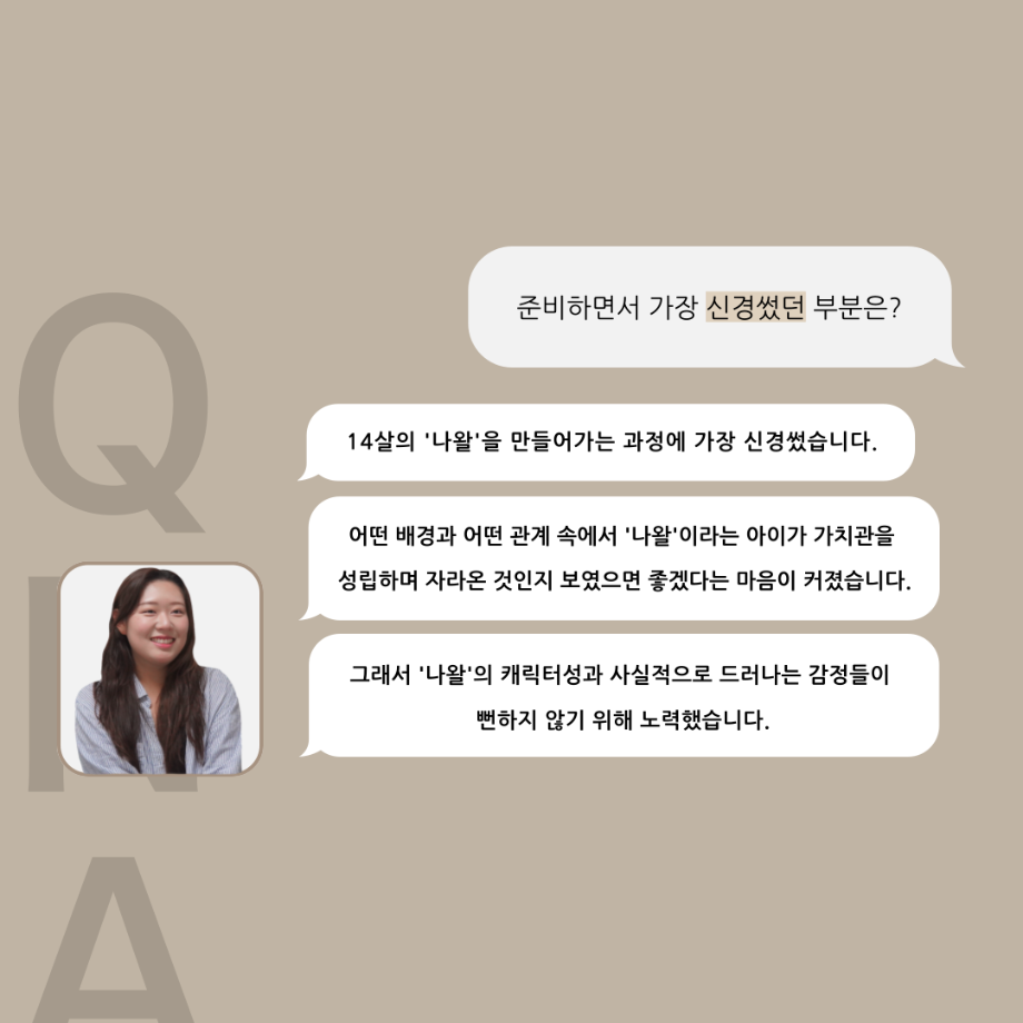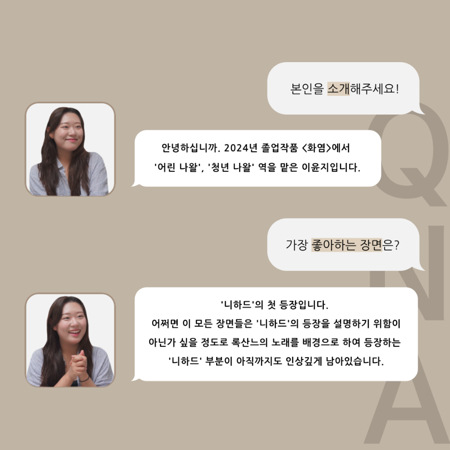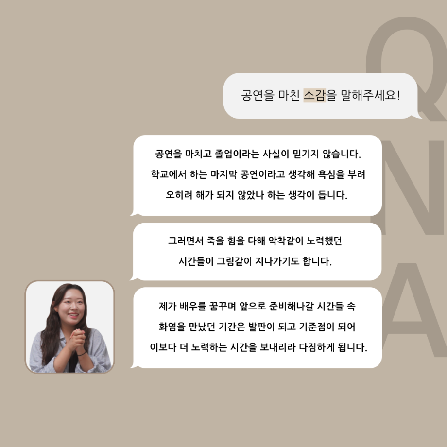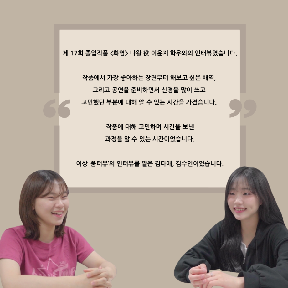 본문 시작 홈으로 커뮤니티 학과소개 입학정보 교수소개 학과과정 커뮤니티 공연예매 안내 홈페이지가이드 포토갤러리 공지사항 포토갤러리 작품DB 동아리 학사일정 학생회 포토갤러리 페이스북 트위터 프린트 ‘품’위있는 인‘터뷰’ - 24년도 졸업작품 어린나왈 役 <이윤지> 연기예술학과 3207 2024-12-19 안녕하십니까. 24년도 학회 ‘품’ 입니다. 학회 ‘품’의 열 일곱 번째 인터뷰로 세명대학교 연기예술학과 제 17회 졸업작품 <화염>의 어린 나왈 역인 이윤지 학우와 인터뷰 하는 시간을 가졌습니다. 가장 좋아하는 장면, 자신의 배역을 제외하고 해보고 싶은 배역 그리고 준비하면서 어려웠던 부분과 공연을 마친 소감 등에 대해 인터뷰 하는 시간을 가졌습니다. 앞으로 있을 인터뷰 컨텐츠인 ‘품터뷰’ 많은 사랑 부탁드립니다. 목록 이전세명대학교 연기예술학과 종강총회 다음 ‘품’위있는 인‘터뷰’ - 24년도 졸업작품 르벨 役 <정성주> 담당부서 : 연기예술학과 담당자 : - 연락처 : 043-649-1733 최종수정일 : 2024-10-26 만족도조사 만족도 조사 이 페이지에서 제공하는 정보에 대하여 만족하시나요? 매우만족 만족 보통 불만족 매우불만족