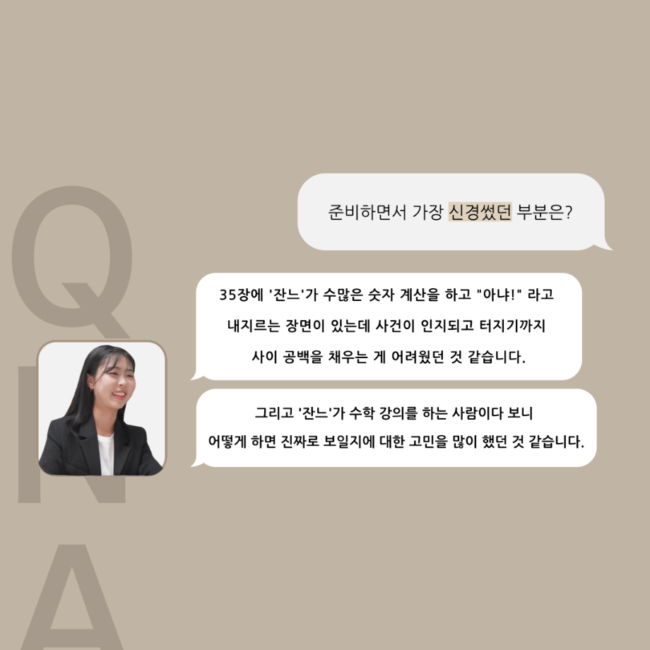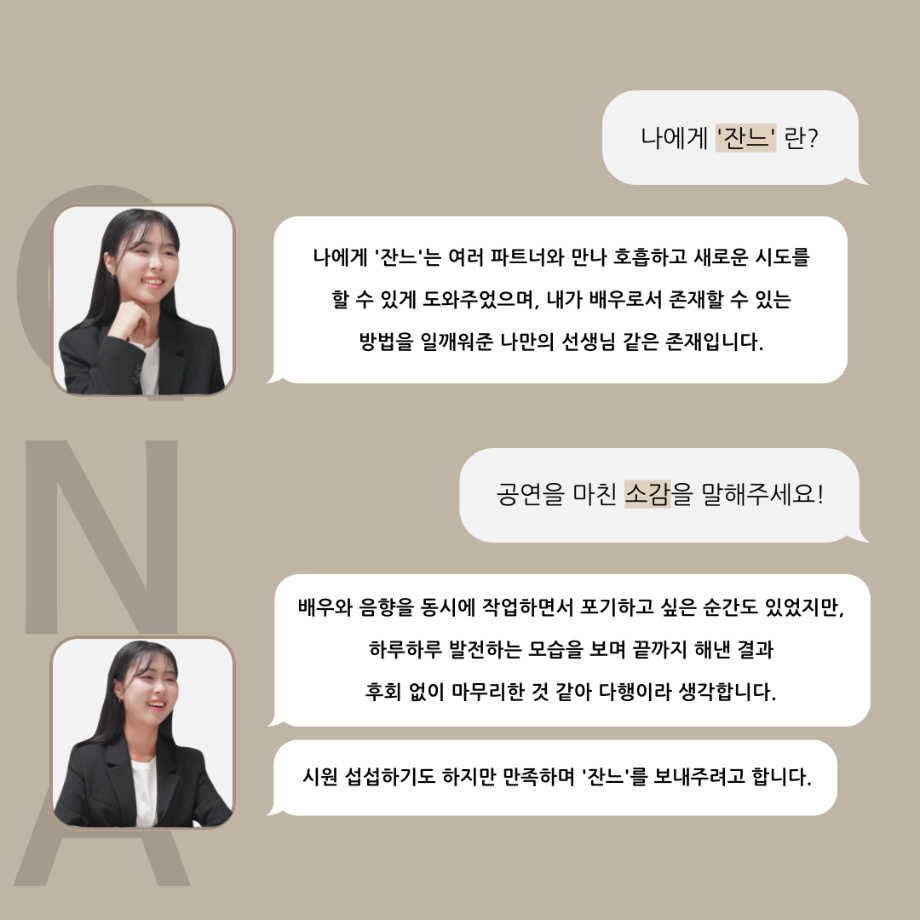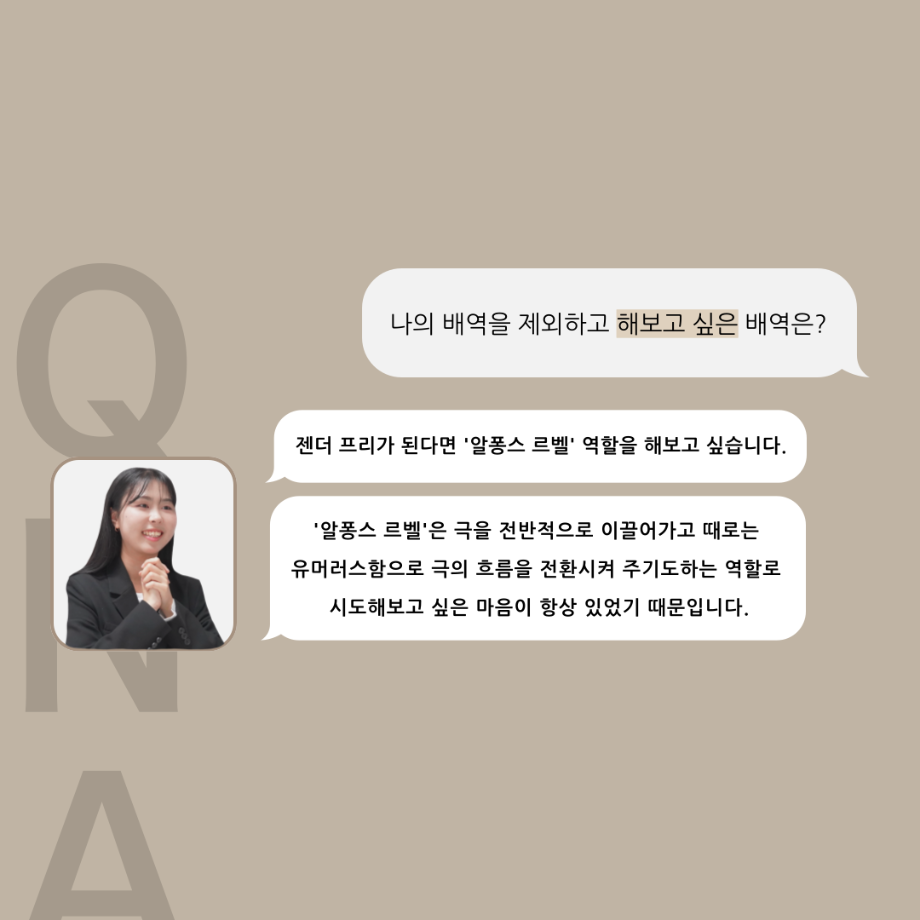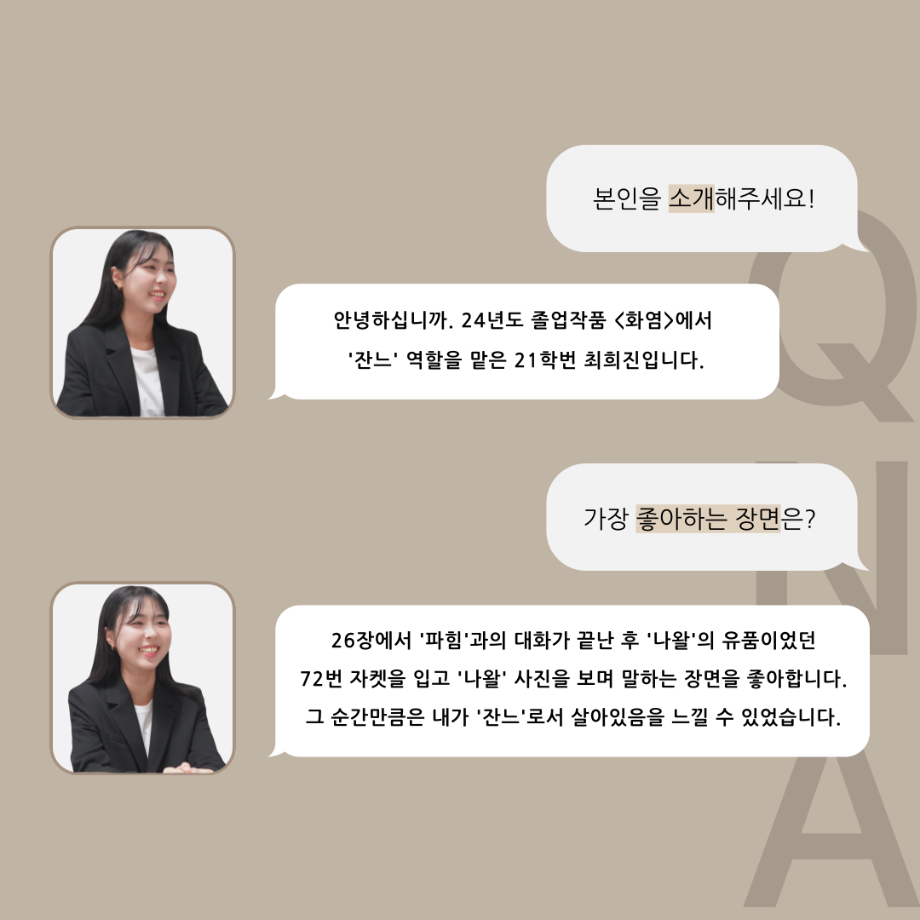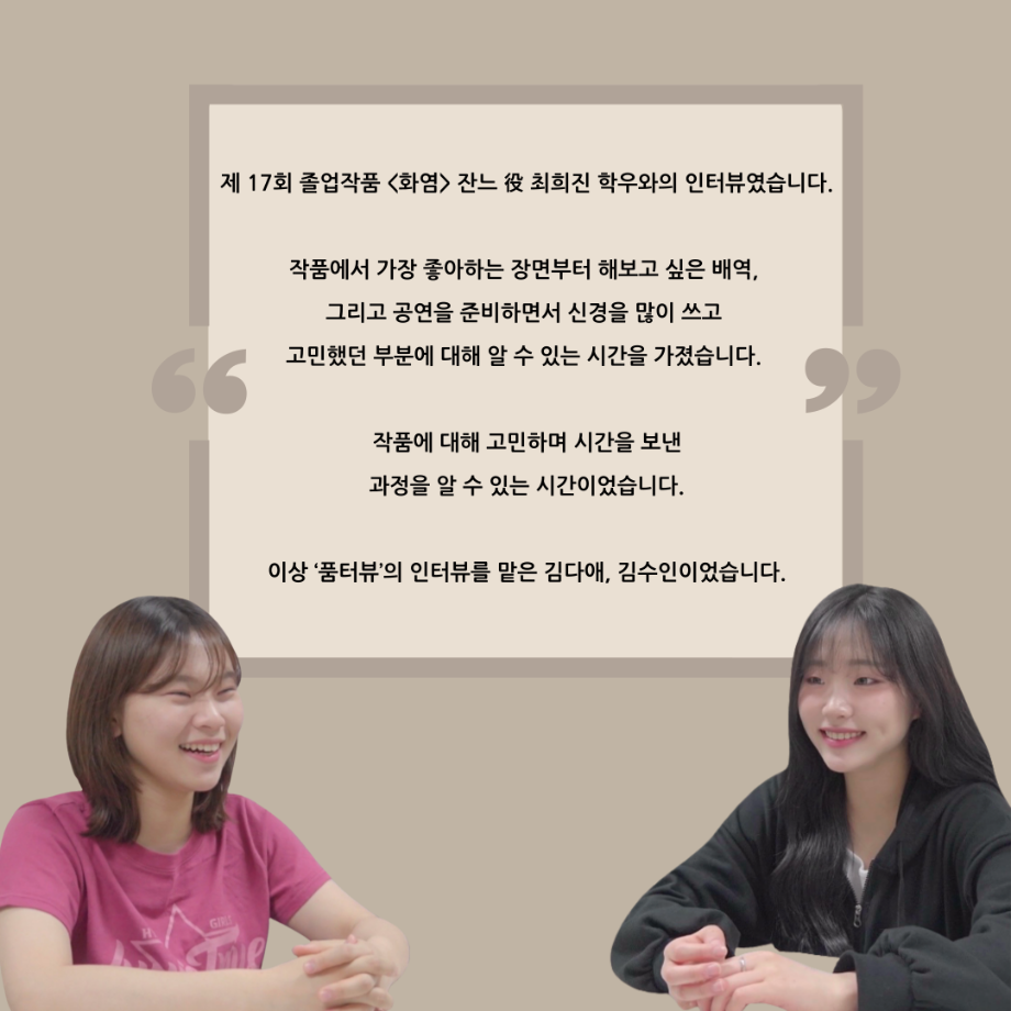 본문 시작 홈으로 커뮤니티 학과소개 입학정보 교수소개 학과과정 커뮤니티 공연예매 안내 홈페이지가이드 포토갤러리 공지사항 포토갤러리 작품DB 동아리 학사일정 학생회 포토갤러리 페이스북 트위터 프린트 ‘품’위있는 인‘터뷰’ - 24년도 졸업작품 잔느 役 <최희진> 연기예술학과 3343 2024-12-23 안녕하십니까. 24년도 학회 ‘품’ 입니다. 학회 ‘품’의 열 아홉 번째 인터뷰로 세명대학교 연기예술학과 제 17회 졸업작품 <화염>의 잔느 역인 최희진 학우와 인터뷰 하는 시간을 가졌습니다. 가장 좋아하는 장면, 자신의 배역을 제외하고 해보고 싶은 배역 그리고 준비하면서 어려웠던 부분과 공연을 마친 소감 등에 대해 인터뷰 하는 시간을 가졌습니다. 앞으로 있을 인터뷰 컨텐츠인 ‘품터뷰’ 많은 사랑 부탁드립니다. 목록 이전‘품’위있는 인‘터뷰’ - 24년도 졸업작품 르벨 役 <정성주> 다음 ‘품’위있는 인‘터뷰’ - 24년도 졸업작품 시몽 役 <이종화> 담당부서 : 연기예술학과 담당자 : - 연락처 : 043-649-1733 최종수정일 : 2024-10-26 만족도조사 만족도 조사 이 페이지에서 제공하는 정보에 대하여 만족하시나요? 매우만족 만족 보통 불만족 매우불만족