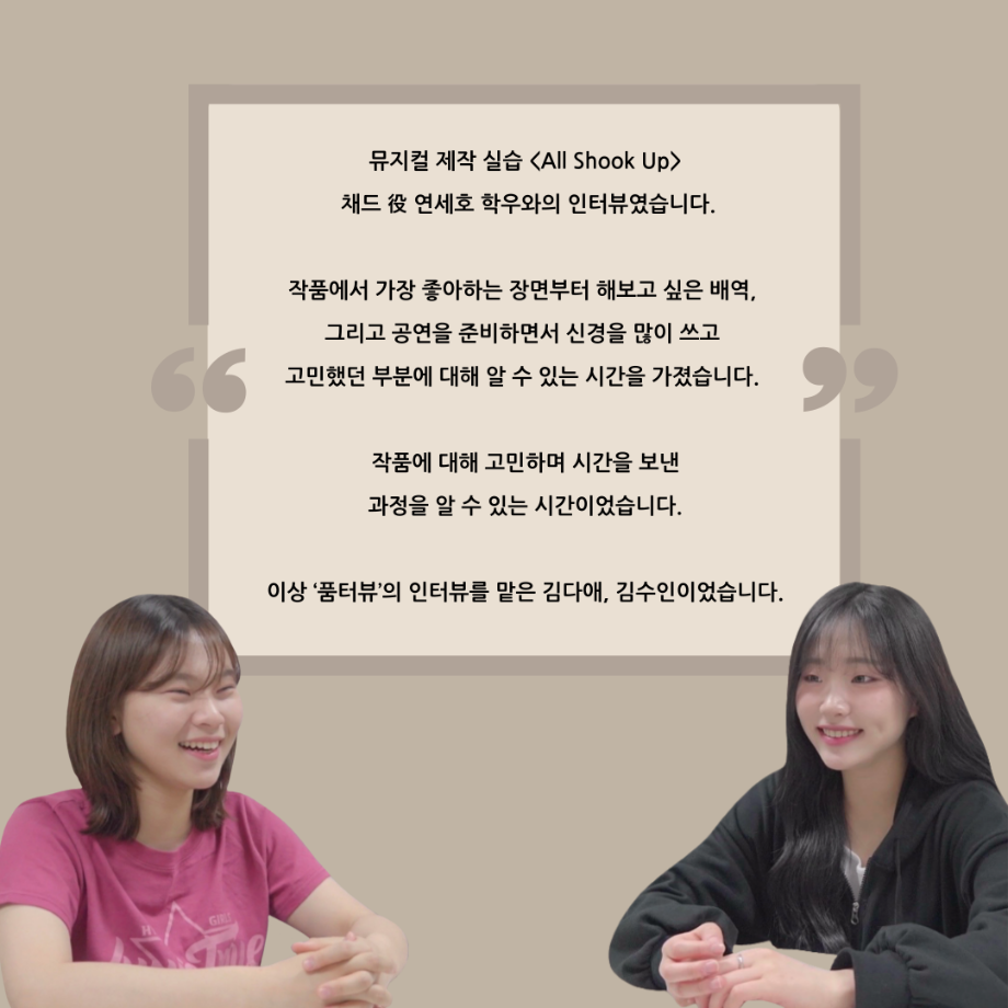 본문 시작 홈으로 커뮤니티 학과소개 입학정보 교수소개 학과과정 커뮤니티 공연예매 안내 홈페이지가이드 포토갤러리 공지사항 포토갤러리 작품DB 동아리 학사일정 학생회 포토갤러리 페이스북 트위터 프린트 ‘품’ 위 있는 인 ‘터뷰’ - 뮤지컬 제작실습 <올슉업> 채드 연세호 카드 뉴스 연기예술학과 2554 2025-01-10 . 목록 이전‘품’위있는 인‘터뷰’ - 24년도 뮤지컬제작실습 학생 연출 <임소정> 다음 ‘품’ 위 있는 인 ‘터뷰’ - 뮤지컬 제작실습 <올슉업> 나탈리 안수연 카드 뉴스 담당부서 : 연기예술학과 담당자 : - 연락처 : 043-649-1733 최종수정일 : 2024-10-26 만족도조사 만족도 조사 이 페이지에서 제공하는 정보에 대하여 만족하시나요? 매우만족 만족 보통 불만족 매우불만족
