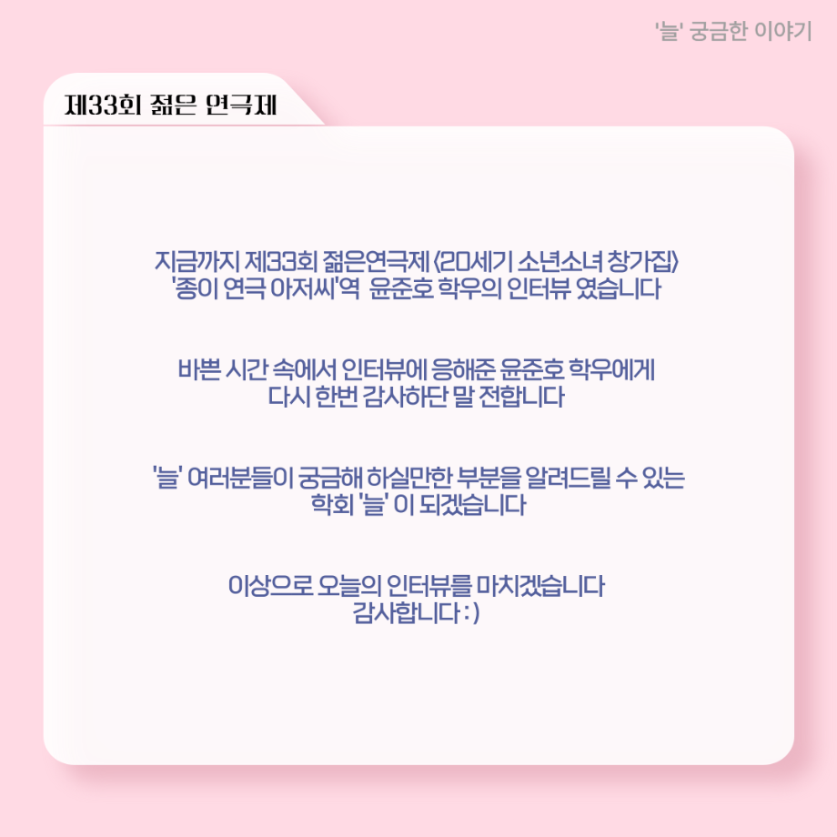 본문 시작 홈으로 커뮤니티 학과소개 입학정보 교수소개 학과과정 커뮤니티 공연예매 안내 홈페이지가이드 포토갤러리 공지사항 포토갤러리 작품DB 동아리 학사일정 학생회 포토갤러리 페이스북 트위터 프린트 ‘늘‘ 궁금한 이야기 - 젊은연극제 ‘20세기 소년소녀 창가집’ 종이연극 아저씨 役 < 윤준호 > 연기예술학과 1381 2025-08-28 . 목록 이전‘늘‘ 궁금한 이야기 - 젊은연극제 ‘20세기 소년소녀 창가집’ 사이토 役 < 박신현 > 다음 ‘늘‘ 궁금한 이야기 - 젊은연극제 ‘20세기 소년소녀 창가집’ 다큐pd 役 < 임재완 > 담당부서 : 연기예술학과 담당자 : - 연락처 : 043-649-1733 최종수정일 : 2024-10-26 만족도조사 만족도 조사 이 페이지에서 제공하는 정보에 대하여 만족하시나요? 매우만족 만족 보통 불만족 매우불만족