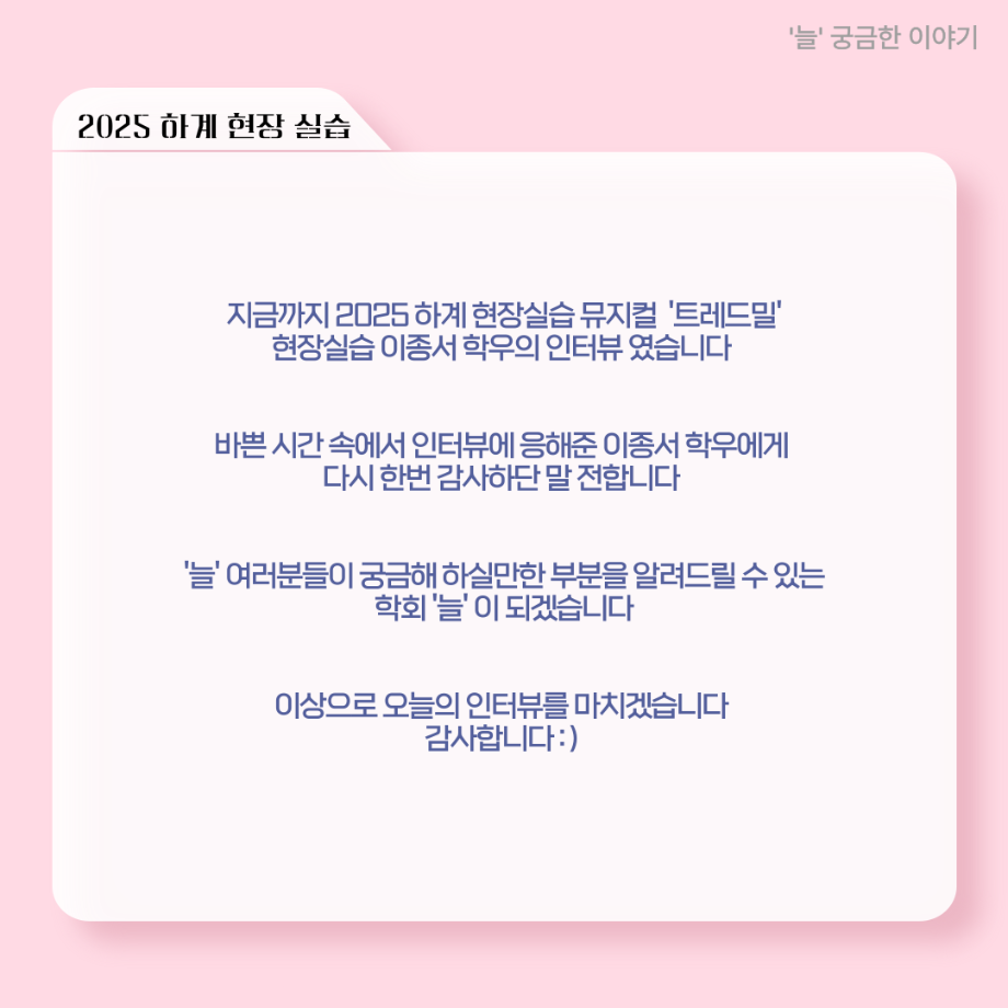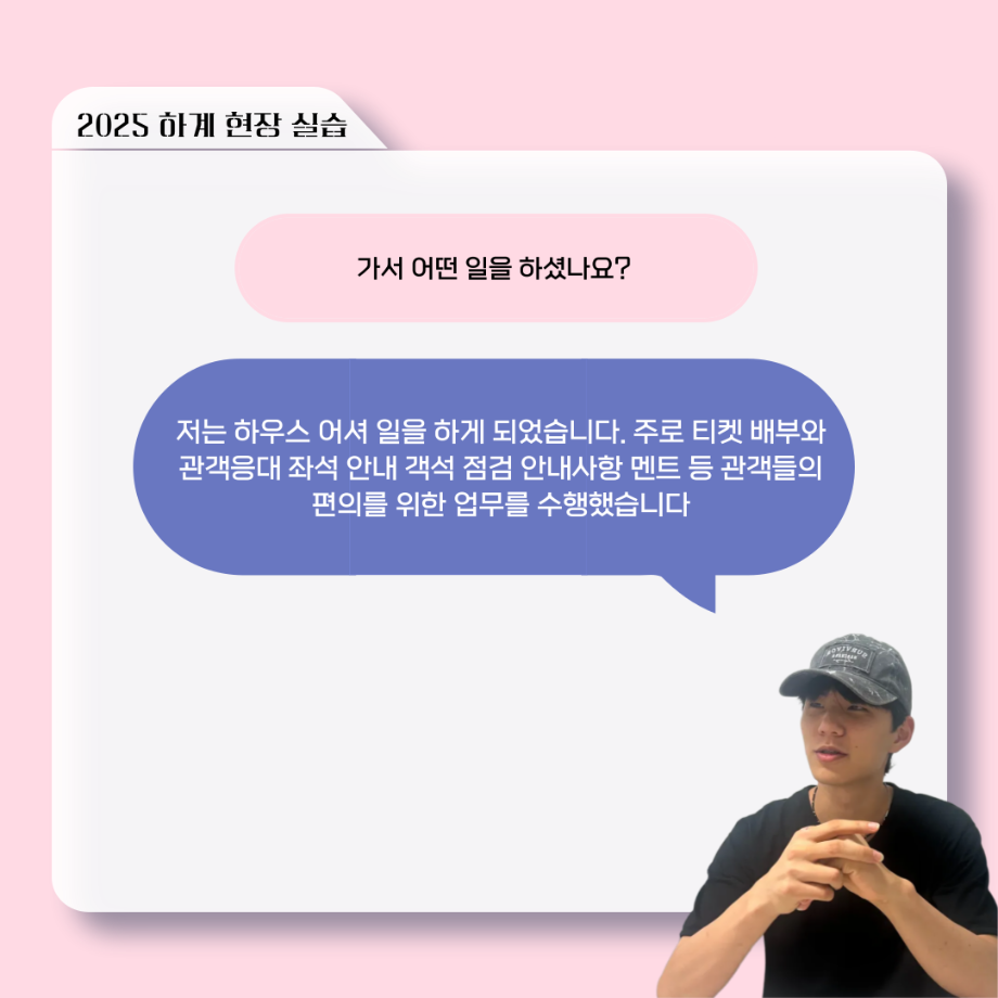본문 시작 홈으로 커뮤니티 학과소개 입학정보 교수소개 학과과정 커뮤니티 공연예매 안내 홈페이지가이드 포토갤러리 공지사항 포토갤러리 작품DB 동아리 학사일정 학생회 포토갤러리 페이스북 트위터 프린트 ‘늘‘ 궁금한 이야기 - 현장실습 < 이종서 > 연기예술학과 1346 2025-09-17 . 목록 이전‘늘‘ 궁금한 이야기 - 젊은연극제 ‘20세기 소년소녀 창가집’ 다큐pd 役 < 임재완 > 이전117회 세명대학교 연기예술학과 하계프로젝트 사랑의온도 작품소개 담당부서 : 연기예술학과 담당자 : - 연락처 : 043-649-1733 최종수정일 : 2024-10-26 만족도조사 만족도 조사 이 페이지에서 제공하는 정보에 대하여 만족하시나요? 매우만족 만족 보통 불만족 매우불만족