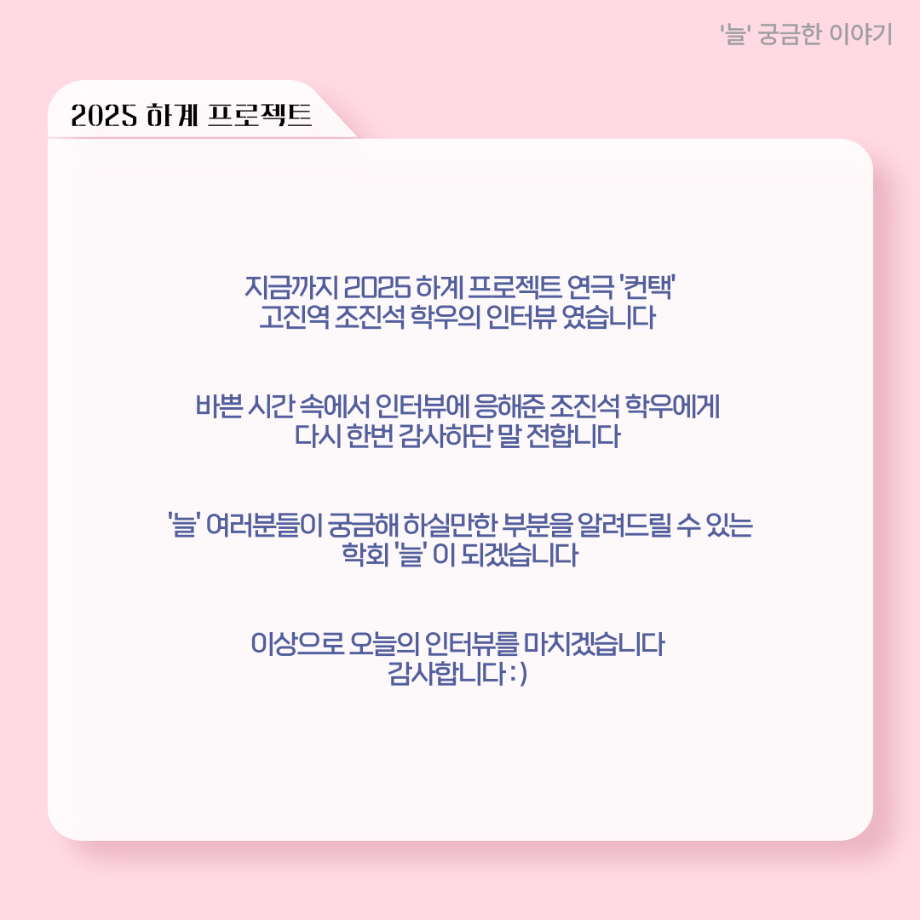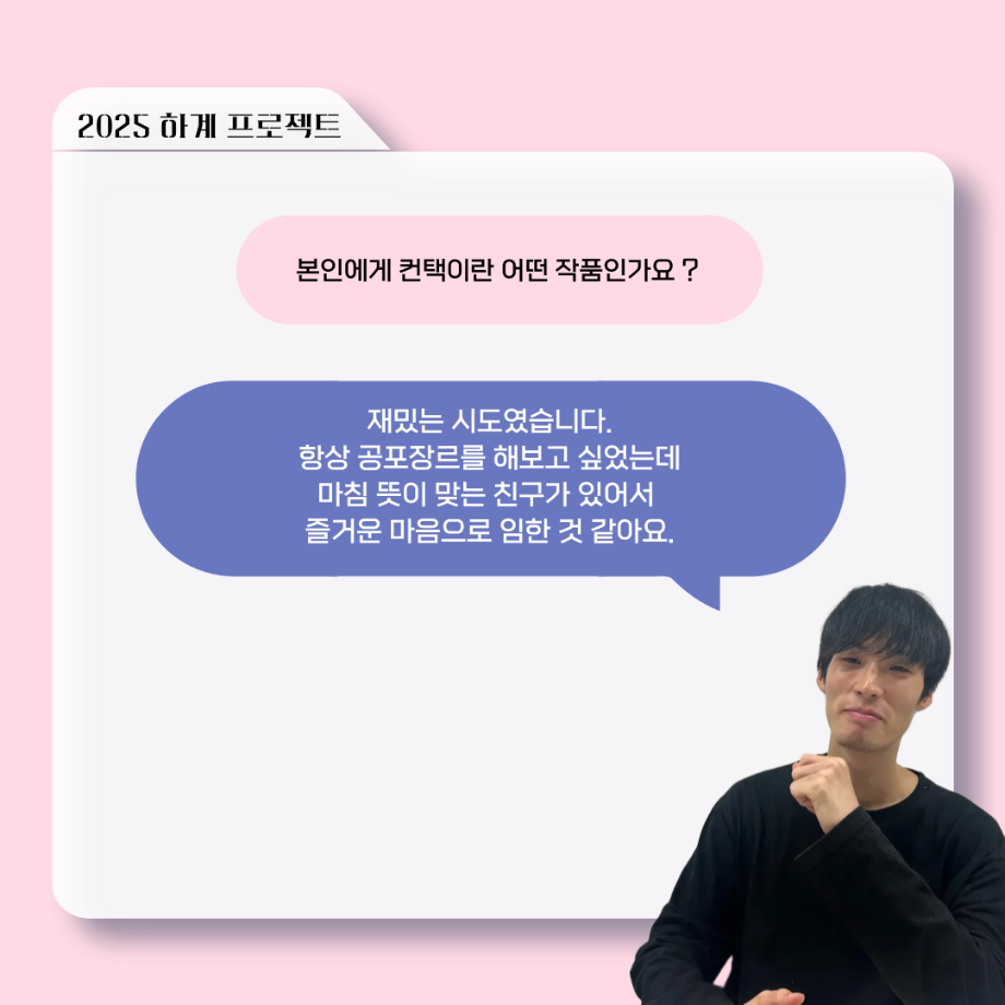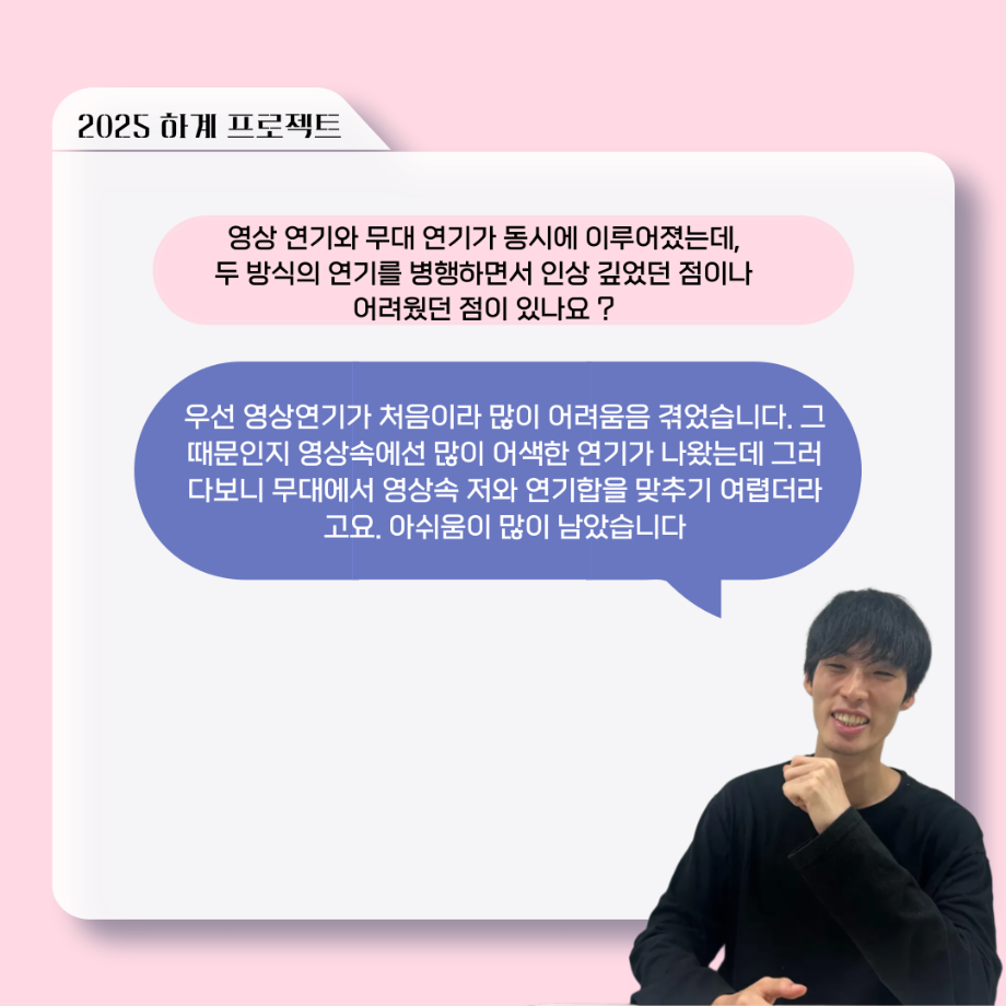 본문 시작 홈으로 커뮤니티 학과소개 입학정보 교수소개 학과과정 커뮤니티 공연예매 안내 홈페이지가이드 포토갤러리 공지사항 포토갤러리 작품DB 동아리 학사일정 학생회 포토갤러리 페이스북 트위터 프린트 ‘늘‘ 궁금한 이야기 - 하계 프로젝트 ‘컨택’팀 고진役 < 조진석 > 연기예술학과 2186 2025-10-31 . 목록 이전‘늘‘ 궁금한 이야기 - 현장실습 < 신하연 > 다음 세명대학교 연기예술학과 과체전 담당부서 : 연기예술학과 담당자 : - 연락처 : 043-649-1733 최종수정일 : 2024-10-26 만족도조사 만족도 조사 이 페이지에서 제공하는 정보에 대하여 만족하시나요? 매우만족 만족 보통 불만족 매우불만족