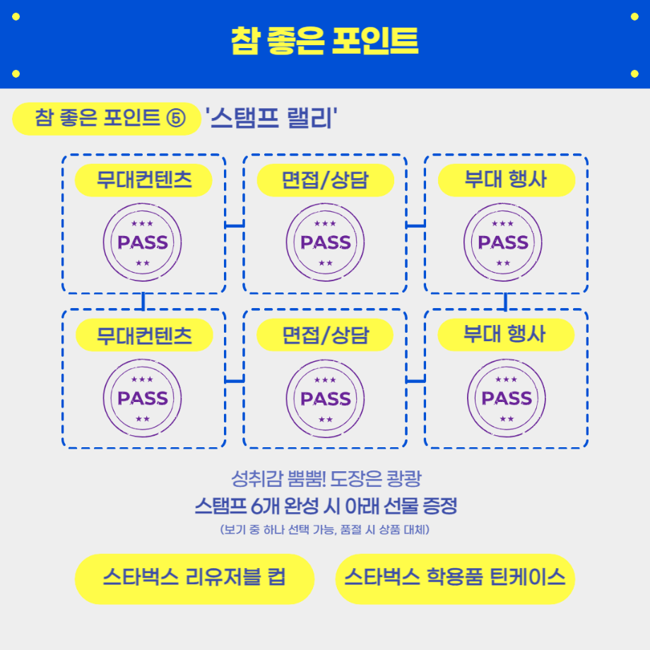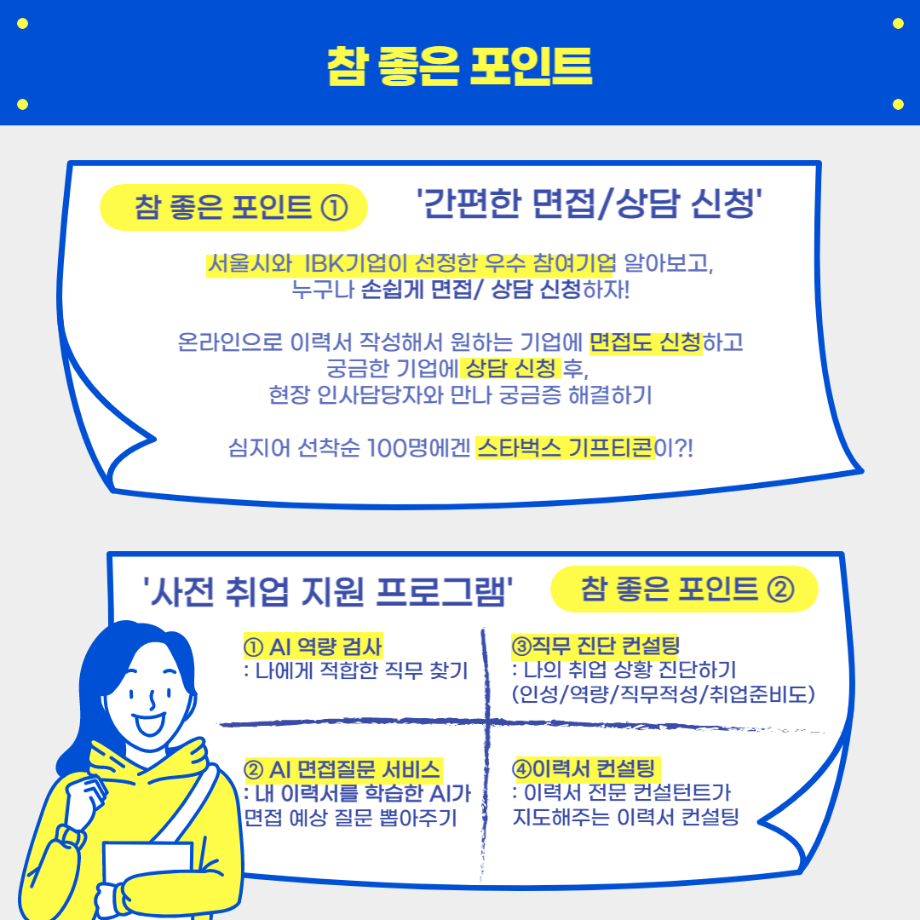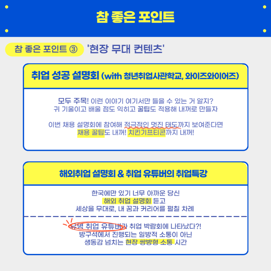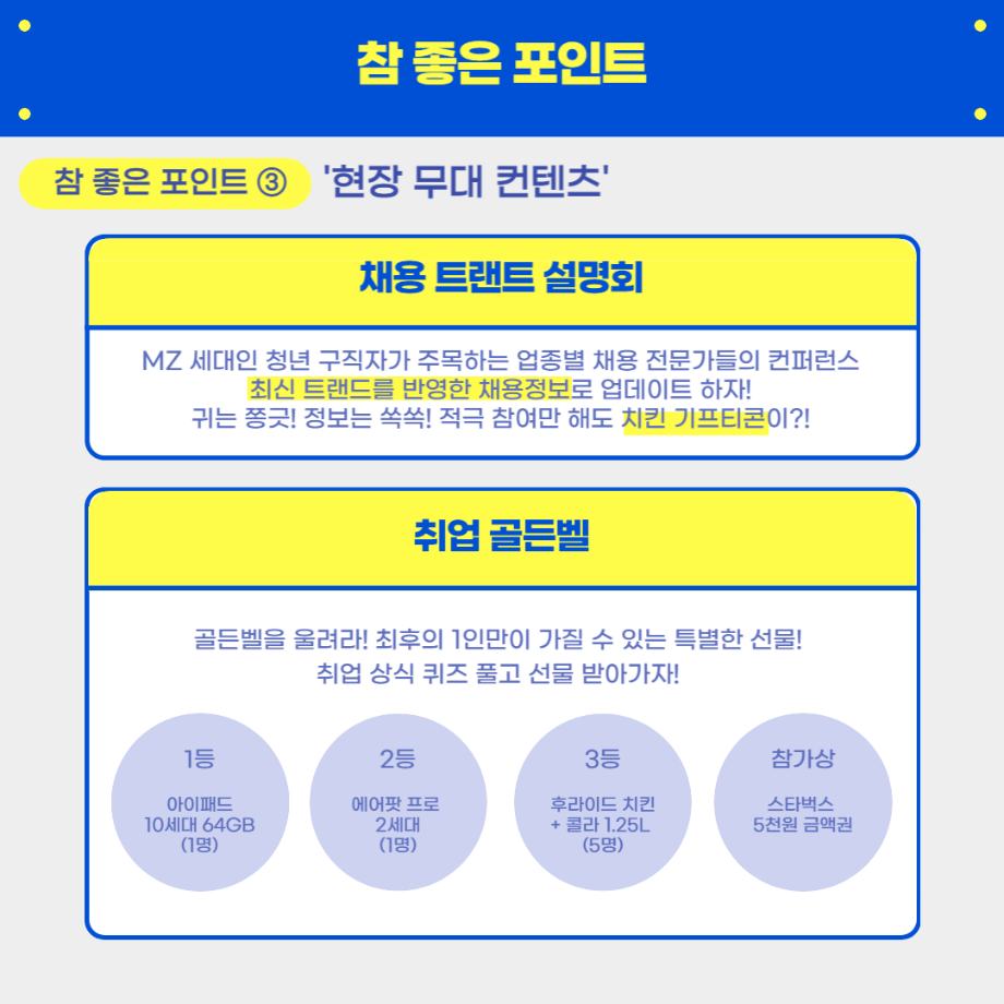 - (부대 행사) VR 모의 면접, 퍼스널 컬러진단, 캘리그라피, 취업 타로, 면접 정장 대여 등 다양한 부대 행사