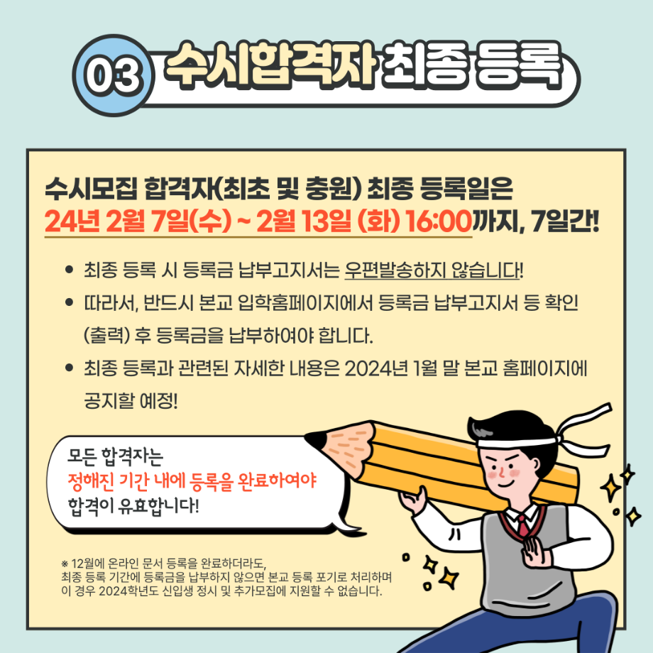본문 시작 홈으로 학과소식 학과소개 취업정보 교육과정 학과소식 홈페이지가이드 포토갤러리 공지사항 포토갤러리 학과이야기 학과행사 포토갤러리 페이스북 트위터 프린트 2024 수시 등록기간 안내 회계세무학과 1793 2023-11-30 최초 합격자 등록기간: 2023년 12월 18일 (월) ~ 2023년 12월 21일 (목) 17:00시 까지 최초 합격자 등록방법: 본교 입학홈페이지 ’입학정보통합시스템‘에서 온라인 문서 등록 수시모집 합격자(최초 및 충원) 최종 등록일: 2024년 2월 7일 (수) ~ 2024년 2월 13일 (화) 16:00시 까지 목록 이전2023 청소년을 위한 빅 콘서트 「Go, High(고-하이) 콘서트」 다음 세명대학교 2024학년도 정시모집 안내 담당부서 : 회계세무학과 담당자 : - 연락처 : 043-649-1244 최종수정일 : 2024-10-26 만족도조사 만족도 조사 이 페이지에서 제공하는 정보에 대하여 만족하시나요? 매우만족 만족 보통 불만족 매우불만족