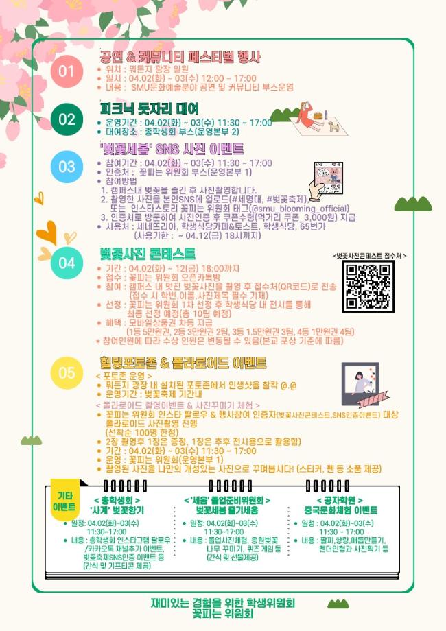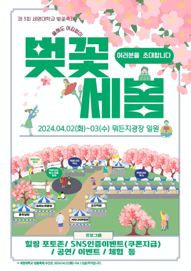 본문 시작 홈으로 학과소식 학과소개 취업정보 교육과정 학과소식 홈페이지가이드 포토갤러리 공지사항 포토갤러리 학과이야기 학과행사 포토갤러리 페이스북 트위터 프린트 🌸 제3회 벚꽃세봄 🌸 회계세무학과 1750 2024-03-29 🌸 올해도 어김없이, 제3회 벚꽃세봄 🌸 제3회 세명대학교 벚꽃축제, 벚꽃세봄에 여러분을 초대합니다! 힐링 포토존, SNS 인증 이벤트, 공연 등 다양한 프로그램과 함께 세명대학교의 벚꽃을 즐겨요🥰 💌 일자: 4월 2일(화) ~ 3일(수) 💌 장소: 뭐든지광장 일원 목록 이전제9회 커뮤니티 페스티벌 다음 [Book 콘서트] '김선태 (충TV)' Book 콘서트에 초대합니다. 담당부서 : 회계세무학과 담당자 : - 연락처 : 043-649-1244 최종수정일 : 2024-10-26 만족도조사 만족도 조사 이 페이지에서 제공하는 정보에 대하여 만족하시나요? 매우만족 만족 보통 불만족 매우불만족