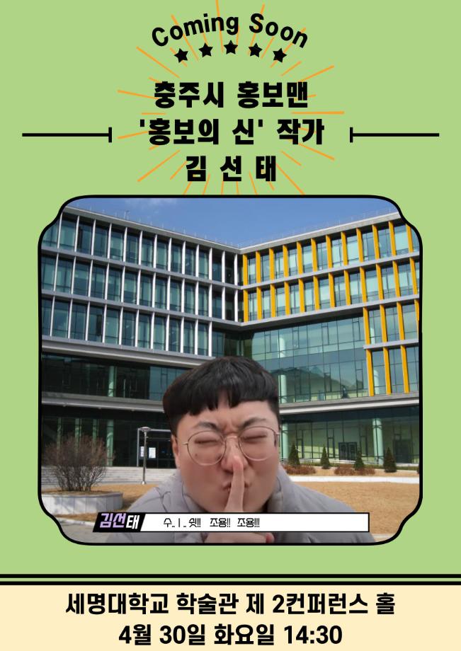 본문 시작 홈으로 학과소식 학과소개 취업정보 교육과정 학과소식 홈페이지가이드 포토갤러리 공지사항 포토갤러리 학과이야기 학과행사 포토갤러리 페이스북 트위터 프린트 [Book 콘서트] '김선태 (충TV)' Book 콘서트에 초대합니다. 회계세무학과 1697 2024-04-24 [Book 콘서트] '김선태 (충TV)' Book 콘서트에 초대합니다. 학술정보원(도서관)에서는 '김선태' 작가 (유튜브: 충주시 홍보맨)를 초청하여 북콘서트를 진행합니다. - 일시 : 2024. 4. 30. (화) 오후 2시 30분 - 장소 : 학술관 제2컨퍼런스홀 - 문의 : 043) 649-7009 / 학술정보원 많은 관심 부탁드립니다. *^^* 목록 이전🌸 제3회 벚꽃세봄 🌸 다음 세명대학교 제31회 청룡체전 담당부서 : 회계세무학과 담당자 : - 연락처 : 043-649-1244 최종수정일 : 2024-10-26 만족도조사 만족도 조사 이 페이지에서 제공하는 정보에 대하여 만족하시나요? 매우만족 만족 보통 불만족 매우불만족
