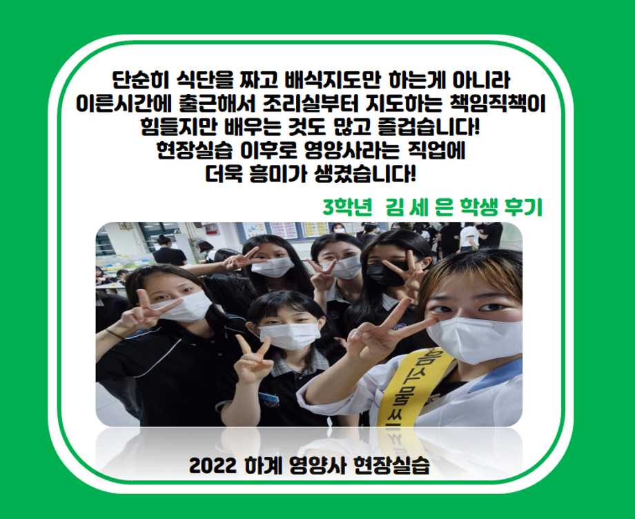 본문 시작 홈으로 커뮤니티 학부소개 진로·취업 교육과정 커뮤니티 대학원 입학상담 홈페이지가이드 갤러리 공지사항 갤러리 학생회 동문회 전공자료실 전공동아리 Youtube Instagram 갤러리 페이스북 트위터 프린트 2022 하계영양사 현장실습(동일여자고등학교) 바이오식품영양학부 1985 2022-07-13 목록 이전2022 하계영양사 현장실습(제천시청) 다음 2022 하계영양사 현장실습(목원푸드 코레일 승무원기숙식당) 담당부서 : 바이오식품영양학부 담당자 : - 연락처 : 043-649-1430 최종수정일 : 2024-10-26 만족도조사 만족도 조사 이 페이지에서 제공하는 정보에 대하여 만족하시나요? 매우만족 만족 보통 불만족 매우불만족