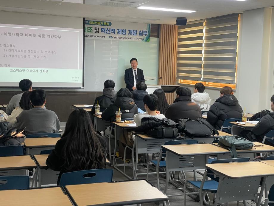 본문 시작 홈으로 커뮤니티 학부소개 진로·취업 교육과정 커뮤니티 대학원 입학상담 홈페이지가이드 갤러리 공지사항 갤러리 학생회 동문회 전공자료실 전공동아리 Youtube Instagram 갤러리 페이스북 트위터 프린트 실무체험 외부전문가 특강: 진호정 대표(코스맥스펫) 바이오식품영양학부 895 2025-12-04 실무체험교과목 "건강기능식품개발및실습" 특강 1) 강사: 진호정 대표(코스맥스펫) 2) 주제: '산업 현장에서의 건강기능식품 제조 및 혁신적 제형 개발 실무' 3) 일시 및 장소: 12월 3일, 바이오학관302호 *특강을 통해 현장 실무과 취업 및 연구동향에 대해 자세히 강의해 주신 진호정 대표님께 감사드립니다. 목록 이전2025 자기설계 해외배낭연수(7/8~7/15, 호주) 다음 [교과목안내] AI기반식품QAQC 담당부서 : 바이오식품영양학부 담당자 : - 연락처 : 043-649-1430 최종수정일 : 2024-10-26 만족도조사 만족도 조사 이 페이지에서 제공하는 정보에 대하여 만족하시나요? 매우만족 만족 보통 불만족 매우불만족