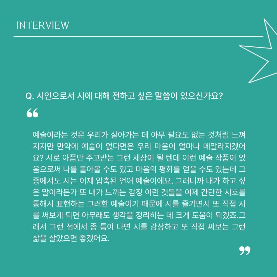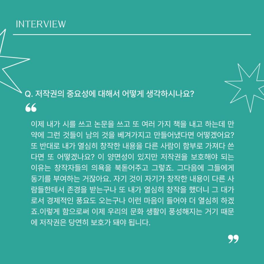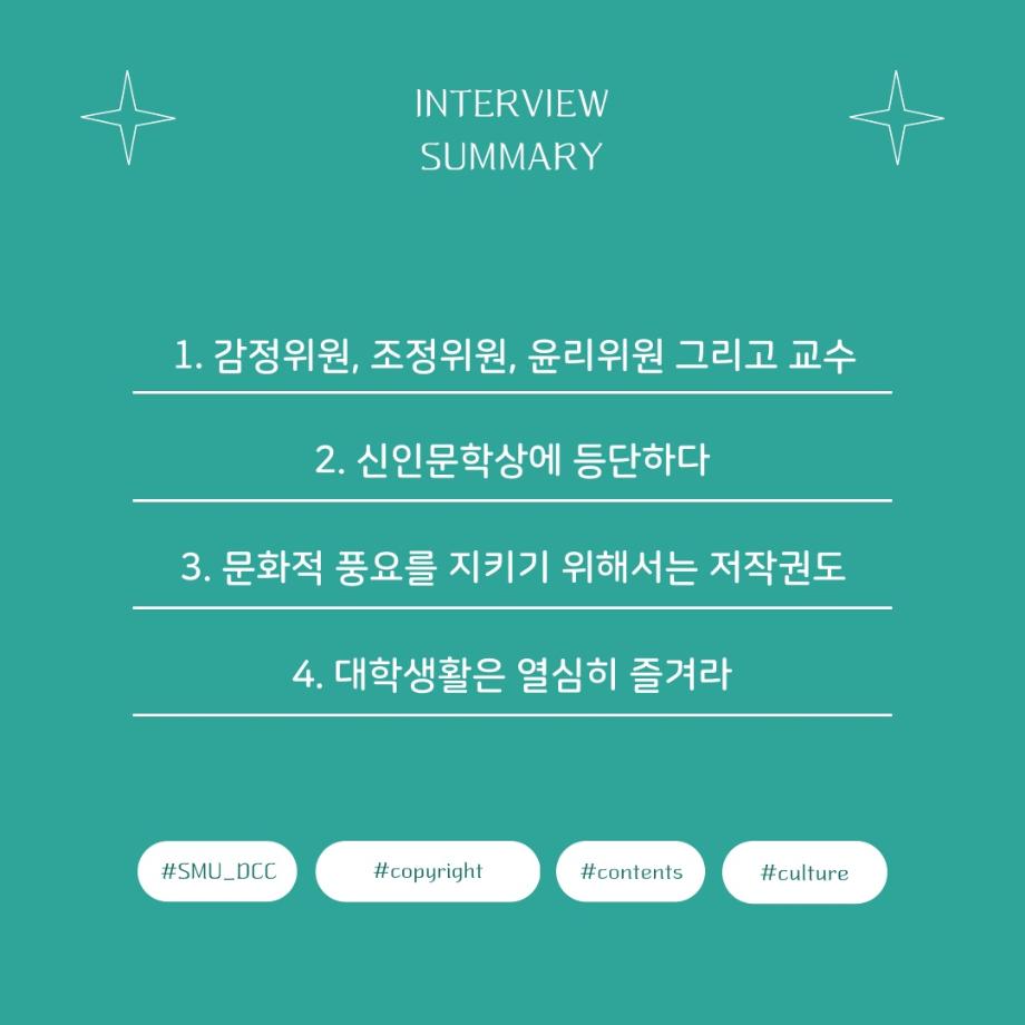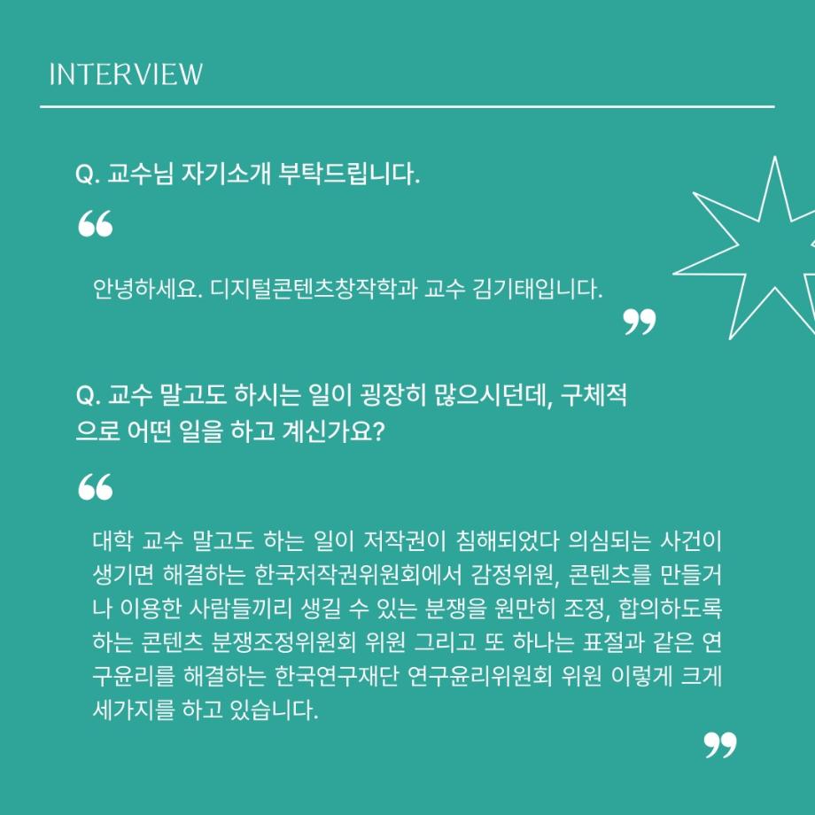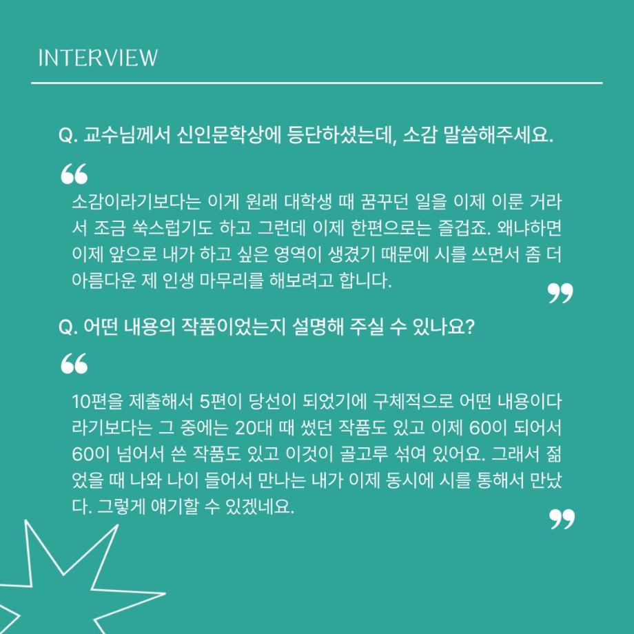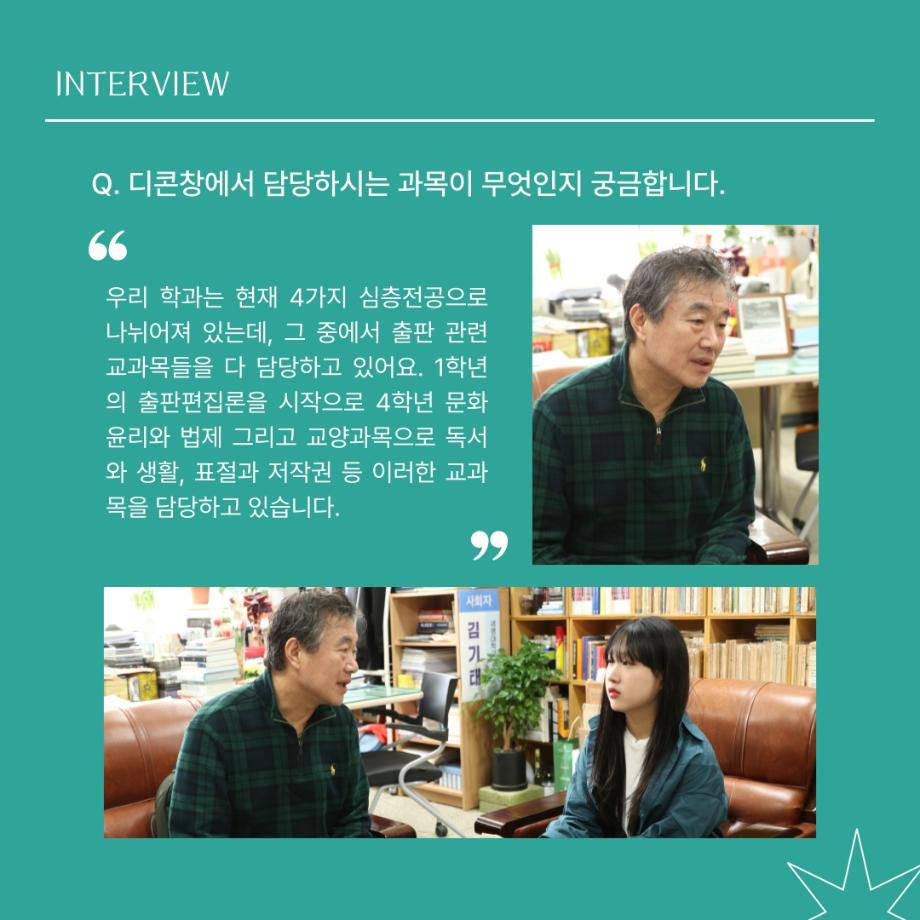 본문 시작 홈으로 MCC News 학과소개 교수소개 학과과정 MCC News MCC SNS 홈페이지가이드 교수 및 졸업생 학과 및 재학생 교수 및 졸업생 미디어 정보통 교수 및 졸업생 페이스북 트위터 프린트 디지털콘텐츠창작학과 김기태 교수님 인터뷰 📸 디지털콘텐츠창작학과 2439 2024-04-24 한국 저작권에서 빼놓을 수 없는 인물이자 중견 문예지 ‘계간 시현실’에 2024 신인문학상에 당선되어 신인 시인이 되신 김기태 교수님을 모시고 인터뷰했습니다. 다양한 활동을 해오신 김기태 교수님의 한 말씀 우리 함께 들어봐요! 목록 이전디지털콘텐츠창작학과 권화숙 교수님 인터뷰 📸 다음 📚디지털콘텐츠창작학과 권화숙 교수님 저자 동화책 소개📚 담당부서 : 미디어콘텐츠창작학과 담당자 : - 연락처 : 043-649-1741 최종수정일 : 2024-10-26 만족도조사 만족도 조사 이 페이지에서 제공하는 정보에 대하여 만족하시나요? 매우만족 만족 보통 불만족 매우불만족