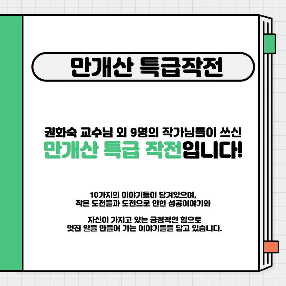 권화숙 교수님 외 9명의 작가님들이 쓰신 청개구리와 울보 너튜버 속 만개산 특급 작전입니다. 10가지의 이야기들이 담겨있으며 작은 도전들과 도전으로 인한 성공이야기, 자신이 가지고 있는 긍정적인 힘으로 멋진 일을 만들어 가는 이야기들을 담고 있습니다.