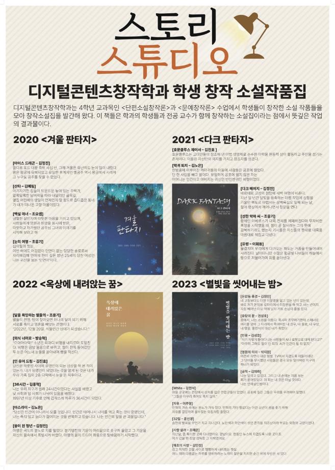 본문 시작 홈으로 MCC News 학과소개 교수소개 학과과정 MCC News MCC SNS 홈페이지가이드 교수 및 졸업생 학과 및 재학생 교수 및 졸업생 미디어 정보통 교수 및 졸업생 페이스북 트위터 프린트 디지털콘텐츠창작학과 학생 창작 소설작품집 디지털콘텐츠창작학과 2614 2024-05-16 디지털콘텐츠창작학과는 4학년 교과목인 <단편소설창작론>과 <문예창작론> 수업에서 학생들이 창작한 소설 작품들을 모아 창작소설집을 발간해왔습니다. 이 책들은 학과의 학생들과 전공 교수가 함께 창작하는 소설집이라는 첨에서 뜻깊은 작업의 결과물입니다. 2020<겨울 판타지> 2021<다크 판타지> 2022<옥상에 내려앉는 꿈> 2023<별빛을 씻어내는 밤> 이렇게 총 4권의 책들이 있는데요 4권 모두 훌륭한 작품성을 띠고있으니 한 번씩 읽어보시는 것 어떨까요? 목록 이전📚디지털콘텐츠창작학과 권화숙 교수님 저자 동화책 소개📚 다음 권화숙 교수님의 5월 신간 소개 담당부서 : 미디어콘텐츠창작학과 담당자 : - 연락처 : 043-649-1741 최종수정일 : 2024-10-26 만족도조사 만족도 조사 이 페이지에서 제공하는 정보에 대하여 만족하시나요? 매우만족 만족 보통 불만족 매우불만족