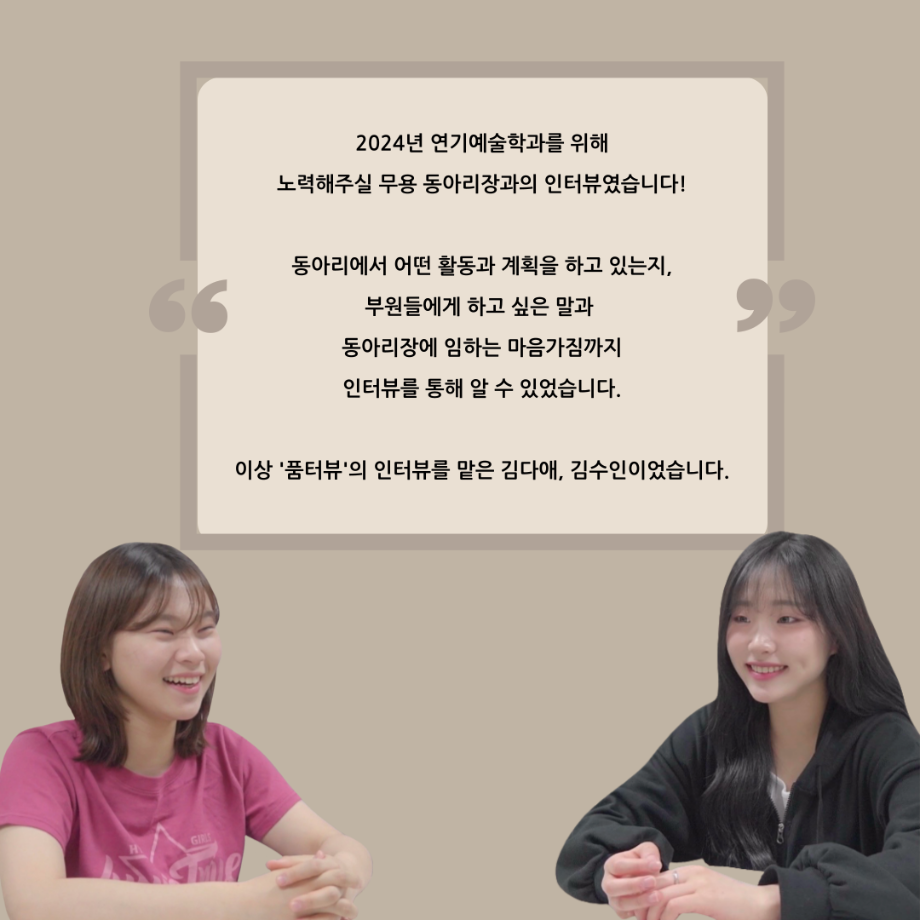 본문 시작 홈으로 커뮤니티 학과소개 입학정보 교수소개 학과과정 커뮤니티 공연예매 안내 홈페이지가이드 동아리 공지사항 포토갤러리 작품DB 동아리 학사일정 학생회 무용 동아리 무용 동아리 뮤지컬 동아리 극장 스탭 동아리 배우 훈련 동아리 무용 동아리 페이스북 트위터 프린트 '품'위있는 인'터뷰' - 24년도 무용동아리장 <윤샘> 연기예술학과 3475 2024-07-29 안녕하십니까. 24년도 학회 ‘품‘ 입니다. 학회 ‘품’의 일곱 번째 인터뷰로 세명대학교 연기예술학과 24학년도 무용동아리장인 윤샘 학우와 인터뷰 하는 시간을 가졌습니다. 무용 동아리장이 된 계기와 동아리에서는 어떤 활동을 하고있는지, 앞으로의 계획은 무엇으며 동아리 부원들에게 전하고 싶은 말 등을 질문하는 시간을 가졌습니다. 앞으로 있을 인터뷰 컨텐츠인 ‘품터뷰’ 많은 사랑 부탁드립니다. 목록 이전2024년도 1학기 무용동아리 - 화란 활동! 다음 2025년도 1학기 무용동아리 화란 만족도조사 만족도 조사 이 페이지에서 제공하는 정보에 대하여 만족하시나요? 매우만족 만족 보통 불만족 매우불만족