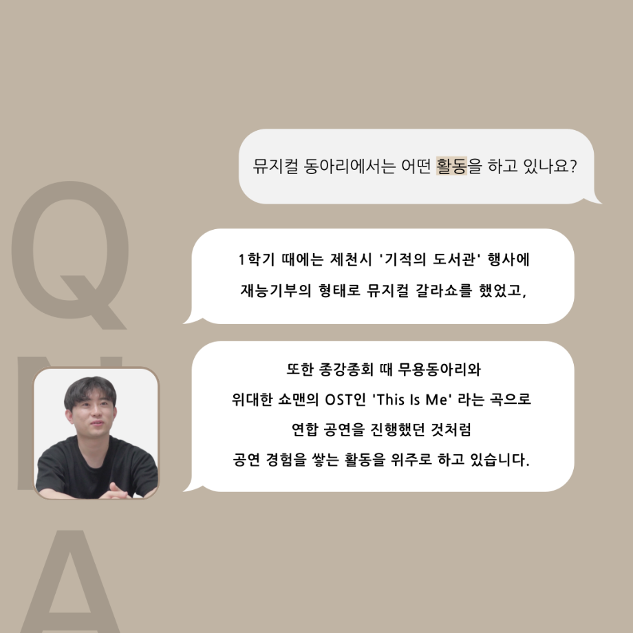 본문 시작 홈으로 커뮤니티 학과소개 입학정보 교수소개 학과과정 커뮤니티 공연예매 안내 홈페이지가이드 동아리 공지사항 포토갤러리 작품DB 동아리 학사일정 학생회 뮤지컬 동아리 무용 동아리 뮤지컬 동아리 극장 스탭 동아리 배우 훈련 동아리 뮤지컬 동아리 페이스북 트위터 프린트 '품'위있는 인’터뷰‘ - 24년도 뮤지컬동아리장 <정찬홍> 연기예술학과 2885 2024-07-31 안녕하십니까. 24년도 학회 ‘품‘ 입니다. 학회 ‘품’의 여덟 번째 인터뷰로 세명대학교 연기예술학과 24학년도 뮤지컬동아리장인 정찬홍 학우와 인터뷰 하는 시간을 가졌습니다. 뮤지컬 동아리장이 된 계기와 동아리에서는 어떤 활동을 하고있는지, 앞으로의 계획은 무엇으며 동아리 부원들에게 전하고 싶은 말 등을 질문하는 시간을 가졌습니다. 앞으로 있을 인터뷰 컨텐츠인 ‘품터뷰’ 많은 사랑 부탁드립니다. 목록 이전🎼 뮤지컬 동아리 “기적의 도서관” 갈라쇼 다음 2024학년도 2학기 뮤지컬 동아리 '음악;音樂' 활동 만족도조사 만족도 조사 이 페이지에서 제공하는 정보에 대하여 만족하시나요? 매우만족 만족 보통 불만족 매우불만족