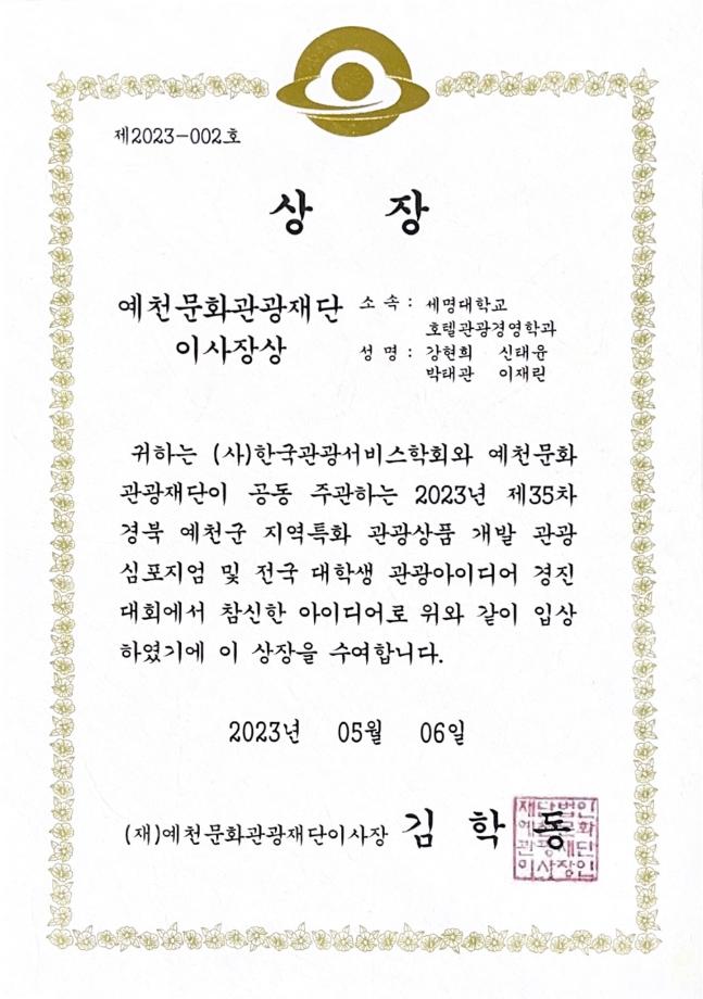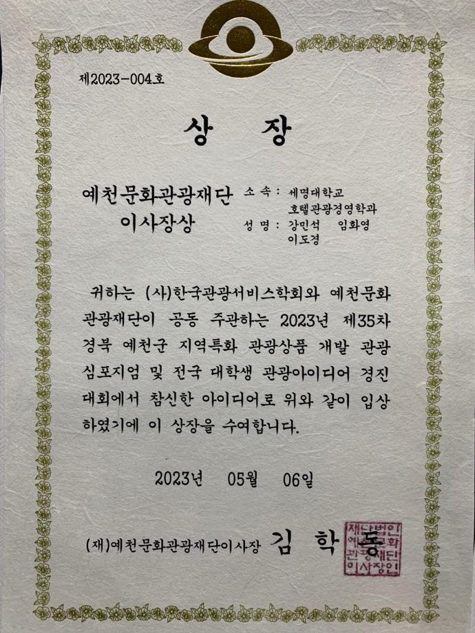본문 시작 홈으로 커뮤니티 커뮤니티 학과소개 교육 홈페이지가이드 학과동아리 공지사항 학생회활동 학과동아리 취업정보 Idea Bank Idea Bank SOW 빵실빵실 쉐이커스 Idea Bank 페이스북 트위터 프린트 2023년 1학기 공모전 수상 호텔경영학과 2448 2023-05-15 2023년 1학기 공모전 수상 목록 이전2023년 1학기 동아리 활동사진 다음 2023년 2학기 동아리 활동 1 만족도조사 만족도 조사 이 페이지에서 제공하는 정보에 대하여 만족하시나요? 매우만족 만족 보통 불만족 매우불만족
