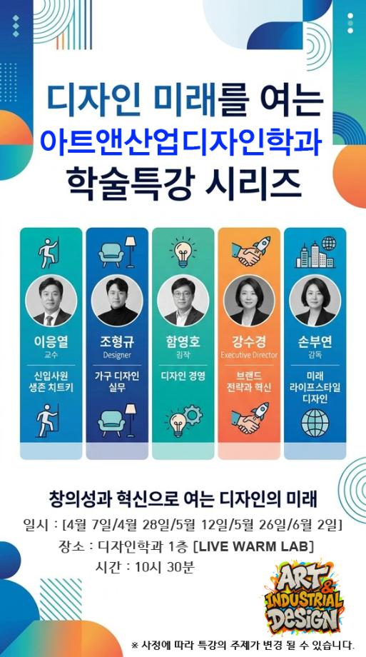 본문 시작 홈으로 학과생활 학과소개 교수소개 교과과정 학과생활 홈페이지가이드 학과행사 공지사항 사진게시판 전공자료실 동아리 학과행사 학과행사 페이스북 트위터 프린트 [학술특강] 2026학년도 1학기 학술특강 계획 아트앤산업디자인학과 27 2026-04-22 목록 이전[특강] 산업디자인 실무체험 학술특강 [가구디자인실무 &취업가이드] 만족도조사 만족도 조사 이 페이지에서 제공하는 정보에 대하여 만족하시나요? 매우만족 만족 보통 불만족 매우불만족