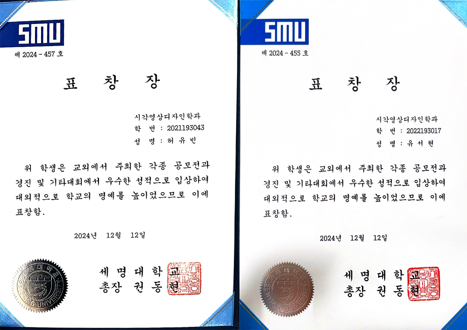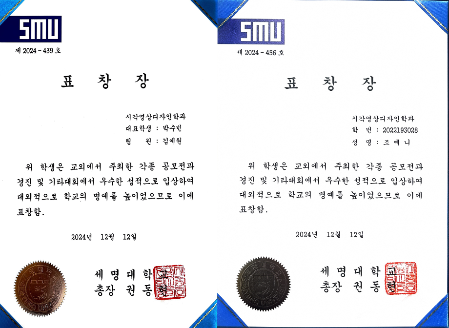 본문 시작 홈으로 시영소식 학과소개 학과과정 시영소식 입학/취업 AI 학과자랑 SNS소통 홈페이지가이드 학과행사 공지사항 학과행사 공모전 학생 인터뷰 학과행사 페이스북 트위터 프린트 2024학년도 2학기 총장표창 수여식 시각영상디자인학과 1821 2024-12-20 우리학과에서 5명이 대외수상 분야로 수상하였습니다 축하합니다~ 4학년 - 김예원, 허유빈, 박수빈 3학년 - 조예니, 유서현 목록 이전세명고 전공체험(12.18.수) 다음 AI 콘텐츠연구소 전시 안내 담당부서 : 시각영상디자인학과 담당자 : - 연락처 : 043-649-1726 최종수정일 : 2024-10-26 만족도조사 만족도 조사 이 페이지에서 제공하는 정보에 대하여 만족하시나요? 매우만족 만족 보통 불만족 매우불만족