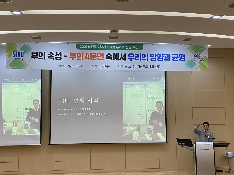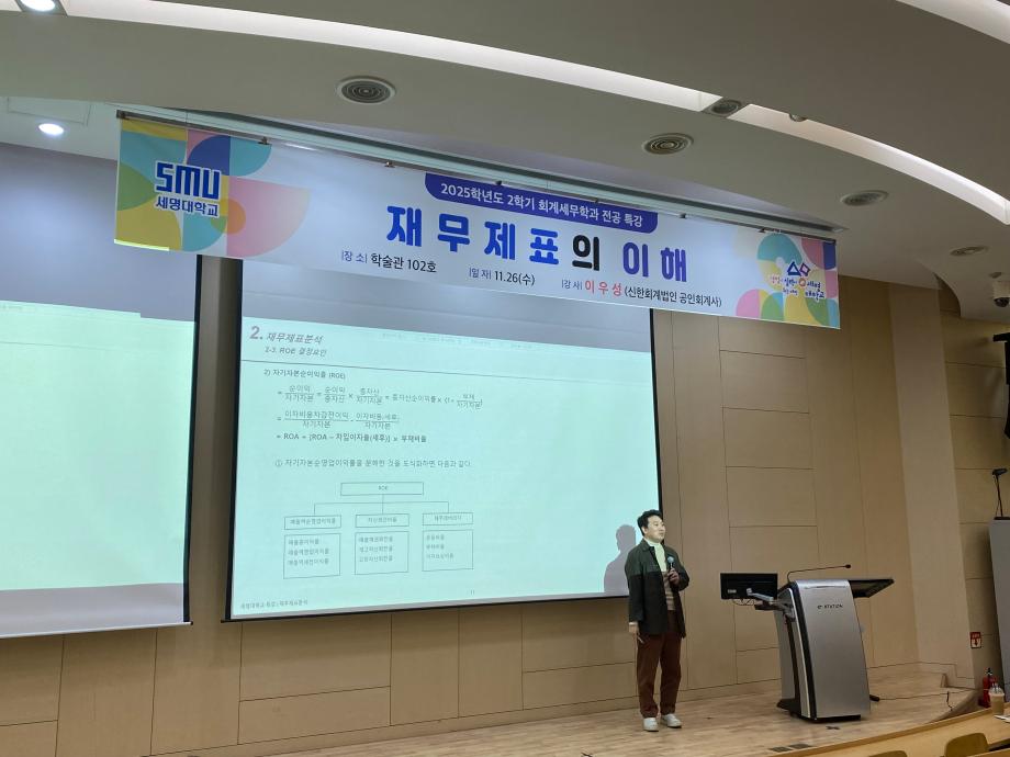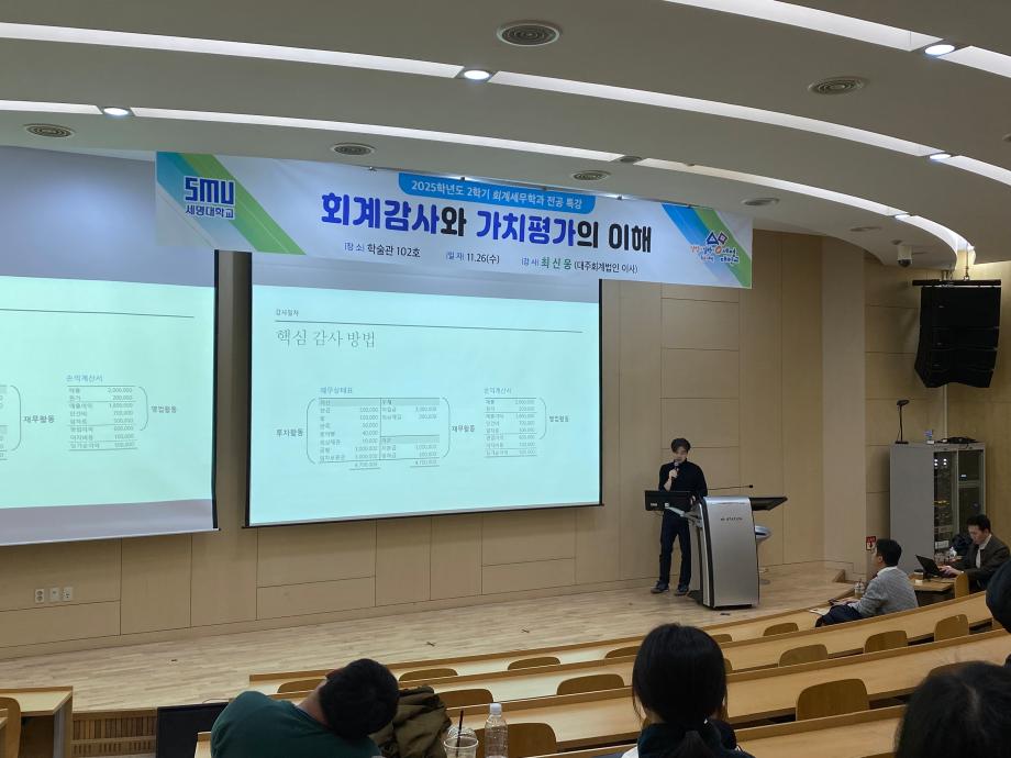 본문 시작 홈으로 학과소식 학과소개 취업정보 교육과정 학과소식 홈페이지가이드 학과행사 공지사항 포토갤러리 학과이야기 학과행사 학과행사 페이스북 트위터 프린트 2025학년도 2학기 회계세무학과 전공특강 회계세무금융학과 309 2025-11-27 2025학년도 2학기 회계세무학과 전공특강을 진행하였습니다~! 목록 이전2025학년도 2학기 회계세무학과 전문가 특강 다음 회계세무학과 종강총회 만족도조사 만족도 조사 이 페이지에서 제공하는 정보에 대하여 만족하시나요? 매우만족 만족 보통 불만족 매우불만족