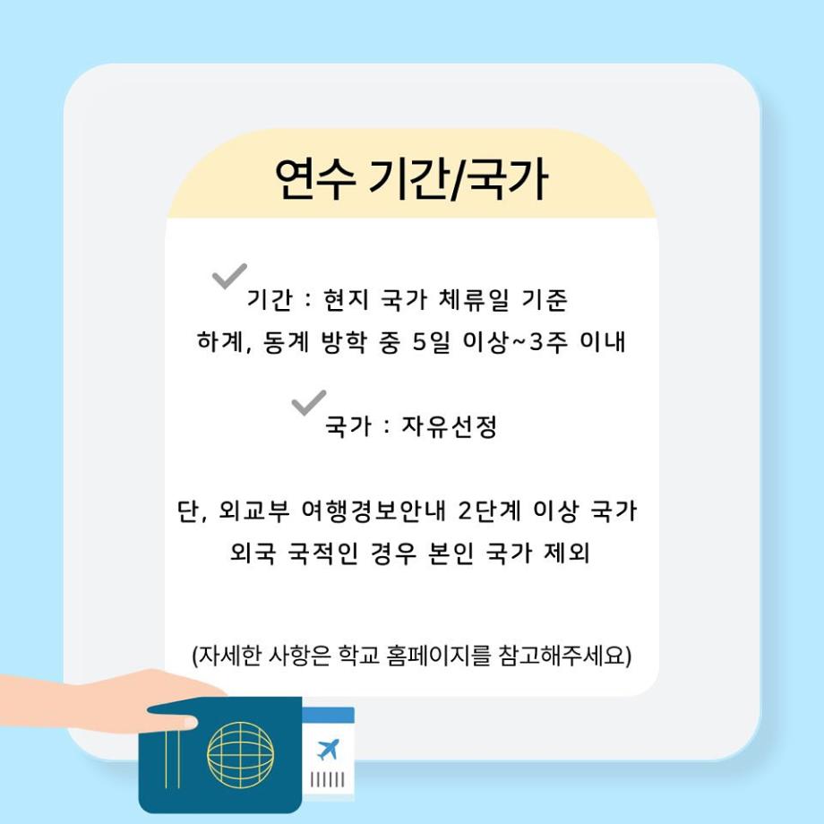 연수기간은 현지 국가 체류일 기준 5일 ~ 21일까지입니다! (하계, 동계방학 중)