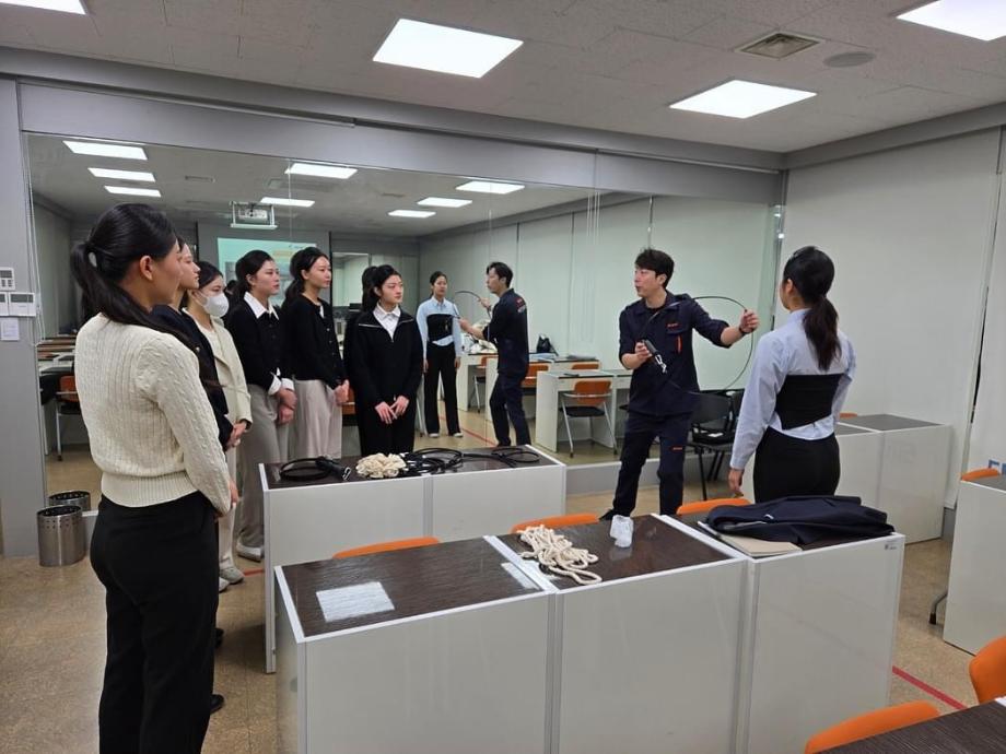 ➰ 이번 제주항공 에듀윙 Advanced Program을 통해 호신술과 기내에서 난동 부리는 승객을 구금할 수 있는 보안장비 사용방법에 대해 자세히 배울 수 있었고 실제 면접관이신 객실기획팀장님께 면접에 대한 꿀팁을 얻을 수 있어서 재학생들이 아주 의미 있는 시간을 보낼 수 있었습니다 🧡
