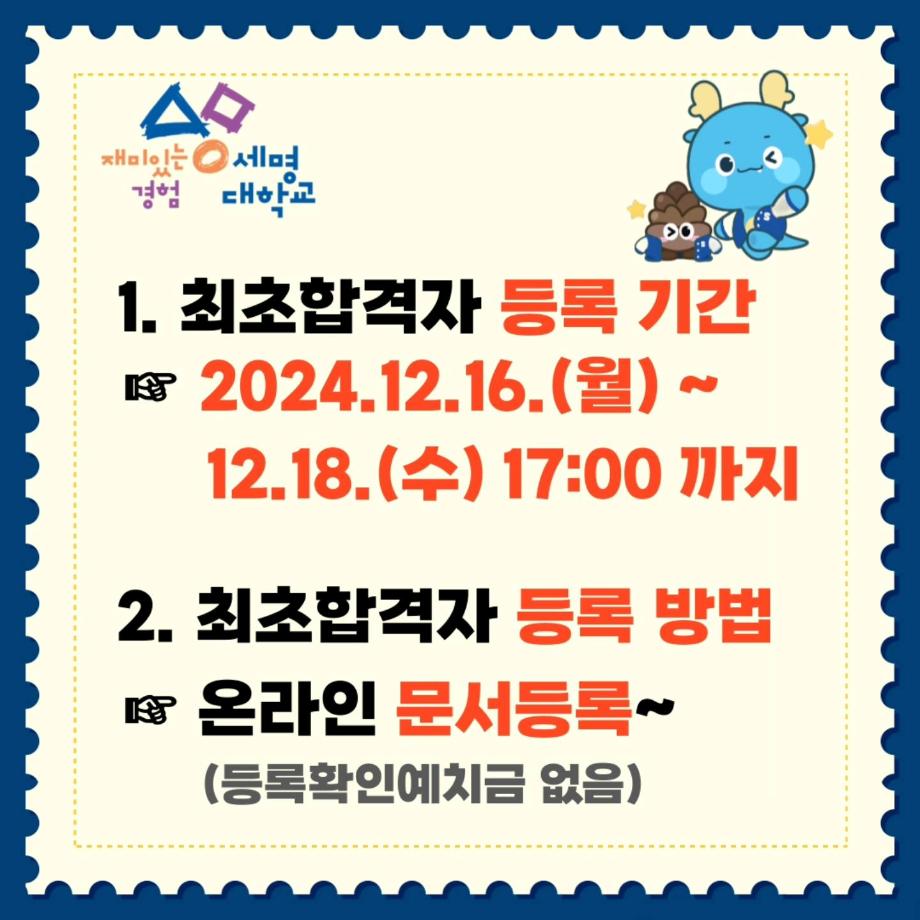2024.12.16 (월) ~ 2024.12.18 (수) 17:00 까지 모든 합격자는 정해진 기간 내에 등록을 완료하여야 합격이 유효합니다!