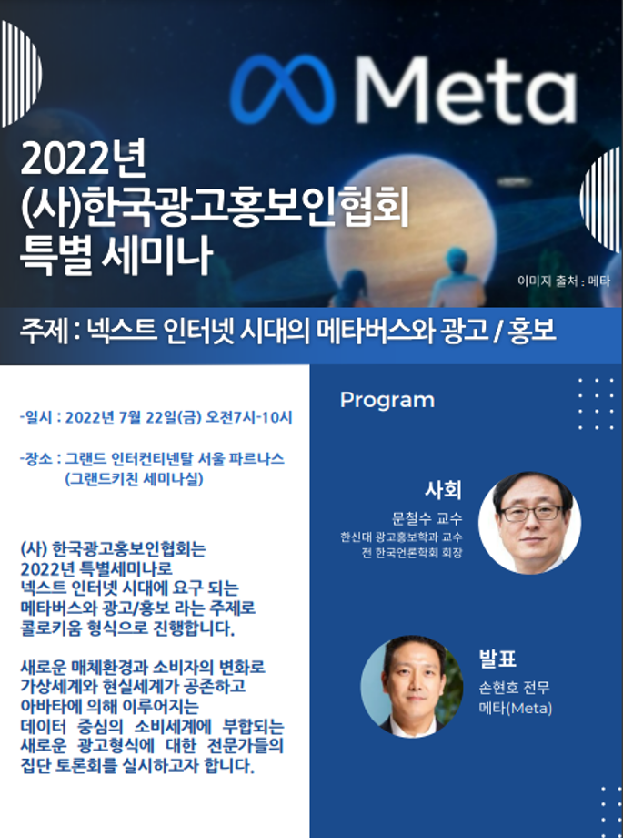 본문 시작 홈으로 매력적인 학과소개 매력적인 학과소개 흥미로운 교육과정 특별CC프로그램 We can 취업 따뜻한 커뮤니티 홈페이지가이드 지금 우리 광홍은 학과개요 학과연혁 교수소개 Wilco로 보는광고홍보학과 지금 우리 광홍은 지금 우리 광홍은 페이스북 트위터 프린트 특별 세미나_넥스트 인터넷 시대의 메타버스와광고/홍보 광고홍보학과 4465 2022-09-16 우리 광홍과 교수님들은 열공중! 특별 세미나 참석. - 주최 : (사) 한국광고홍보인협회 - 주제 : 넥스트 인터넷 시대의 메타버스와 광고/홍보 - 발표 : 손현호 전무님(Meta). Meta는 Facebook의 변경된 사명임 - 참석 : 서범석 교수님(주최자), 정연우 교수님(토론자), 문효진 교수님(토론자) * 행사를 주최한 (사)한국광고홍보인협회 회장님은 우리 광홍과 서범석 교수님이십니다. ^^ 목록 이전2022년도 광고홍보 취업 특강 시리즈 1탄 다음 대한민국 대학생 광고대회 대전/충청권 1위