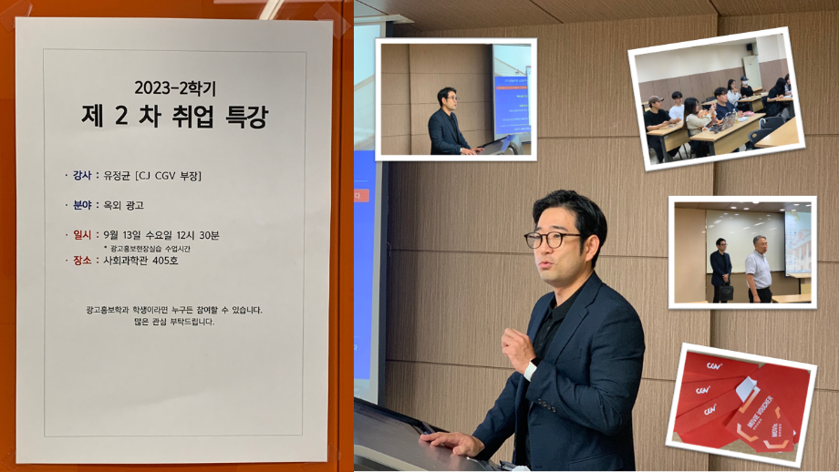 본문 시작 홈으로 매력적인 학과소개 매력적인 학과소개 흥미로운 교육과정 특별CC프로그램 We can 취업 따뜻한 커뮤니티 홈페이지가이드 지금 우리 광홍은 학과개요 학과연혁 교수소개 Wilco로 보는광고홍보학과 지금 우리 광홍은 지금 우리 광홍은 페이스북 트위터 프린트 [취업특강2탄] 광고홍보학과 5290 2023-09-14 23학년도 2학기 취업특강 제2탄 디지털OOH 'CJ CGV' _일시 : 2023년 9월 13일(수), 12:30~ _장소 : 사회과학관 405호 _내용 : 디지털OOH 산업계 현황 및 취업 노하우 _강사 : CJ CGV 유정균 부장 * 특강 후 1:1 취업 면담도 진행했습니다. 그리고 CGV 영화 티겟도 선물로 받았습니다. ^^ 옥외광고 분야 취업을 희망하는 학생은 추후라도 연락주시면 취업을 돕겠습니다. : ) 목록 이전[취업특강1탄] 다음 [애드아시아]국제광고행사참가