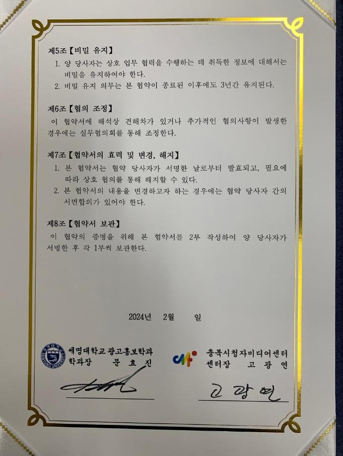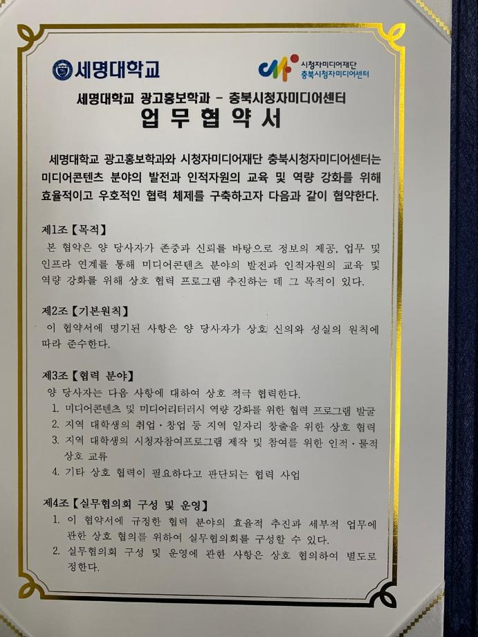 본문 시작 홈으로 매력적인 학과소개 매력적인 학과소개 흥미로운 교육과정 특별CC프로그램 We can 취업 따뜻한 커뮤니티 홈페이지가이드 지금 우리 광홍은 학과개요 학과연혁 교수소개 Wilco로 보는광고홍보학과 지금 우리 광홍은 지금 우리 광홍은 페이스북 트위터 프린트 [충북시청자미디어센터-세명대광고홍보학과] 업무협약 체결 광고홍보학과 3217 2024-07-17 <충북시청자미디어센터>와 <세명대 광고홍보학과> 업무협약식 개최 지역 미디어 콘텐츠 분야의 발전과 광고홍보 전문인력양성지원을 위해 큰 우군을 얻었습니다. ^^ '세명대 광고홍보학과'는 광고와 다양한 콘텐츠를 위한 [기획 맛집]을 넘어 [영상제작 맛집]을 향해 갑니다. 목록 이전[학과홍보]지금 우리 광홍은! 다음 [공동교육과정]단양/제천 소재 고교생 대상 광고/마케팅 특강