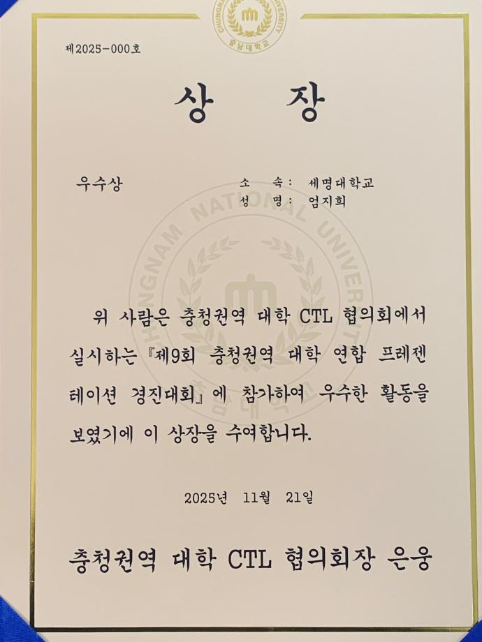 본문 시작 홈으로 매력적인 학과소개 매력적인 학과소개 흥미로운 교육과정 특별CC프로그램 We can 취업 따뜻한 커뮤니티 홈페이지가이드 지금 우리 광홍은 학과개요 학과연혁 교수소개 Wilco로 보는광고홍보학과 지금 우리 광홍은 지금 우리 광홍은 페이스북 트위터 프린트 25학번 엄지희_충청권역 대학 연합 프레젠테이션_우수상 광고홍보학과 999 2025-11-24 우리 광고홍보학과 25학번 엄지희 학생이 '제9회 충청권역 대학 연합 프레젠테이션 경진대회'에서 우수상을 수상했어요. ^^ 훌륭하고, 대견합니다. 진심으로 축하합니다. '기획 맛집' 세명대 광고홍보학과!!! '발표 맛집' 까지... 목록 이전2025-2학기 개강총회 다음 새해 복 많이 받으세요 : )