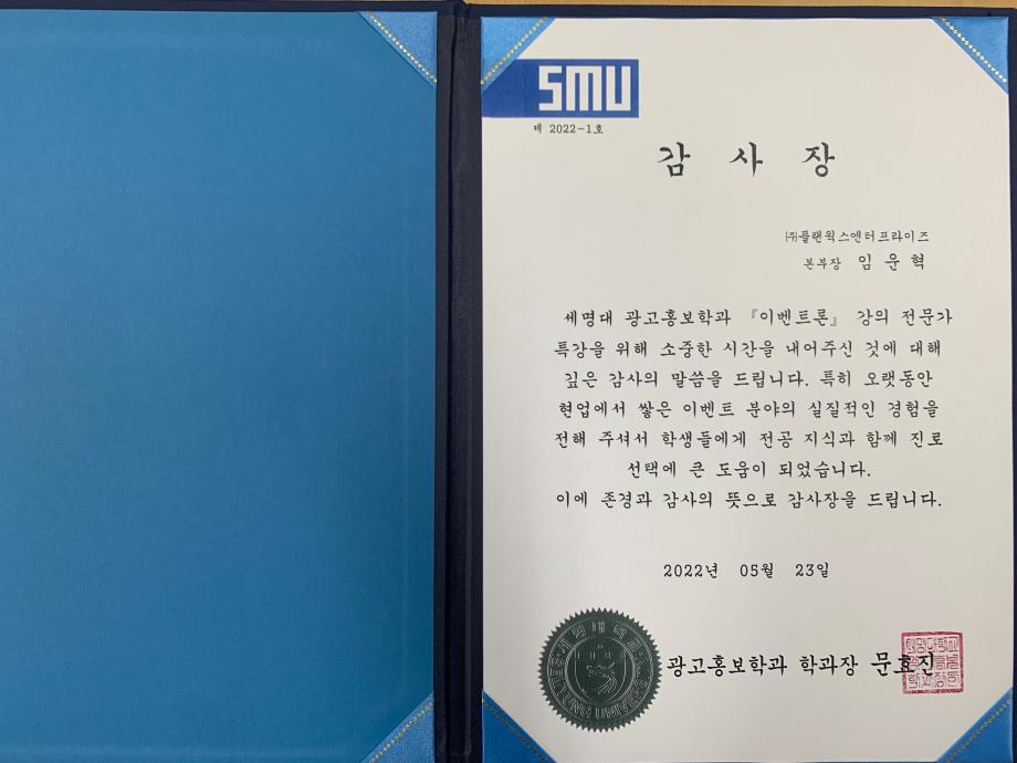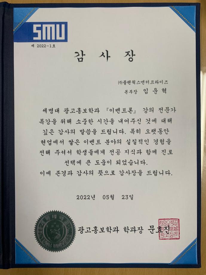 본문 시작 홈으로 매력적인 학과소개 매력적인 학과소개 흥미로운 교육과정 특별CC프로그램 We can 취업 따뜻한 커뮤니티 홈페이지가이드 지금 우리 광홍은 학과개요 학과연혁 교수소개 Wilco로 보는광고홍보학과 지금 우리 광홍은 지금 우리 광홍은 페이스북 트위터 프린트 [이벤트 제작 수업 플랜웍스엔터 임운혁 본부장님 특강] 광고홍보학과 2501 2022-05-23 5월 23일(월), 이벤트 제작 수업에 플랜웍스엔터 임운혁 본부장님의 특강이 진행되었습니다! 오랫동안 현업에서 쌓은 이벤트 실무능력과 전공 지식을 기반으로 이벤트 업계의 현황, 제안서 작성법 등을 광고홍보학과 학생들에게 가르쳐주셨습니다. 이에 존경과 감사의 뜻으로 감사패를 만들어 전달하였습니다. 학생들에게 전공 지식습득과 진로 선택에 도움이 되어주신 임운혁 본부장님께 감사인사 드립니다👍👏 목록 이전[🎊2022 광고홍보학과 광광체전🎊] 다음 [ 2022 사회과학대학 학부(과) 홍보 UCC / Short Form 공모전 수상🏆]