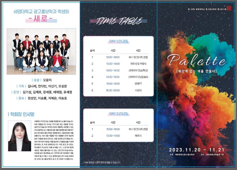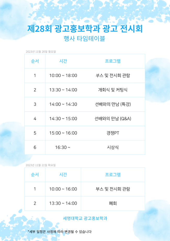 본문 시작 홈으로 매력적인 학과소개 매력적인 학과소개 흥미로운 교육과정 특별CC프로그램 We can 취업 따뜻한 커뮤니티 홈페이지가이드 지금 우리 광홍은 학과개요 학과연혁 교수소개 Wilco로 보는광고홍보학과 지금 우리 광홍은 지금 우리 광홍은 페이스북 트위터 프린트 [전시회]제28회 광고전시회 개최 광고홍보학과 3325 2023-11-15 28년째를 맞이하는 광고홍보학과의 시그니처 프로그램 '광고전시회'가 개최됩니다. _일시 : 2023년 11월 20일 ~ 21일, 2일간 _장소 : 세명대학교 학술관 1층 일대 _주제 : 팔레트 : 세상에 없는 색을 만들다 _프로그램 : 경쟁PT, 공모전 작품, 산학협력 프로그램 작품, 이벤트, 포토존 등 많은 참여 바랍니다. 목록 이전[애드아시아]국제광고행사참가 다음 [학과홍보]지금 우리 광홍은!