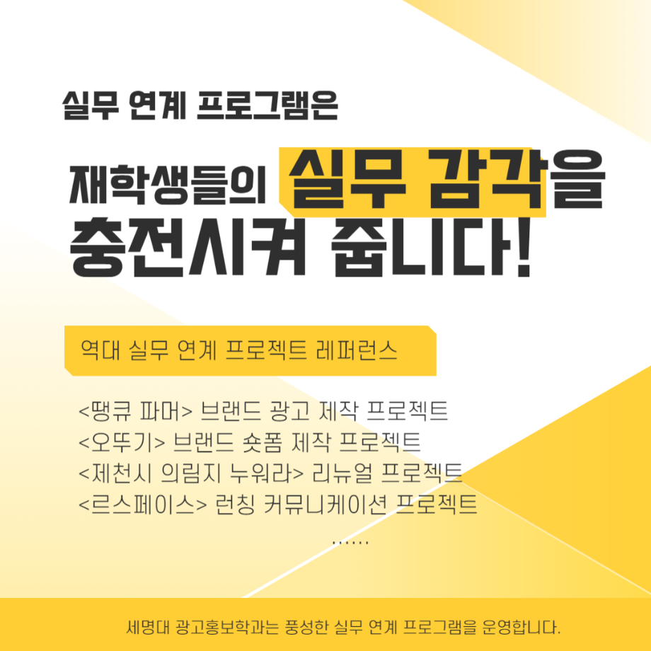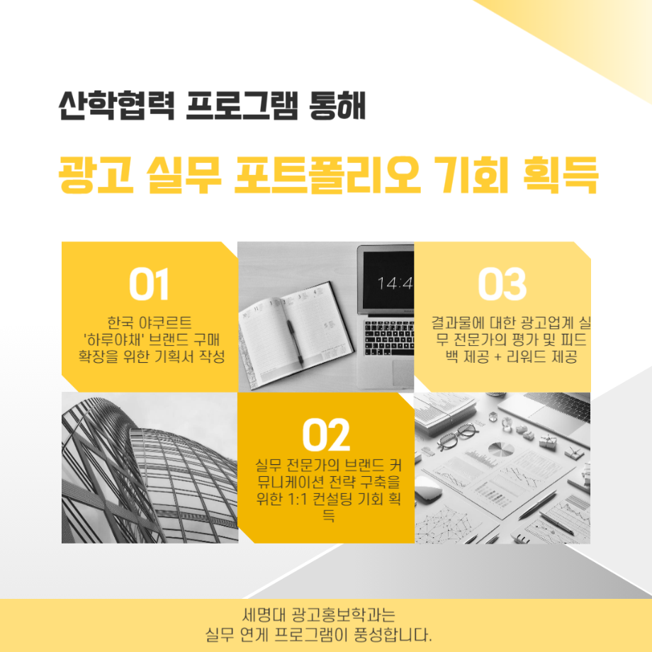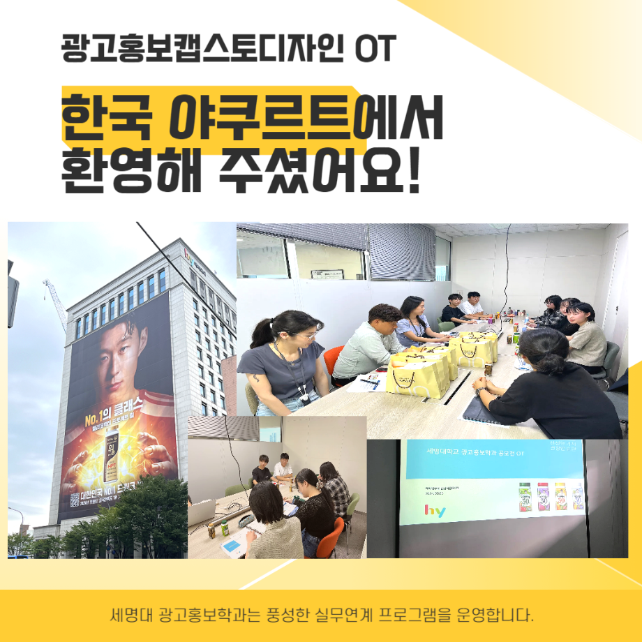 본문 시작 홈으로 매력적인 학과소개 매력적인 학과소개 흥미로운 교육과정 특별CC프로그램 We can 취업 따뜻한 커뮤니티 홈페이지가이드 지금 우리 광홍은 학과개요 학과연혁 교수소개 Wilco로 보는광고홍보학과 지금 우리 광홍은 지금 우리 광홍은 페이스북 트위터 프린트 [광고홍보캡스톤디자인]한국야쿠르트 <하루야채> 브랜드 광고홍보학과 3394 2024-09-10 2024년도 2학기 광고홍보캡스톤디자인 수업 _주 제 : 한국야쿠르트 <하루야채> 브랜드 구매 확장 전략 _담당교수 : 김신엽 교수님 _일 정 : 2024년도 2학기 성공적인 결과물을 기대합니다. : ) 세명대 광고홍보학과는 기획 맛집을 지향합니다~. 목록 이전[공동교육과정]단양/제천 소재 고교생 대상 광고/마케팅 특강 다음 [수상]2024코삭챌린저상