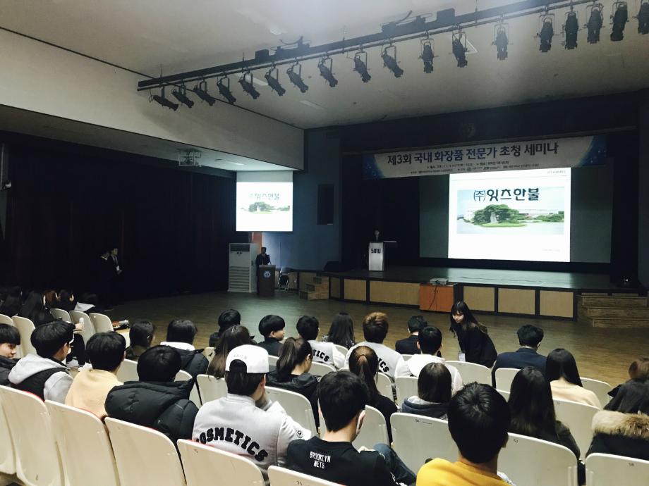 지난 2017년 11월 15일 공학관 5층 종합영상센터에서 화장품뷰티생명공학부에서 주관한 충북 화장품산업 활성화를 위한 <제3회 국내 화장품 전문가 초청 세미나>를 개최하였다. 이날 화장품뷰티생명공학부의 교수진과 100여명의 학부생 및 대학원생들이 참석한 가운데 열띤 강연을 하였다.