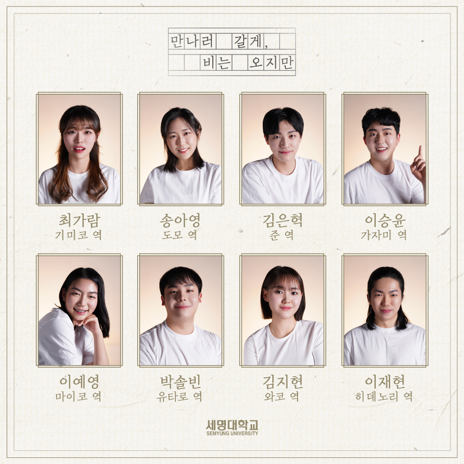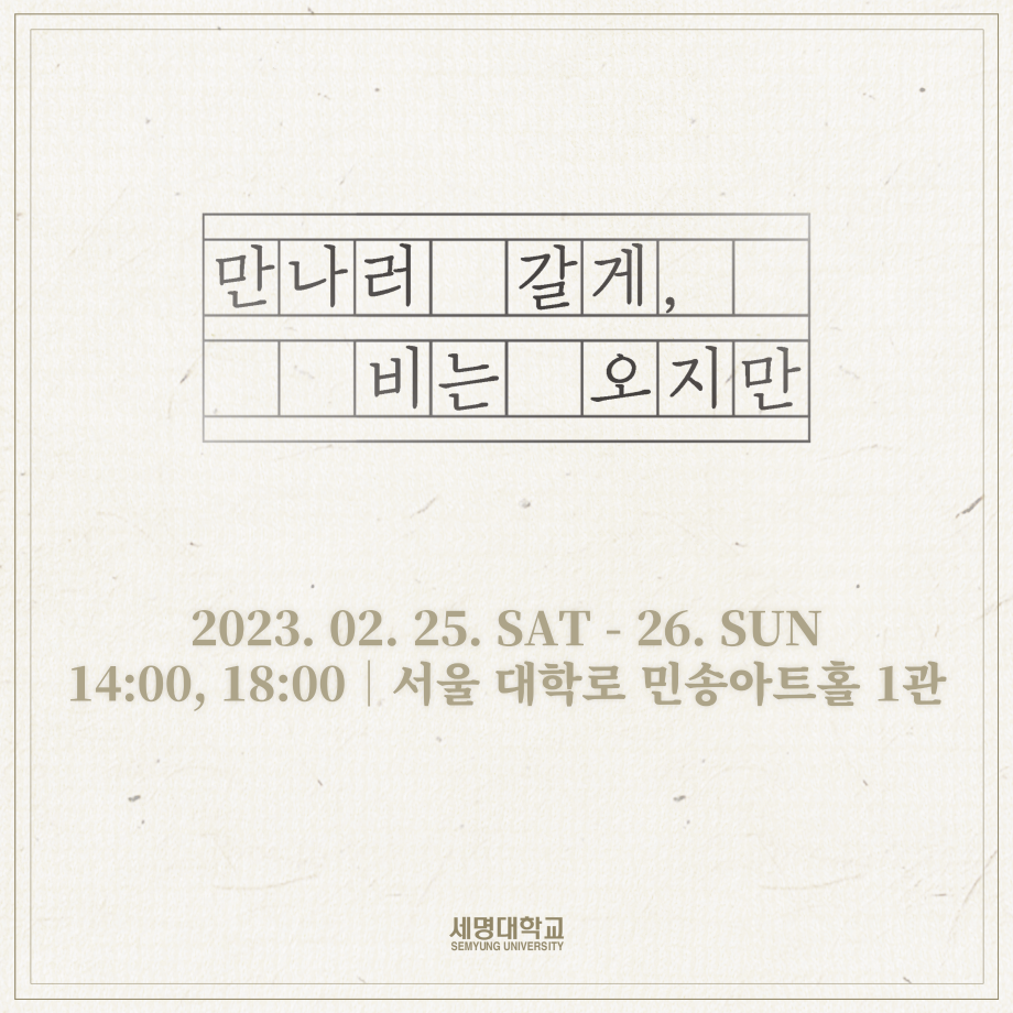 본문 시작 홈으로 학과과정 학과소개 입학정보 교수소개 학과과정 커뮤니티 공연예매 안내 홈페이지가이드 비교과프로그램 교육과정 전공교육 체계도 비교과프로그램 MOU 체결 하계, 동계 프로젝트 하계, 동계 프로젝트 연극놀이 지도사 양성 교육 현장실습 프로그램 액팅플러스 하계, 동계 프로젝트 페이스북 트위터 프린트 ☂ ‘동계 프로젝트’ <만나러 갈게, 비는 오지만> 캐스팅 보드☂ 연기예술학과 2551 2023-02-11 | 📸 | #만나러갈게,비는오지만 제 90회 세명대학교 연기예술학과 정기공연 ‘동계 프로젝트’ <만나러 갈게, 비는 오지만> 캐스팅 보드☂ - 𝟮𝟬𝟮𝟯. 𝟬𝟮. 𝟮𝟱. 𝗦𝗔𝗧 - 𝟮𝟬𝟮𝟯. 𝟬𝟮. 𝟮𝟲. 𝗦𝗨𝗡 서울 대학로 세명대학교 민송아트홀 1관 목록 이전🐑'동계 프로젝트' < 보이체크 > 프로필 스틸컷🐑 다음 ☂‘동계 프로젝트’ <만나러 갈게, 비는 오지만> QR 코드☂ 만족도조사 만족도 조사 이 페이지에서 제공하는 정보에 대하여 만족하시나요? 매우만족 만족 보통 불만족 매우불만족