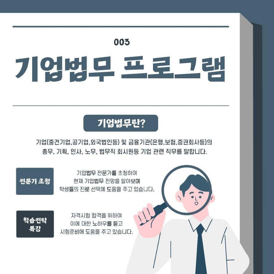 본문 시작 홈으로 학과과정 학과안내 교수소개 학과과정 커뮤니티 홈페이지가이드 비교과프로그램 교육과정 전공교육 체계도 대학원 법학과 비교과프로그램 학사일정 기업법무 지원프로그램 공공법무 지원프로그램 기업법무 지원프로그램 기업법무 지원프로그램 페이스북 트위터 프린트 비교과 프로그램 알아보기 '기업법무' 법학과 405 2025-09-04 목록 이전기업법무 지원프로그램이란??? 이전2025.05.21 항공운송법 관련 특강 담당부서 : 법학과 담당자 : - 연락처 : 043-649-1764 최종수정일 : 2024-10-26 만족도조사 만족도 조사 이 페이지에서 제공하는 정보에 대하여 만족하시나요? 매우만족 만족 보통 불만족 매우불만족