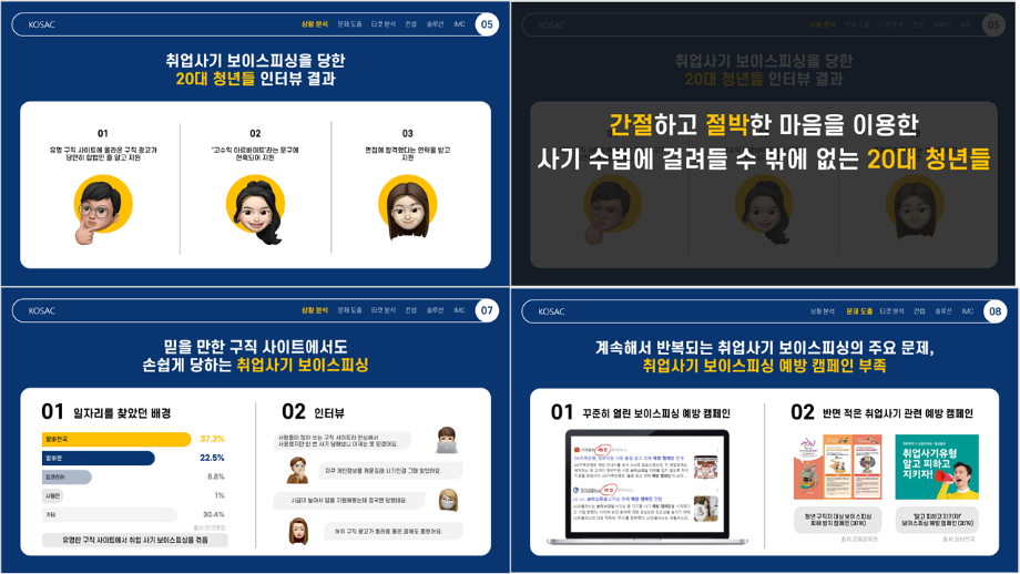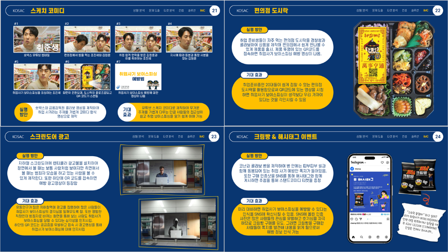 본문 시작 홈으로 흥미로운 교육과정 매력적인 학과소개 흥미로운 교육과정 특별CC프로그램 We can 취업 따뜻한 커뮤니티 홈페이지가이드 작품 갤러리 교육일정 교육과정 전공교육 체계도 졸업후진로 작품 갤러리 작품 갤러리 페이스북 트위터 프린트 [2024KOSAC]대한민국대학생광고대회 출품작 광고홍보학과 4147 2024-09-11 2024년도 대한민국 대학생 광고대회 출품작 주제 : 보이스 피싱 예방 캠페인 제안서 세명대 광고홍보학과는 '기획맛집'을 지향하고, 이를 인정받고 있습니다 : ) 목록 이전[2024KOSAC]대한민국대학생광고대회 출품작 다음 [평판관리]코레일 평판관리커뮤니케이션 기획서